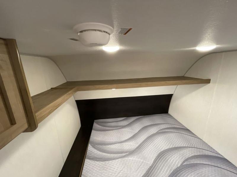 The whole family can sleep comfortably in this travel trailer! It has a set of bunk beds for the kids to sleep on, and you can sleep comfortably on the front queen bed with overhead cabinets and a shelf. The chef will enjoy preparing their best home cooked meals with the high output cooktop, and you can dine at the booth dinette. And the private bath onboard means you won't have to leave your camper in the middle of the night!