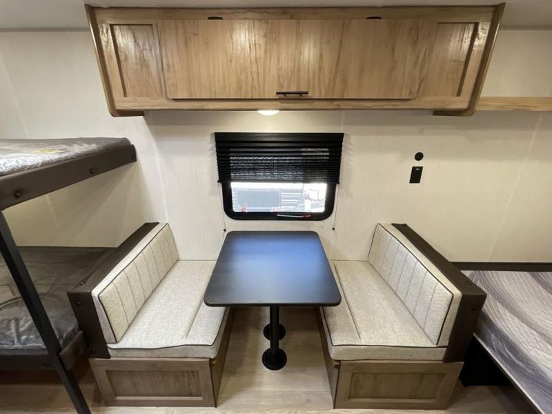 The whole family can sleep comfortably in this travel trailer! It has a set of bunk beds for the kids to sleep on, and you can sleep comfortably on the front queen bed with overhead cabinets and a shelf. The chef will enjoy preparing their best home cooked meals with the high output cooktop, and you can dine at the booth dinette. And the private bath onboard means you won't have to leave your camper in the middle of the night!