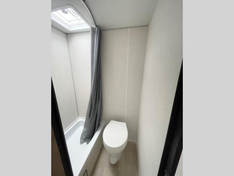 The whole family can sleep comfortably in this travel trailer! It has a set of bunk beds for the kids to sleep on, and you can sleep comfortably on the front queen bed with overhead cabinets and a shelf. The chef will enjoy preparing their best home cooked meals with the high output cooktop, and you can dine at the booth dinette. And the private bath onboard means you won't have to leave your camper in the middle of the night!