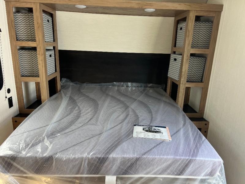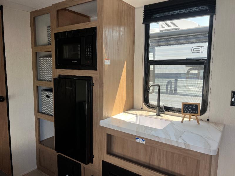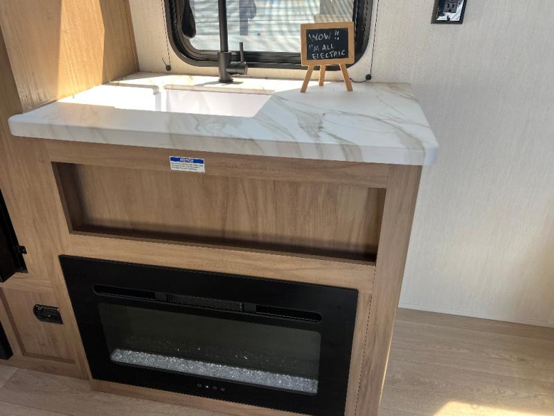 You will love weekends at the lake in this all-electric travel trailer that can sleep three each night! The front queen bed includes dual storage drawers on either side of the bed to keep your clothes tidy, and there is a shelf above the bed to keep books! After you've made breakfast, you can dine at the booth dinette and cleanup will be easy with the rectangle sink. A spacious full rear bath lets you clean up each day, and there is a closet with shelves to keep towels and toiletries. You'll find additional storage in the pantry with shelves next to the refrigerator and outside storage for camp chairs, tools, and more!