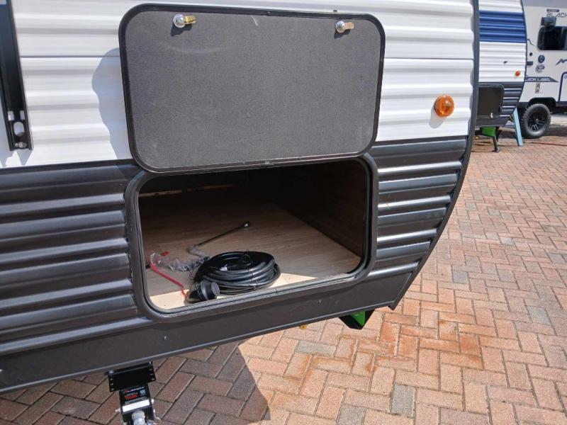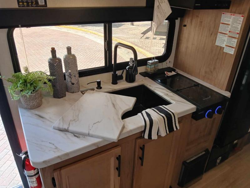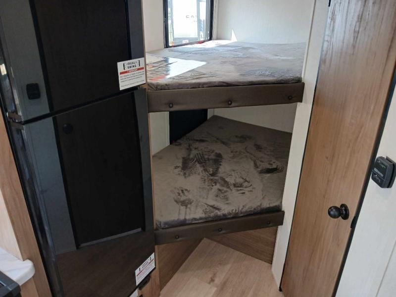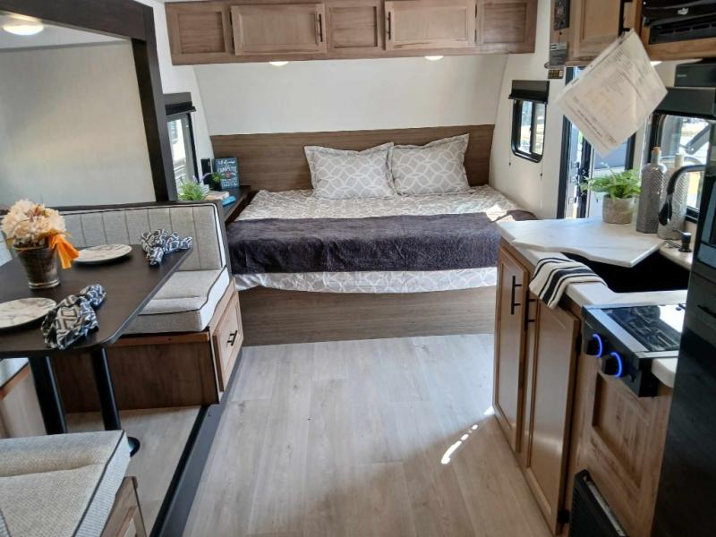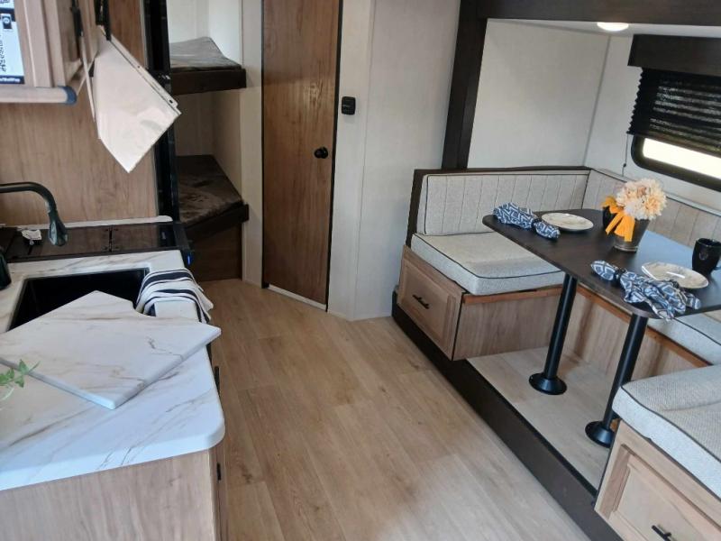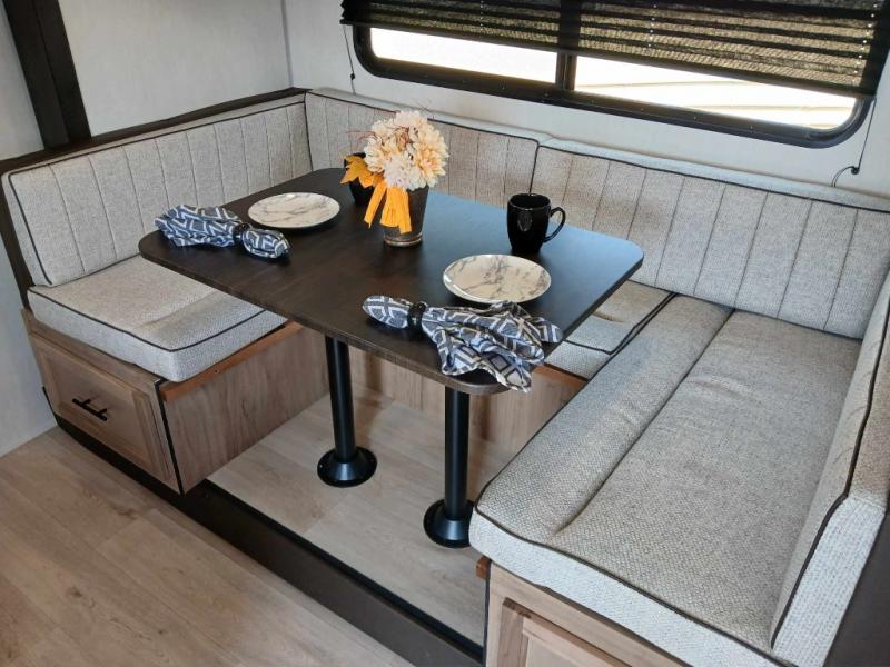 This family travel trailer is ready to head to the campground whenever you are! The kiddos can sleep on the set of double-size bed bunks and you can sleep on the front queen bed, plus the U-shaped dinette slide can also transform into an extra sleeping space when you aren't using it to enjoy a meal prepared with the high output cooktop. You can also prepare your delicious meals at the outside mini kitchen and stay protected by the power awning. The exterior not only has outside storage and an outside TV mount, but also features an outside storage plus door for access to the storage space underneath the bottom bunk bed. The rear corner bath allows everyone to stay clean and refreshed while you camp.