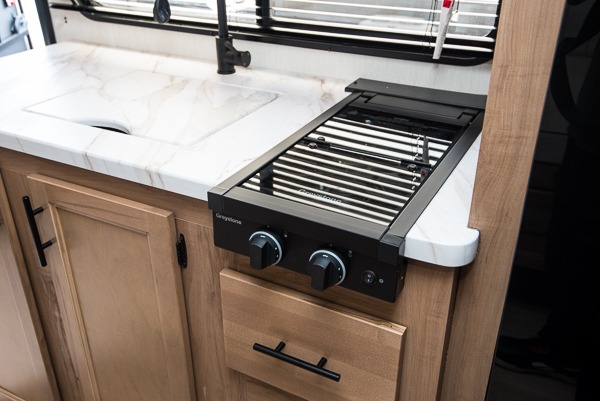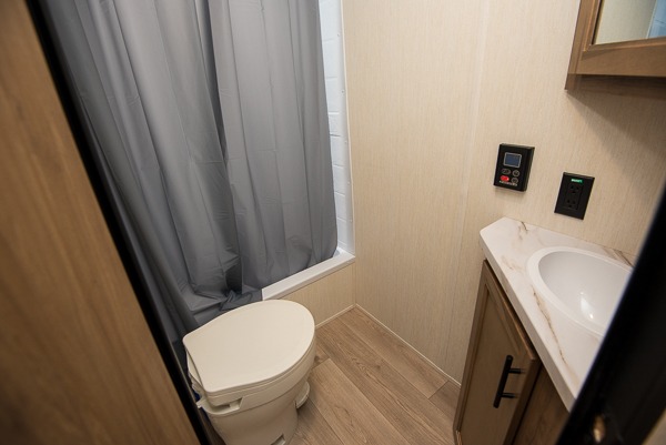 This family travel trailer is ready to head to the campground whenever you are! The kiddos can sleep on the set of double-size bed bunks and you can sleep on the front queen bed, plus the U-shaped dinette slide can also transform into an extra sleeping space when you aren't using it to enjoy a meal prepared with the high output cooktop. You can also prepare your delicious meals at the outside mini kitchen and stay protected by the power awning. The exterior not only has outside storage and an outside TV mount, but also features an outside storage plus door for access to the storage space underneath the bottom bunk bed. The rear corner bath allows everyone to stay clean and refreshed while you camp.