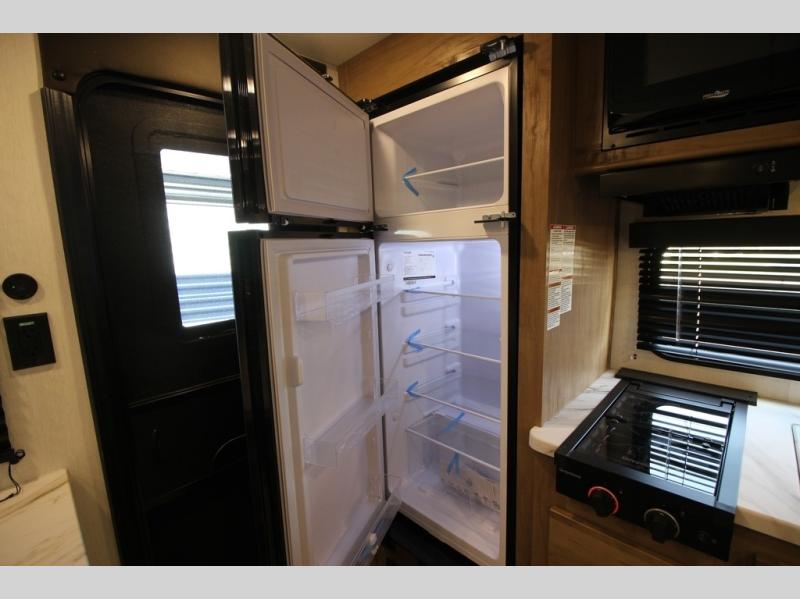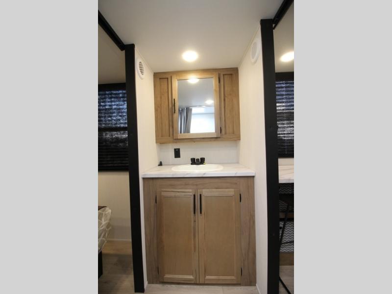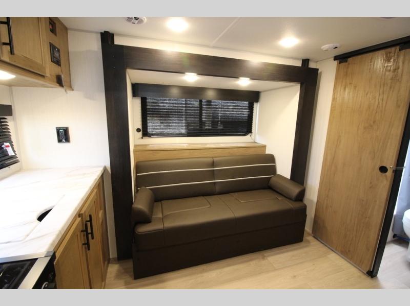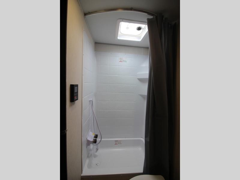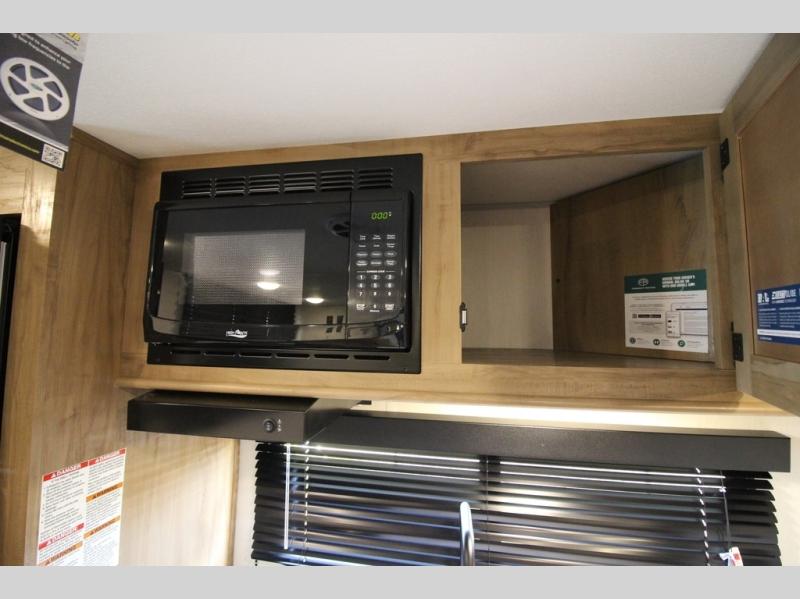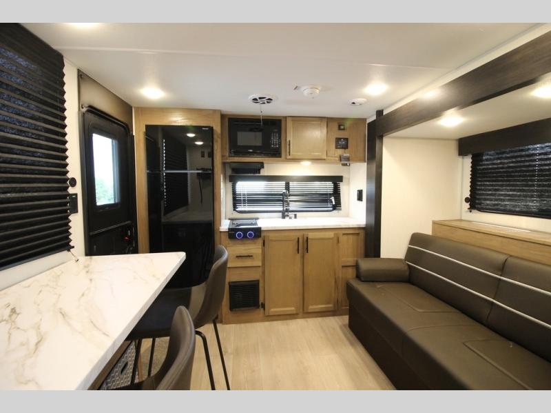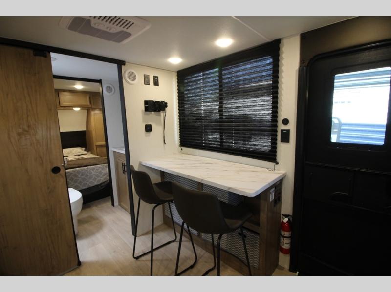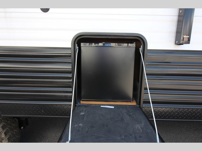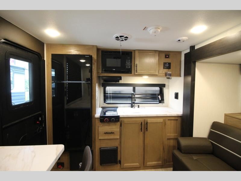 Convenient camping is found with this lightweight travel trailer! Once you arrive at your destination, put out the power awning, then make lunch on the exterior mini kitchen. Inside, you can dine at the bar top with stools, freshen up in the tub/shower, and sleep soundly on the queen bed in the master bedroom. There is also a sofa slide out to provide additional seating, sleeping, and interior space! And you're sure to find plenty of storage spaces both inside and outside, including a rear storage rack!