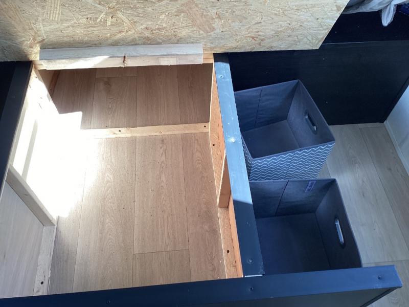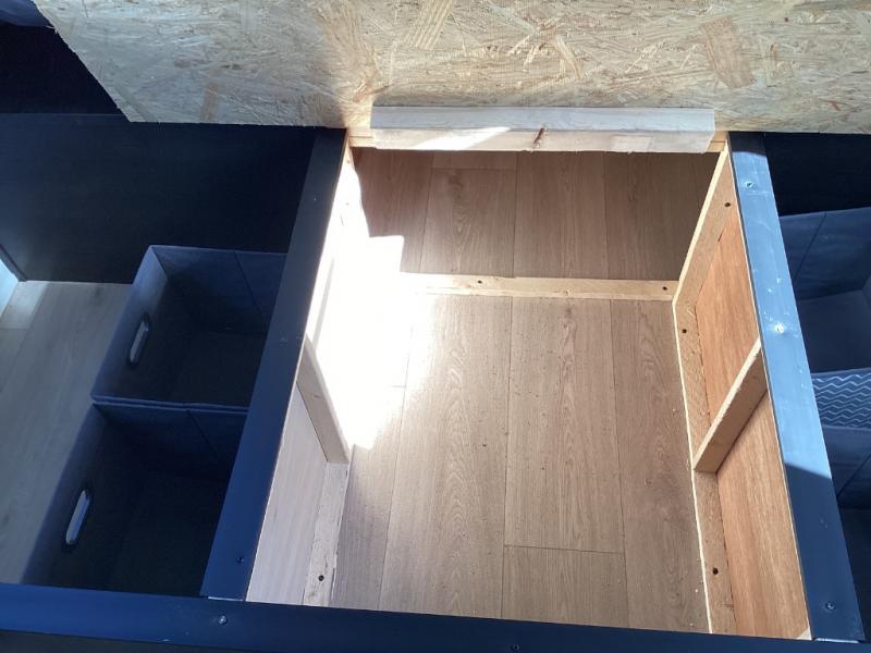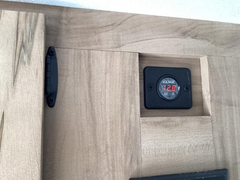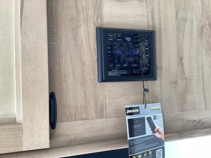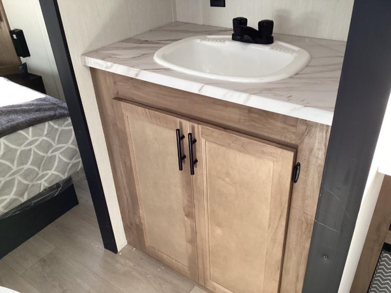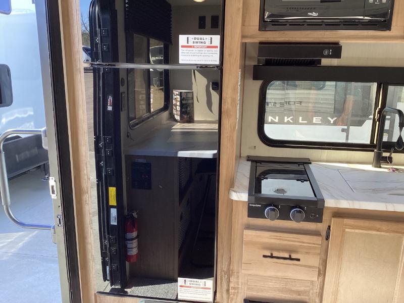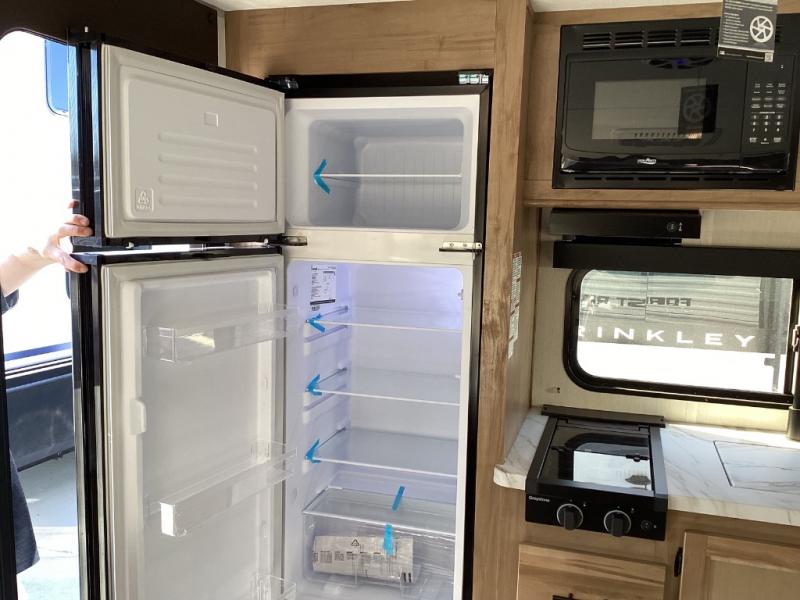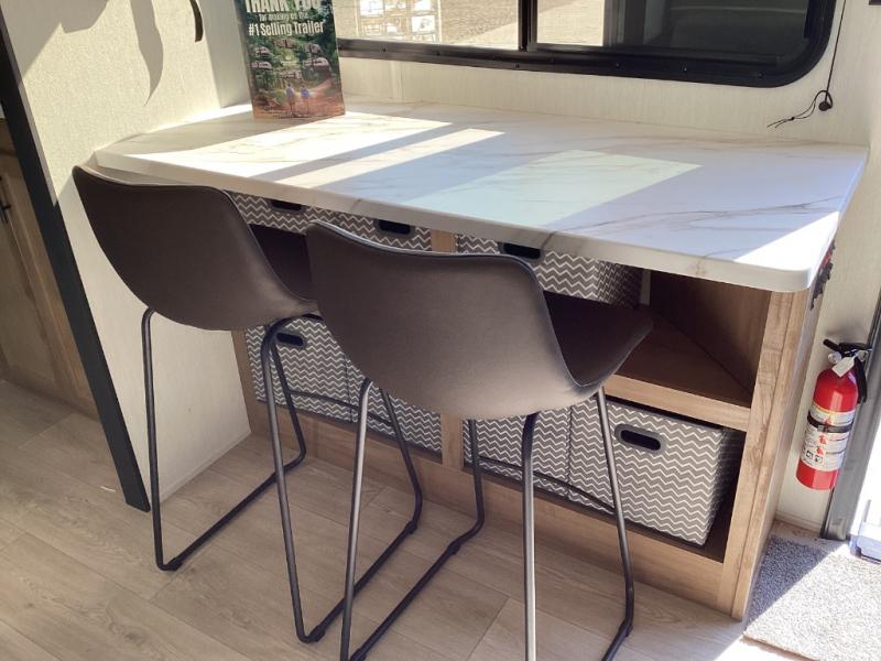 Includes 2-burner cooktop, microwave, 12V fridge, deep sink, and seamless countertops. -