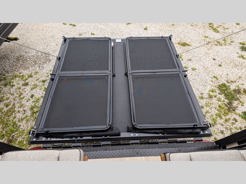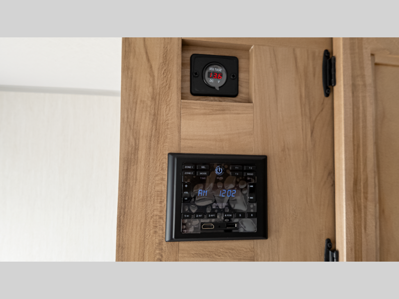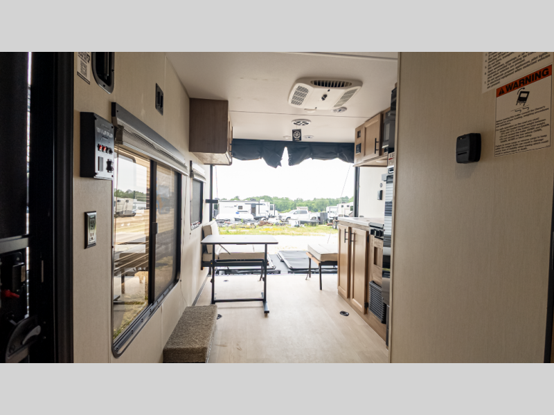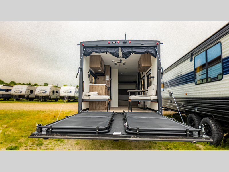 - Ramp door patio + full-length 12' power awning with speakers & TV prep