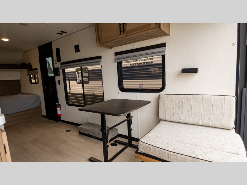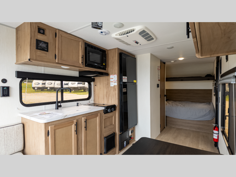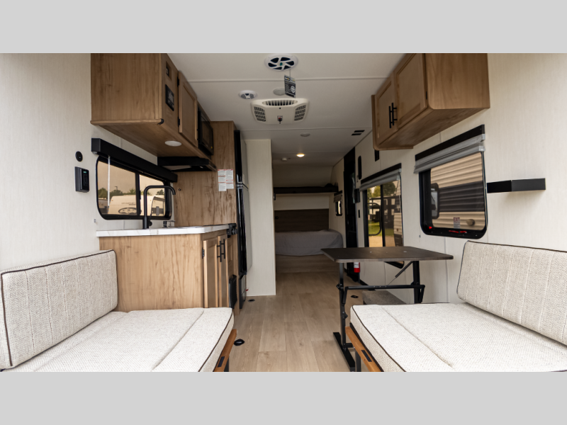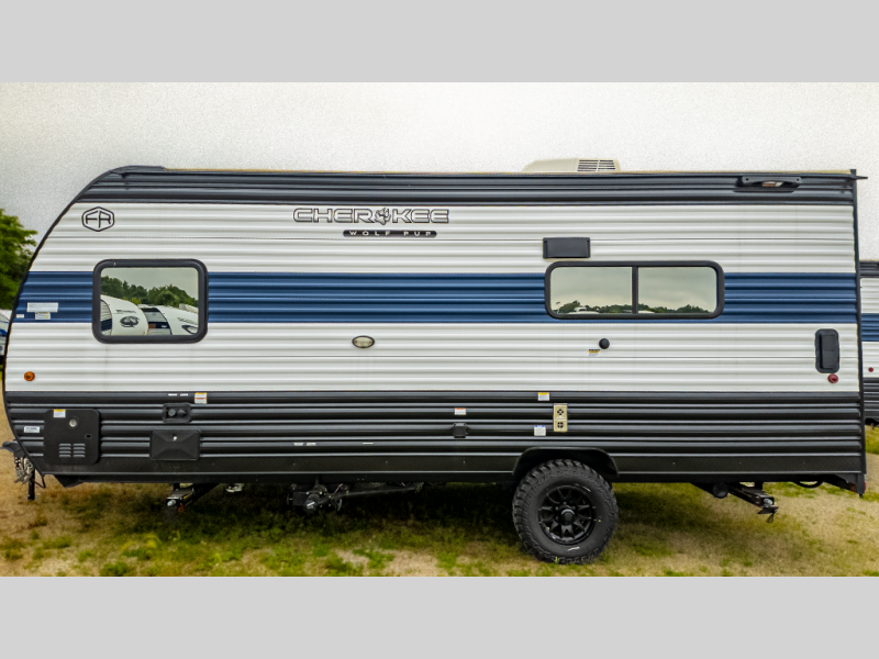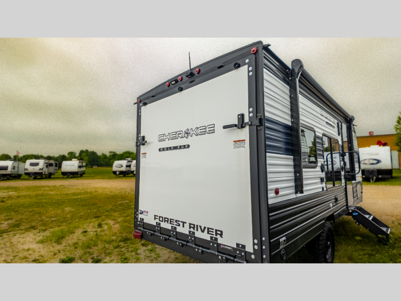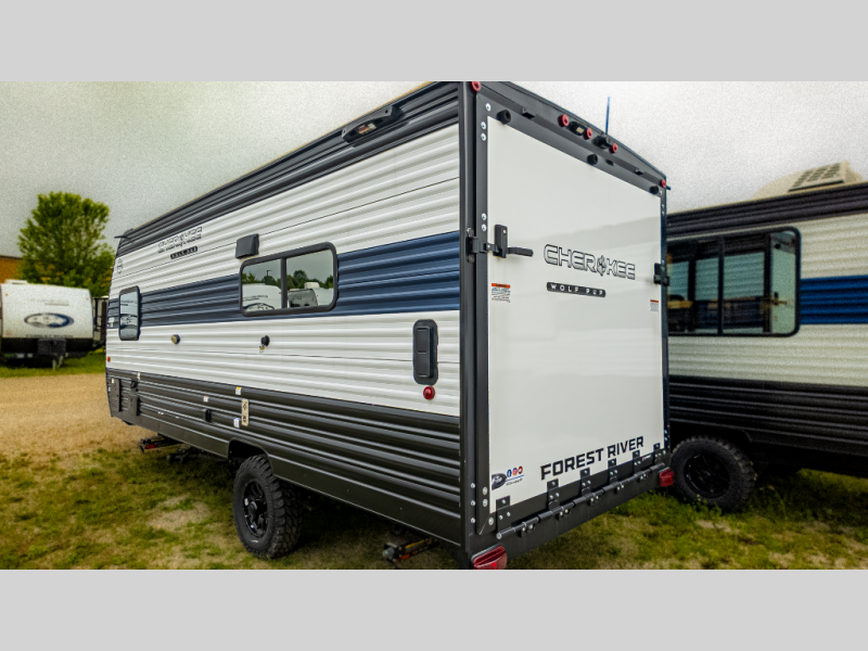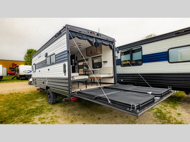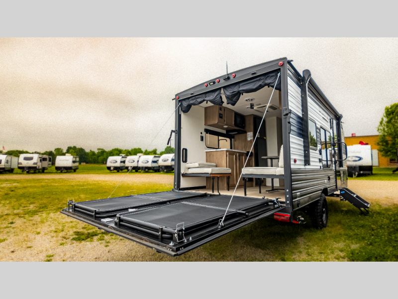 A: The 22'8 Wolf Pup 18RJBW delivers a chef-grade kitchen, queen bed with overhead bunk, functional bath—and dual patio/ramp doors that double your outdoor hangout space.