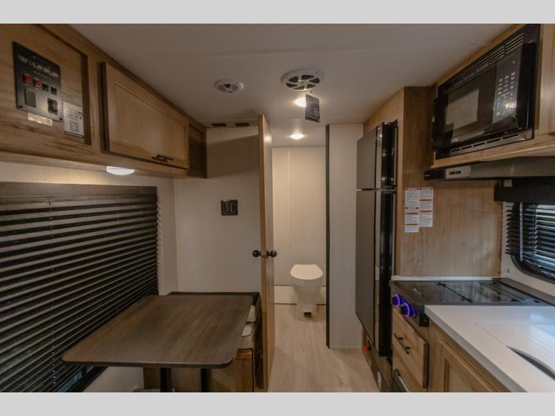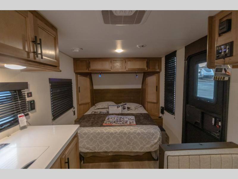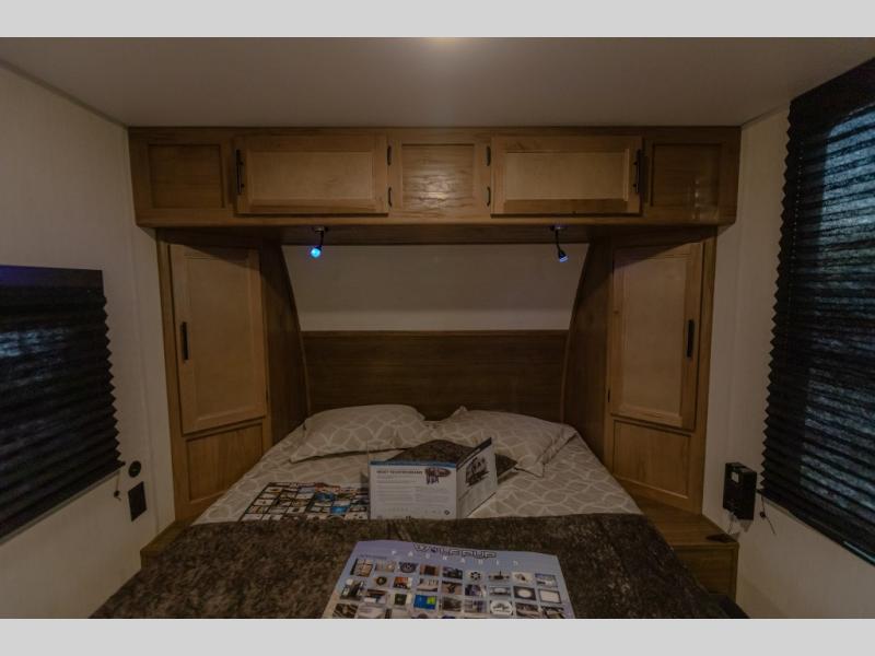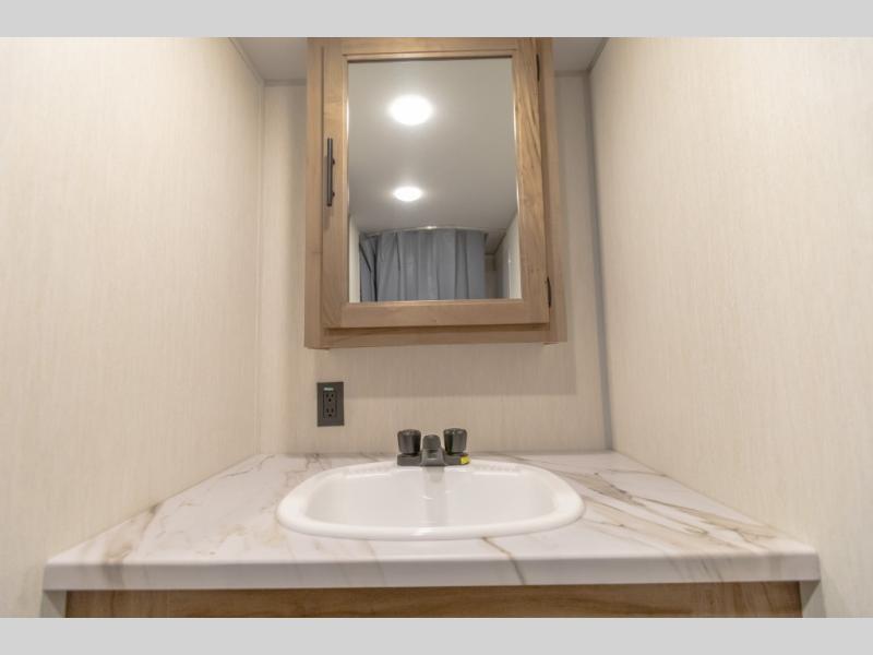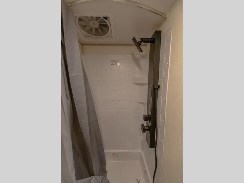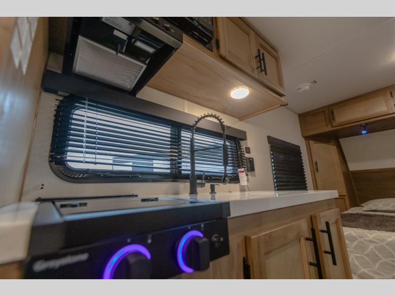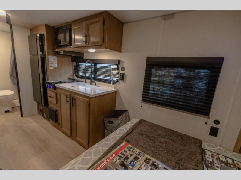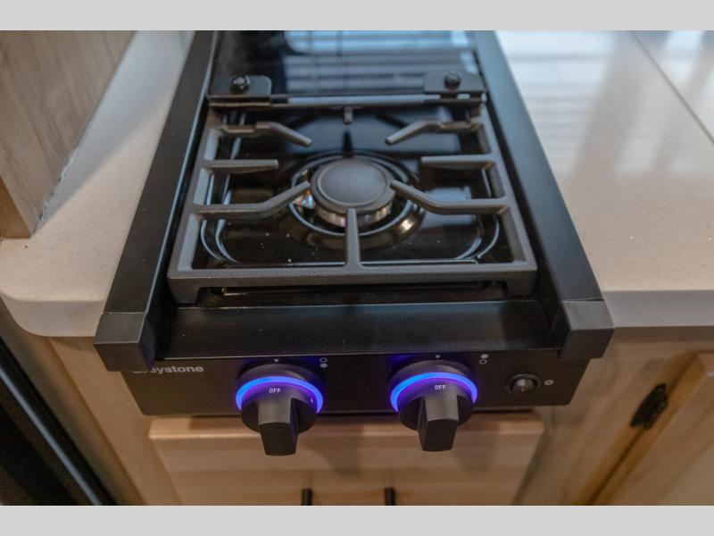You will love camping in this travel trailer with your own queen bed up front! Freshen up each morning in the full rear bathroom with the tub/shower, toilet, and sink. Fill your bellies with the perishables stored in the 12V high efficiency refrigerator and cook them on the high output cooktop. You could even prepare a meal while breathing in some fresh air at the outside mini kitchen while staying protected by the 12' power awning. Easily store all of your outdoor gear in the outside storage area too!
