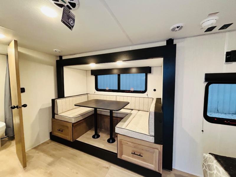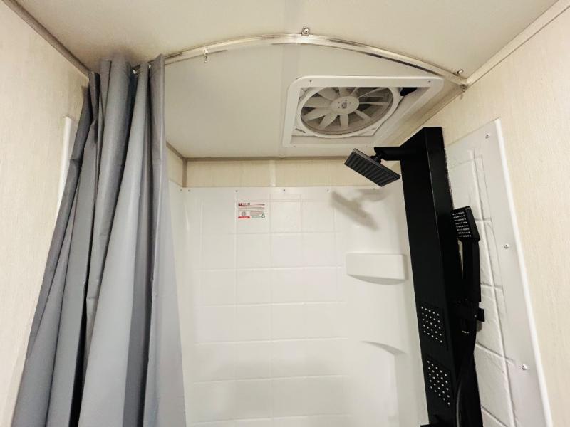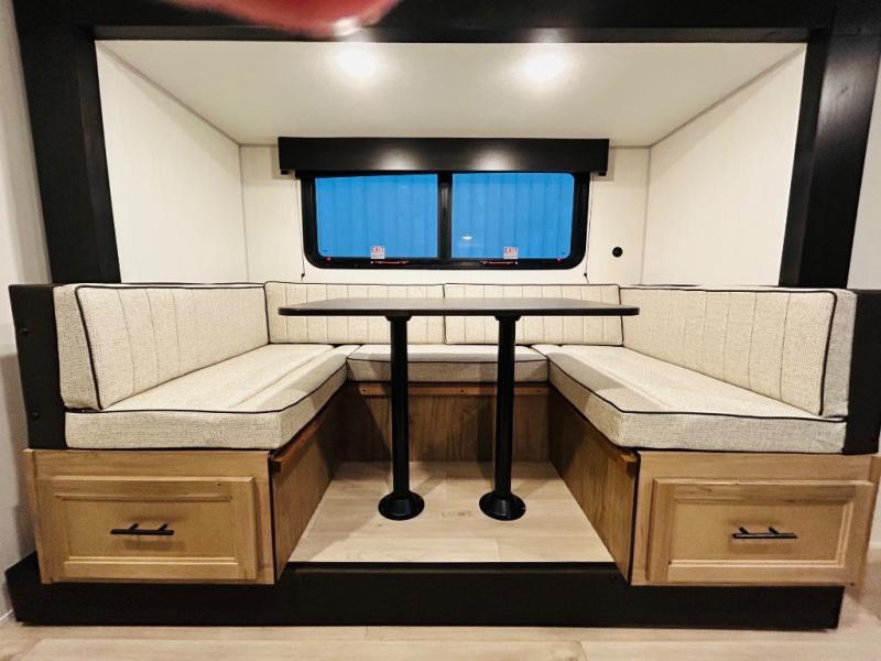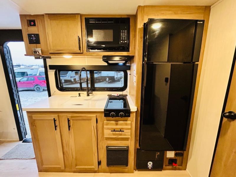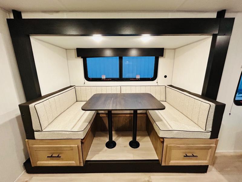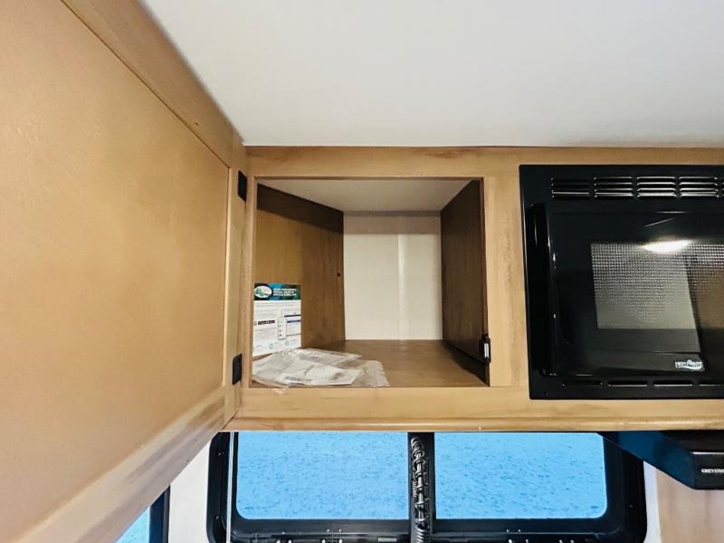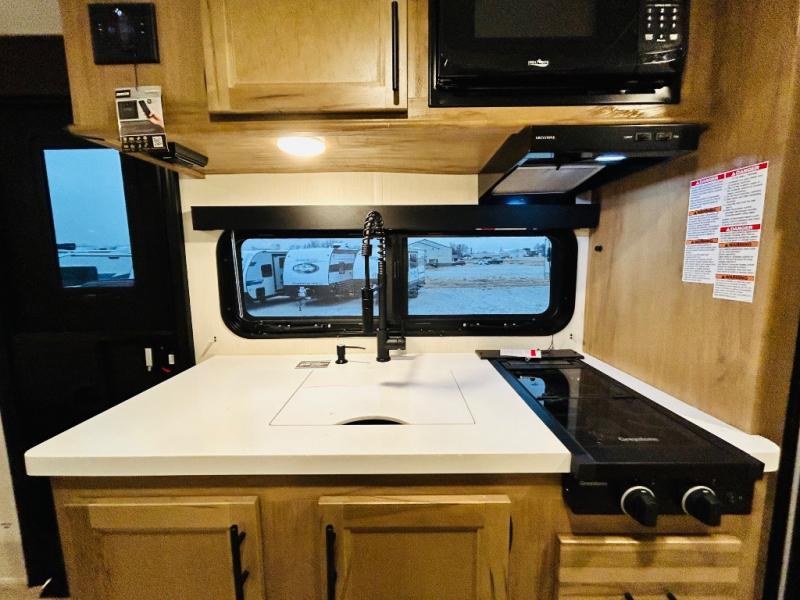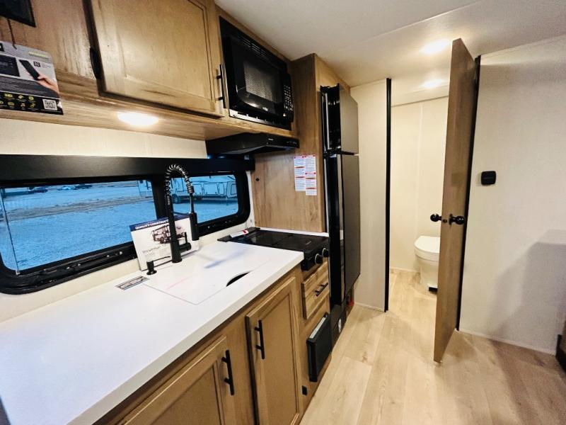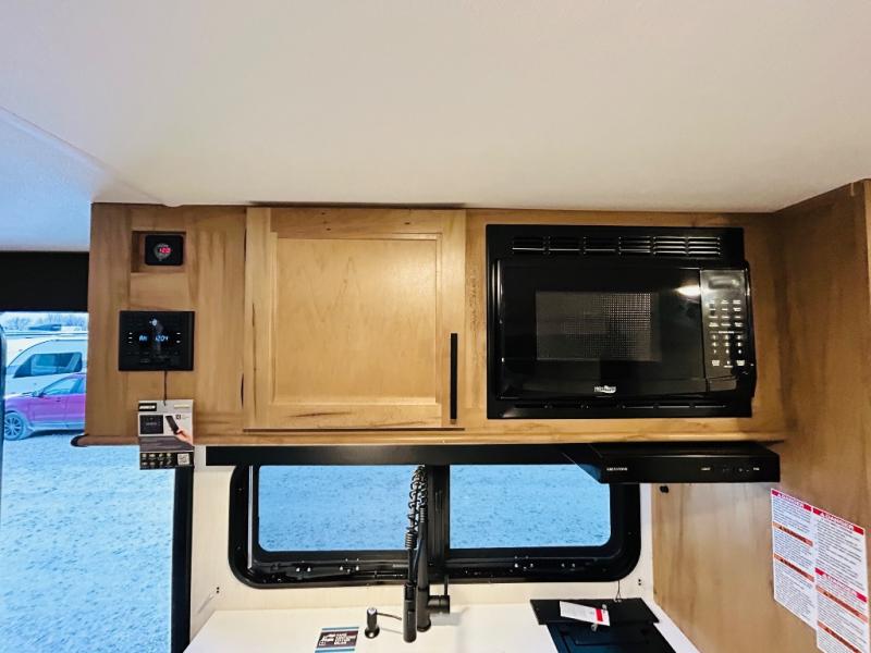 This travel trailer is perfect for a small family or group to enjoy since there is a front queen bed for you and a U-shaped dinette for guests. The kitchen provides a microwave oven, round single bowl sink, a range for cooking, and a 12V high efficiency refrigerator to keep all of your perishables fresh. The rear bath features a tub/shower, toilet, and vanity with a sink, plus a medicine cabinet to keep things tidy.