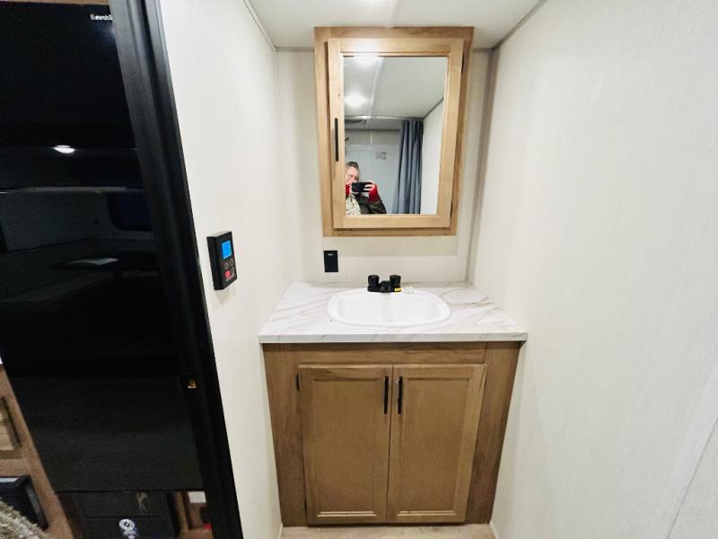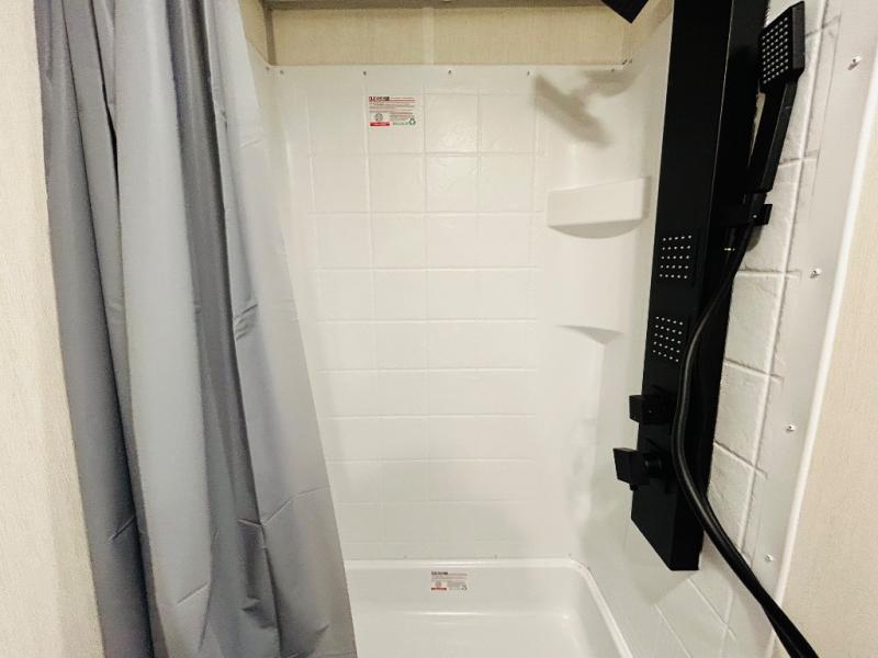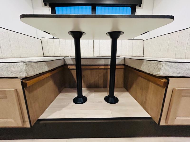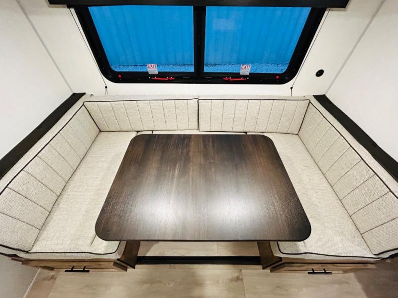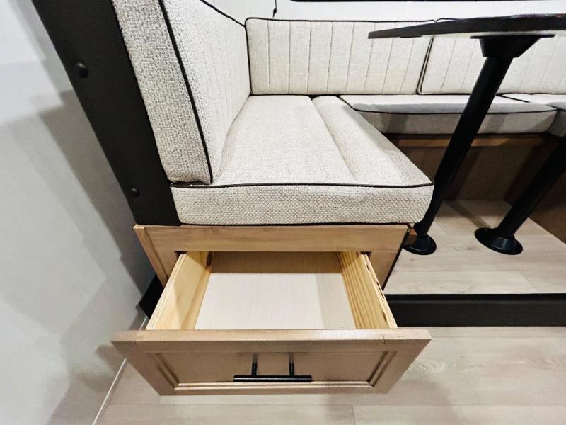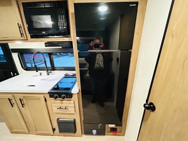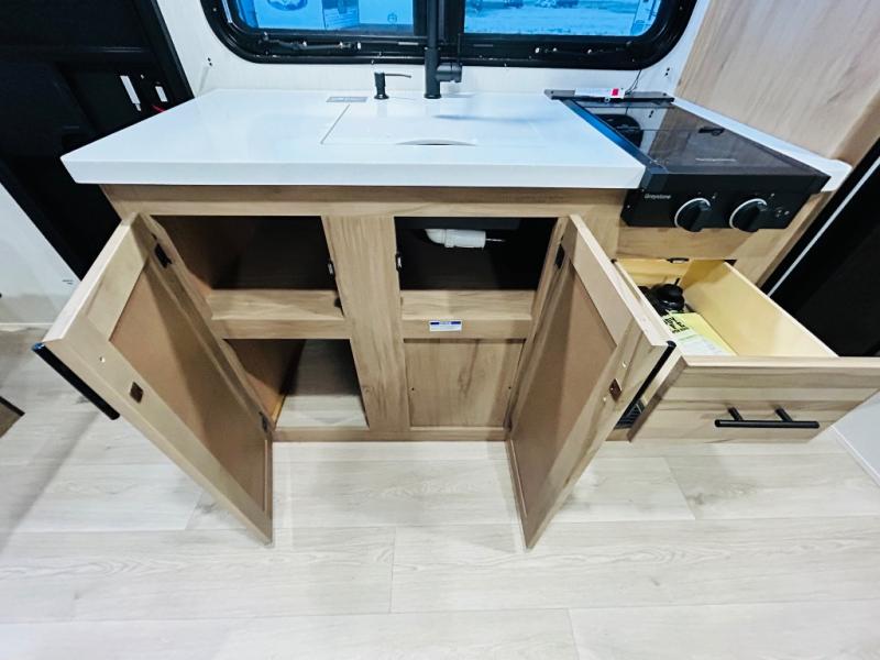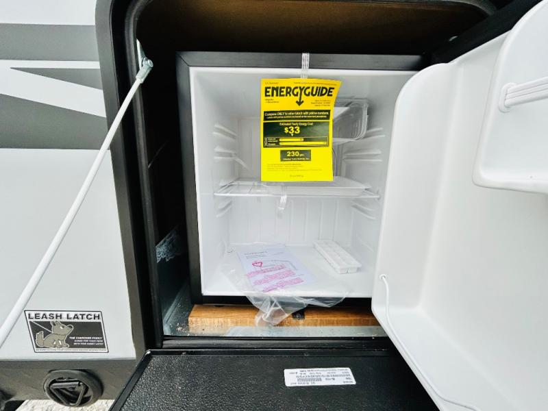 This travel trailer is perfect for a small family or group to enjoy since there is a front queen bed for you and a U-shaped dinette for guests. The kitchen provides a microwave oven, round single bowl sink, a range for cooking, and a 12V high efficiency refrigerator to keep all of your perishables fresh. The rear bath features a tub/shower, toilet, and vanity with a sink, plus a medicine cabinet to keep things tidy.