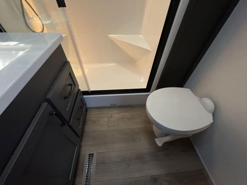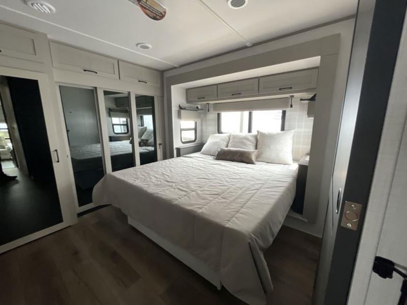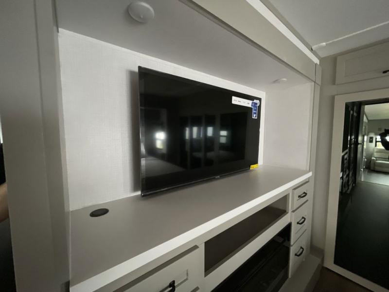 It won't be hard to fall in love with this fifth wheel that can sleep four each night! There are dual opposing slides in the bedroom and in the combined kitchen and living area for maximum space to relax! You will love evenings spent in the rear living area on the theater seat across from the 50" Smart TV, and there is a sofa sleeper to let guests stay over. A four burner gas cooktop and residential style stainless steel microwave will let you cook meals each day, and the table with chairs will be the perfect place to dine together. Head to the full bath that includes a shower with a seat to easily clean up, then head off to bed in the front private bedroom. Here, you'll find a king bed slide out, a bedroom Smart TV, plus a spacious wardrobe with a shelf. There is even washer and dryer prep if you want the option to make full-time RVing easier!