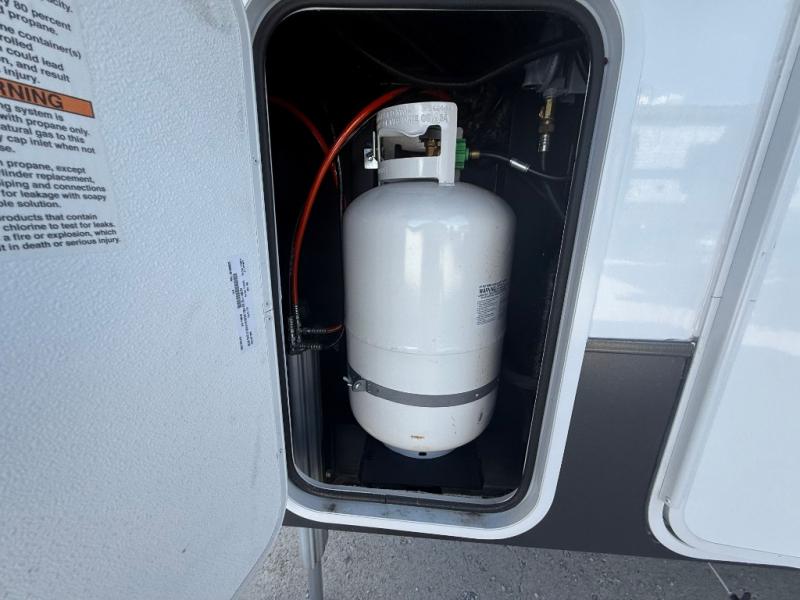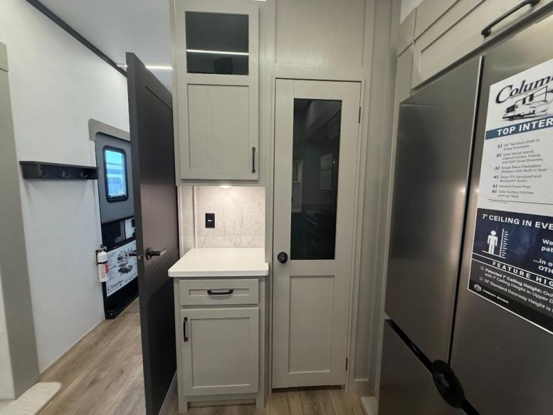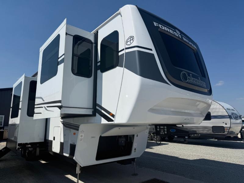 Experience a different camping life with residential furnishings and high-end features in each one of these Forest River Columbus fifth wheels! Durable construction begins with a 101" wide body, an all-welded aluminum frame superstructure, and high-gloss fiberglass vacuum bonded walls and slide out ends with dual Azdel. You will appreciate the Lippert axles, MORryde CRE 3000 suspension system, and 16" wheels with nitrogen-filled tires for a smooth tow from home to campground. Additional exterior features include a tire pressure monitoring system, a heated utility convenience center, an outside sprayer, and slam latch on all the storage doors. Inside, you'll be met with many luxurious amenities, including residential style crown molding throughout, roller day/night shades, upgraded true solid surface countertops in the bath and kitchen, plus solid wood steps.
