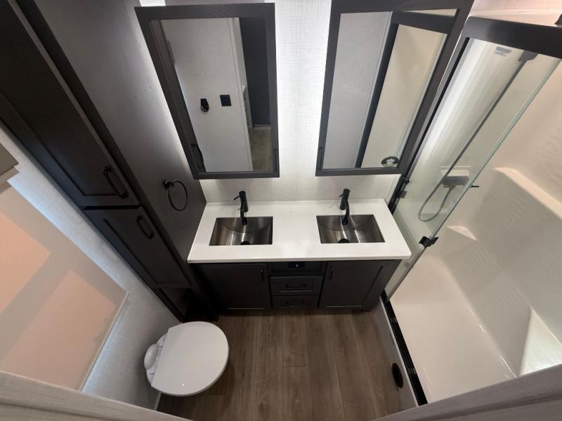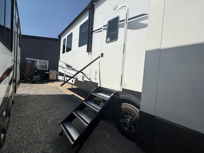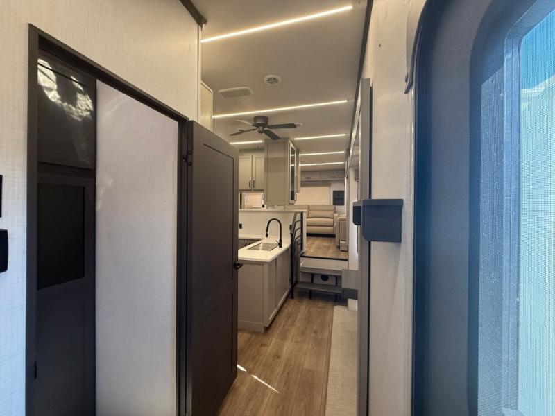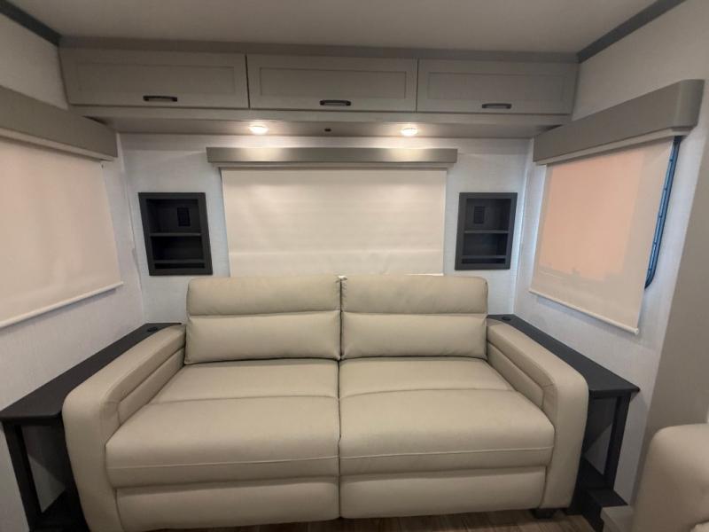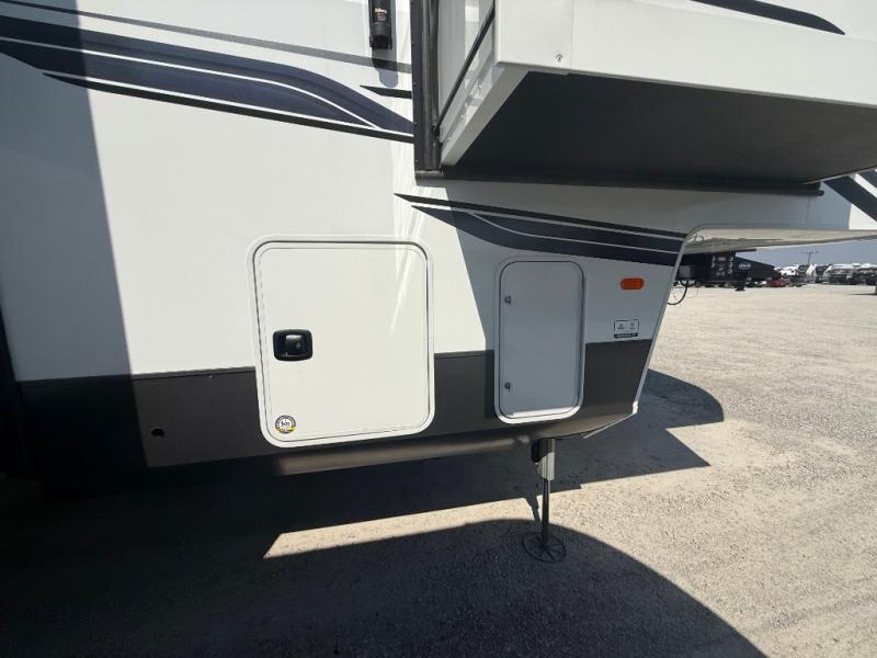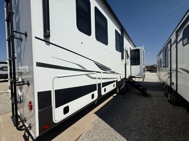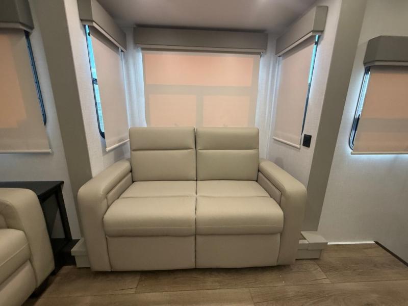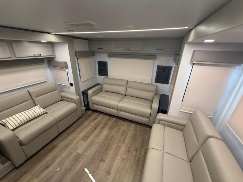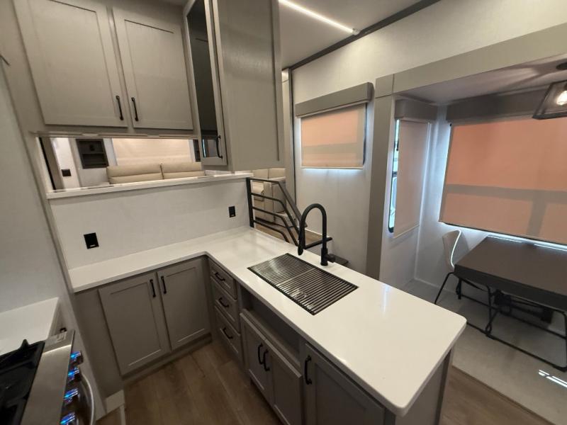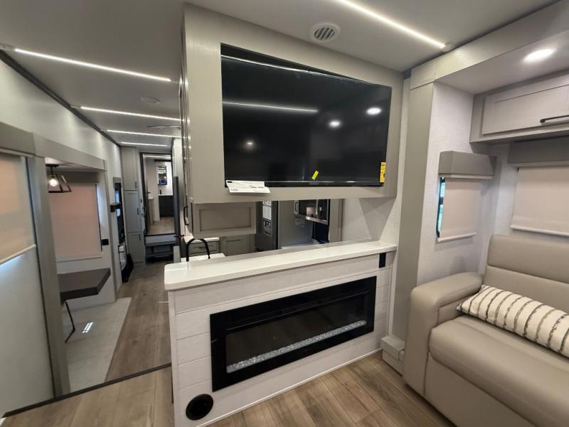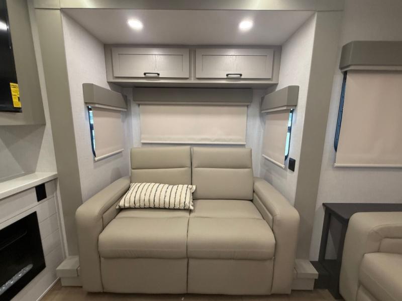 Comfort is found at every turn in this spacious fifth wheel! The front living area will be a favorite place to hang out with its dual 60" split tri-fold sofas, 78" sofa, and entertainment center with a fireplace. The chef of your group will find a middle kitchen, complete with a counter peninsula, a gas cooktop, a stainless-steel oven, plus a 12V stainless-steel residential style refrigerator with an ice maker. There is also a table and chairs where you can dine together each day. As you head to the rear of the unit, you'll find a half bath, which is convenient for all, and you're sure to enjoy your own space in the master bedroom. There is a king bed slide out here, a hamper, TV with storage, and a full rear bath with dual bath sinks; how convenient!