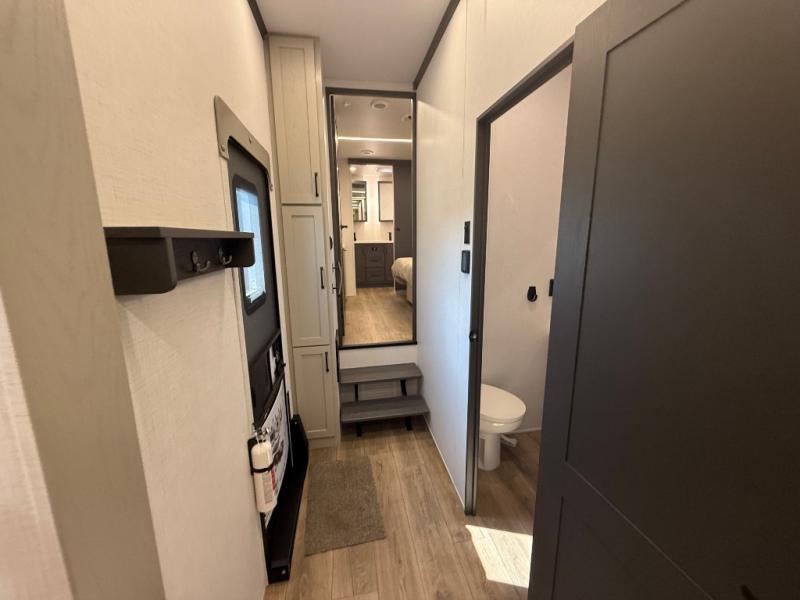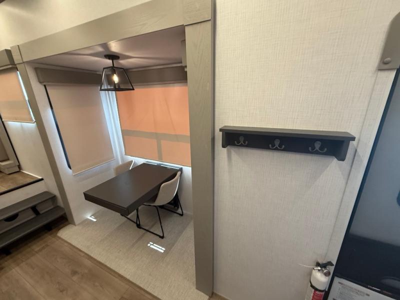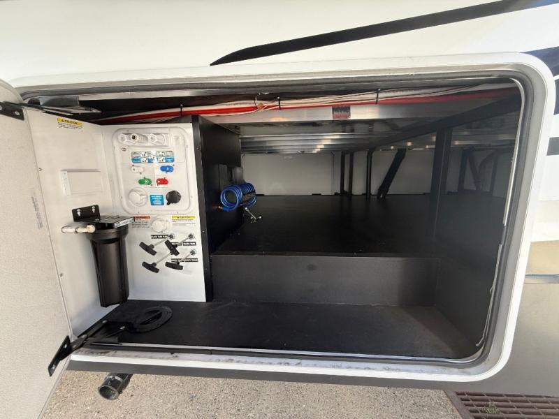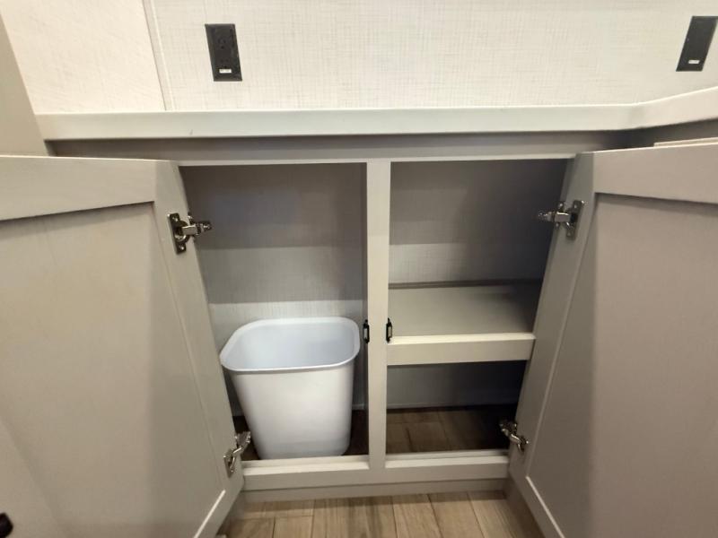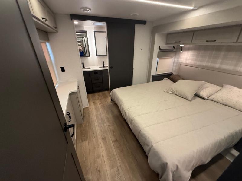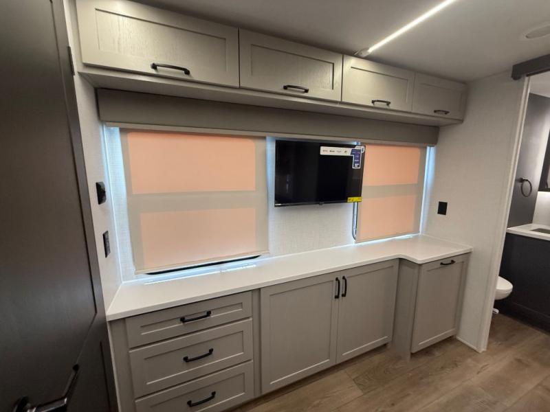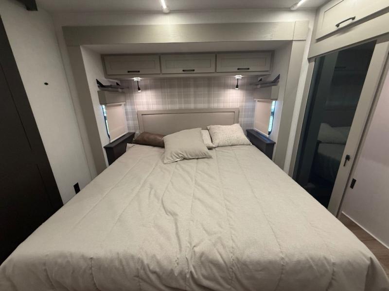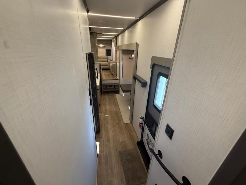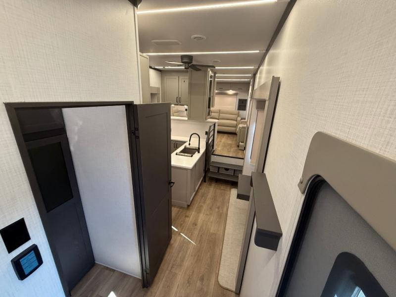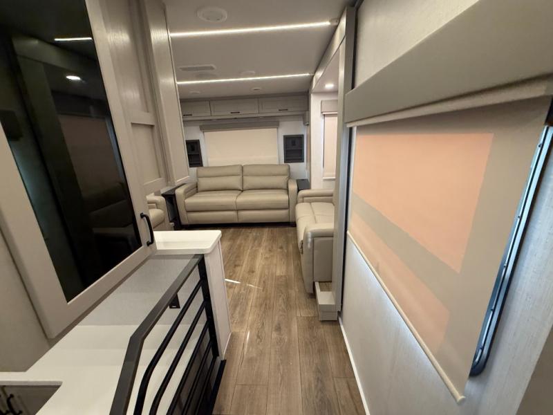 Comfort is found at every turn in this spacious fifth wheel! The front living area will be a favorite place to hang out with its dual 60" split tri-fold sofas, 78" sofa, and entertainment center with a fireplace. The chef of your group will find a middle kitchen, complete with a counter peninsula, a gas cooktop, a stainless-steel oven, plus a 12V stainless-steel residential style refrigerator with an ice maker. There is also a table and chairs where you can dine together each day. As you head to the rear of the unit, you'll find a half bath, which is convenient for all, and you're sure to enjoy your own space in the master bedroom. There is a king bed slide out here, a hamper, TV with storage, and a full rear bath with dual bath sinks; how convenient!