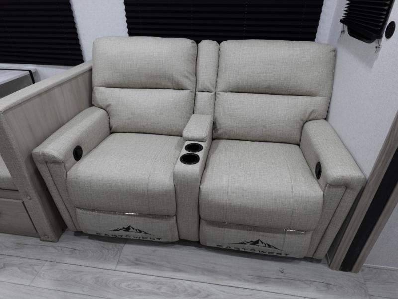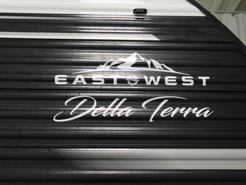Each Della Terra travel trailer by EAST TO WEST is constructed with an enclosed and heated underbelly and enclosed holding tanks so you can camp all year long. There is also a power tongue jack with an LED light for easy set up and a power awning with LED lights you can rest under after you've unpacked. The Explore Comfort Package comes seamless pressed countertops, kitchen backsplash, window valance package with black night shades, and many more comforts. You will also appreciate the Adventure Outdoor Package with backup camera prep and solar prep, a tankless water heater, an RV grill quick disconnect, and a universal docking station with battery disconnect.