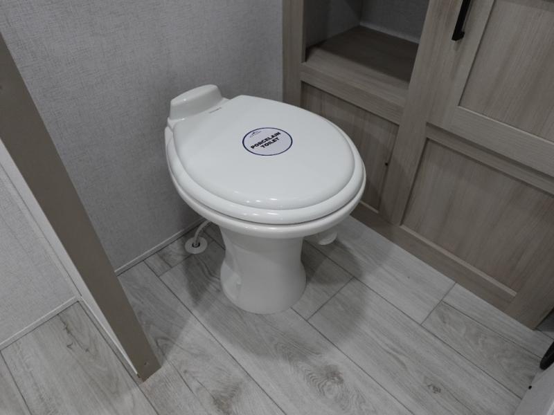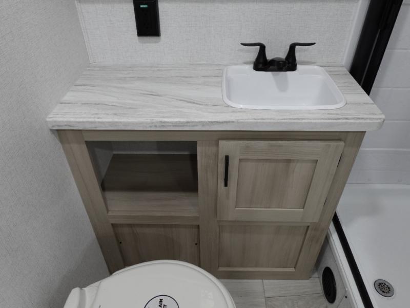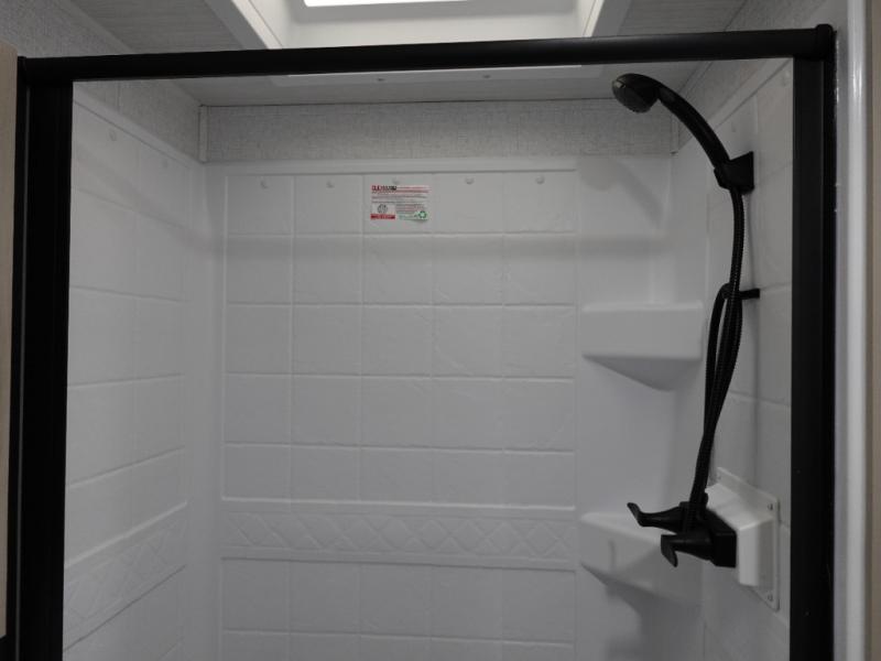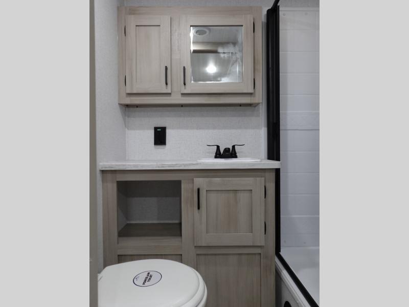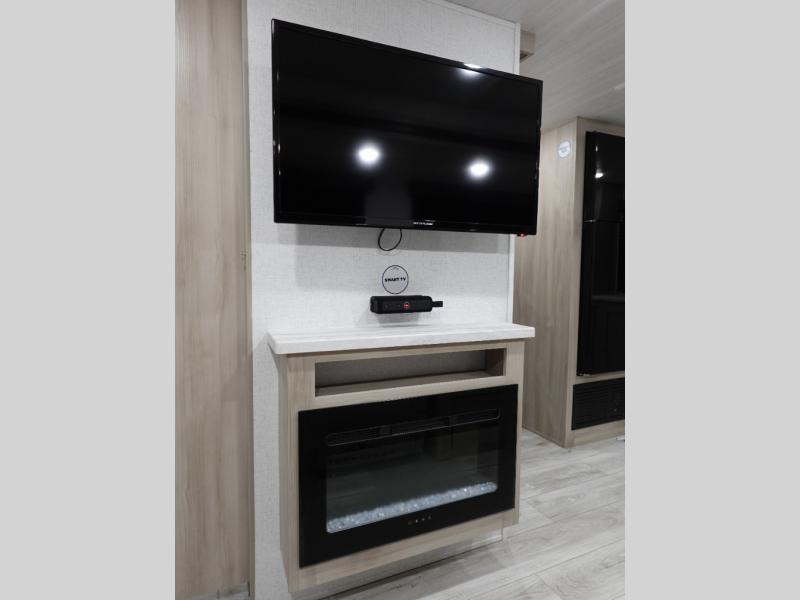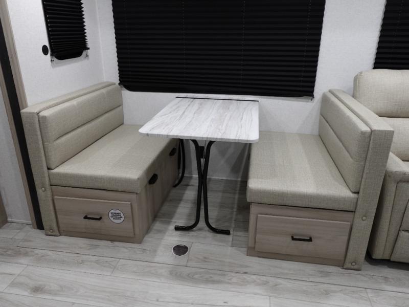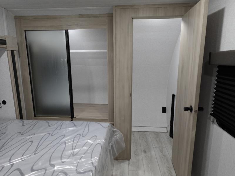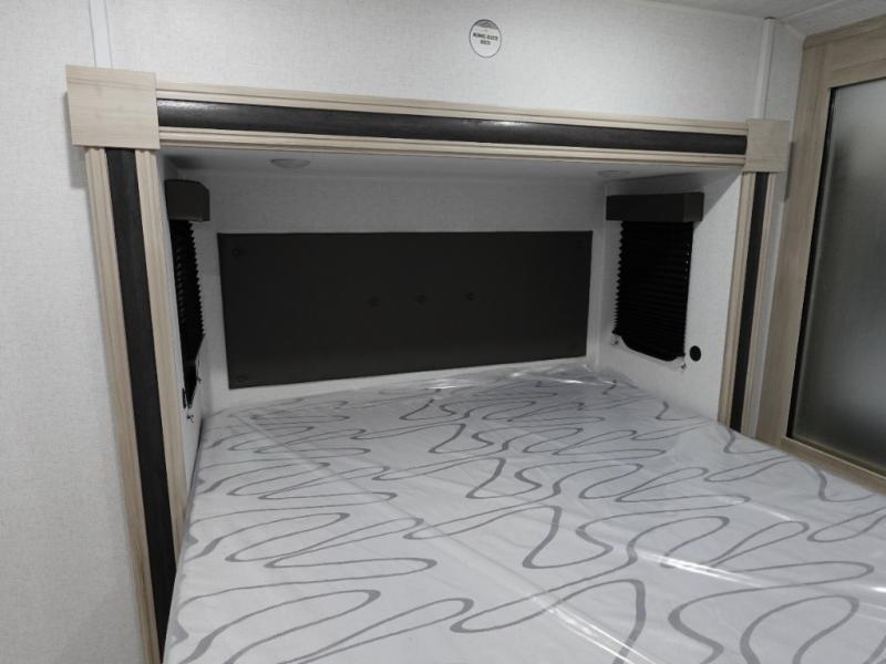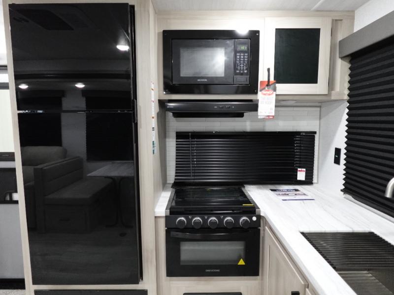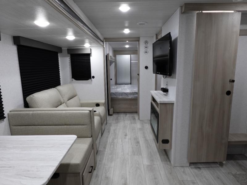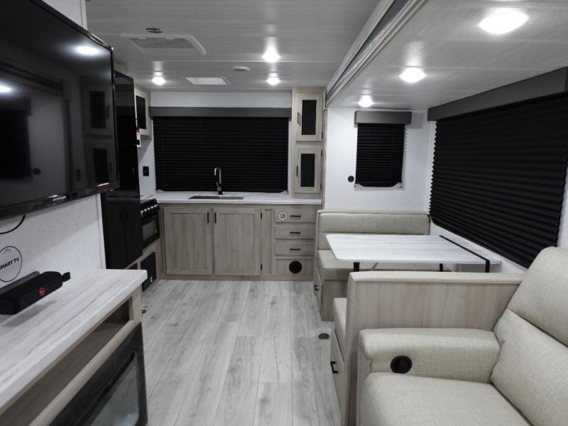 This travel trailer will feel just like home with its spacious interior and at-home comforts. Since there are dual entry doors, you can enter in through the front bedroom or the rear kitchen and living area. A king bed slide in the bedroom is sure to bring comfort, and there is a closet to keep your clothes wrinkle-free, plus washer and dryer prep. The second slide out is found in the living room, and here you can relax on the theater seats or dine at the booth dinette. The chef of your group will love cooking in the rear kitchen, and there is generous counter space here to set out snacks. An entryway pantry and closet will provide additional storage for snacks, jackets, and more!