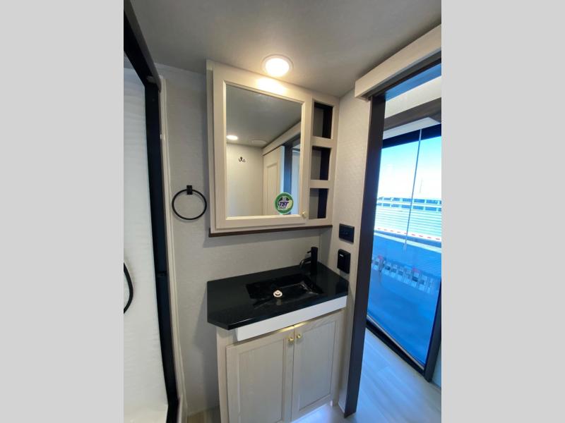 With any Cedar Creek Cottage destination trailer by Forest River, you can enjoy extended stays with residential features at the location of your choice! Each model is built with 3M bonded sidewalls that grow stronger with age and are resistant to UV, heat, oil, moisture, and more. There is also an AlphaPly TPO roof membrane, detachable entry steps, and new waterproof and bug proof Vixenite slide room floor panels for added durability. Head inside where you'll find residential dovetail, self-closing drawers, flush floor slides in the kitchen and living area, a residential style headboard and luxurious bedding decor, and extra storage for linens in the bedroom and bath. Each model is also pre-wired for satellite to the roof, and you can stay connected with the new Cradle Point WiFi/5G antenna and Day 1 connectivity.
