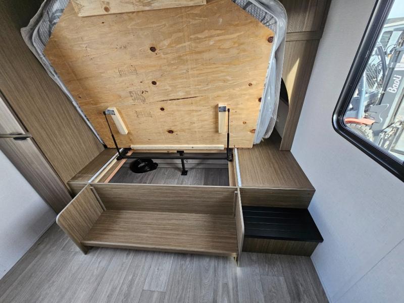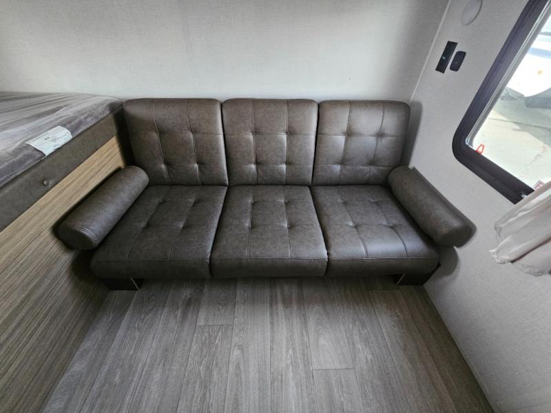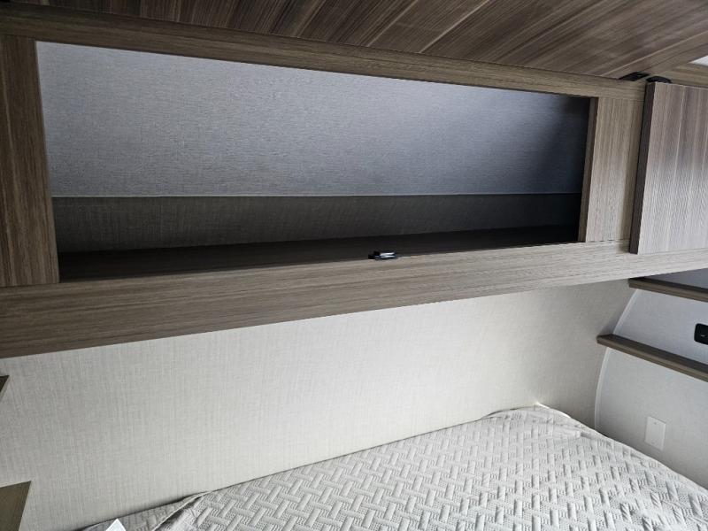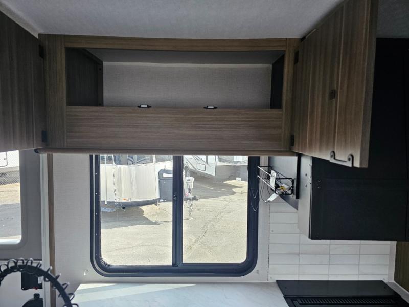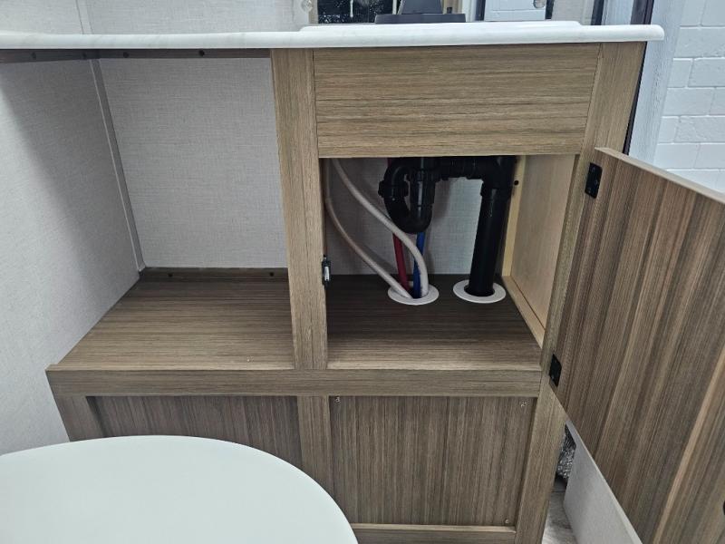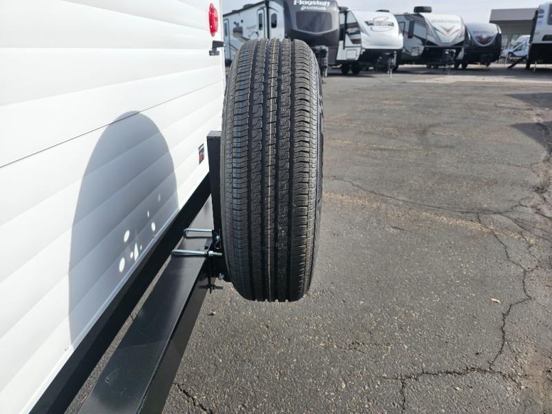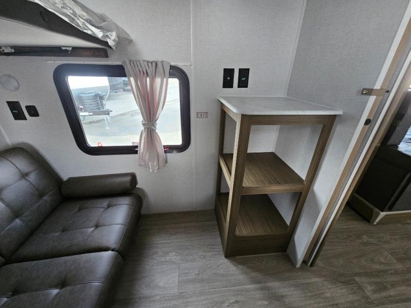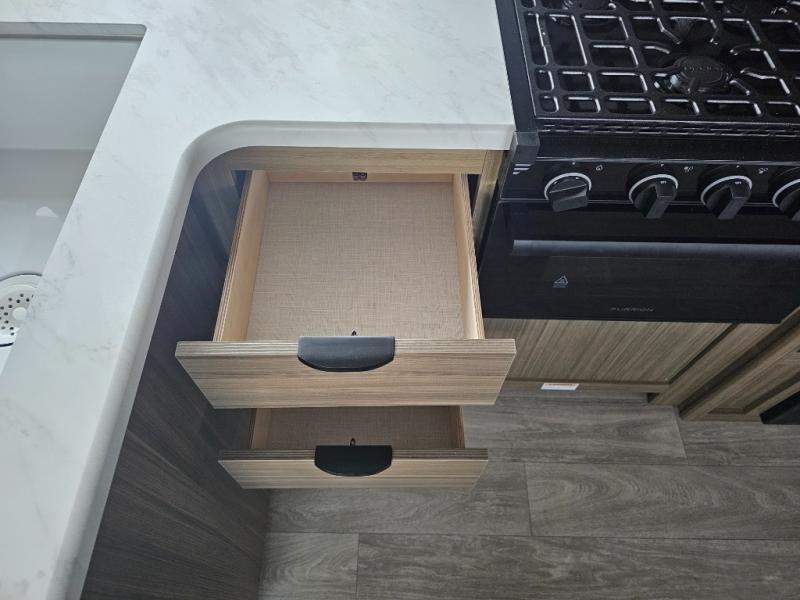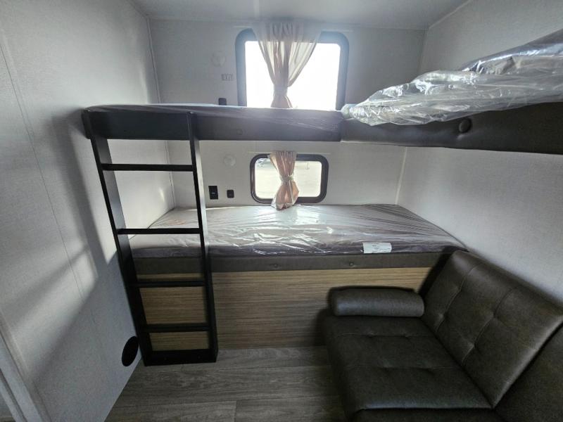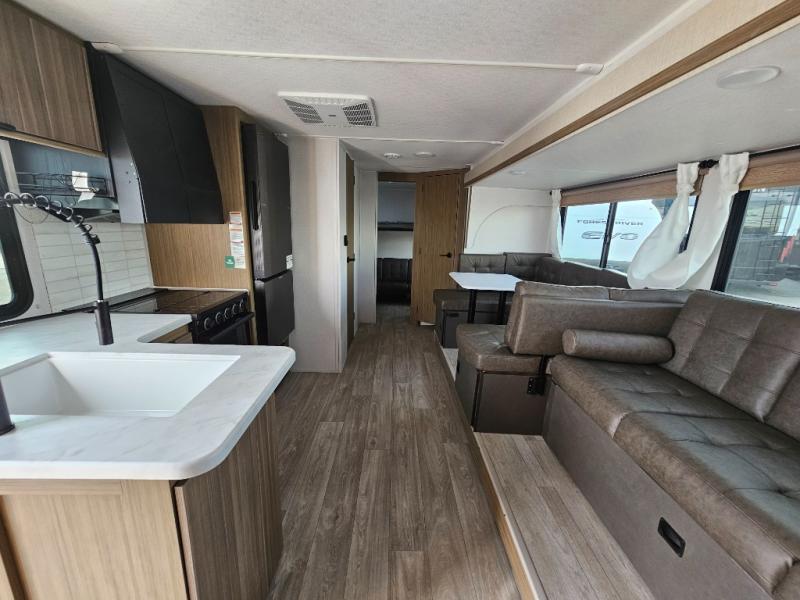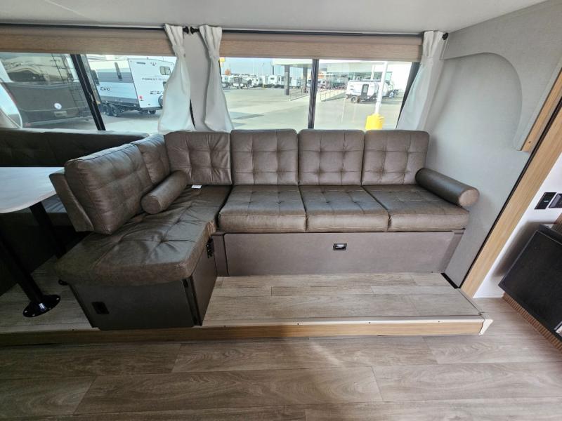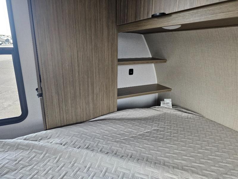 With any EVO Lite travel trailer Forest River, there are features that provide function and convenience such as the power tongue jack and the exterior convenience package with a friction hinge entry door and magnetic latches on baggage doors, plus the on-demand water heater. There is also an XL grab handle, two outside speakers, plus E-Z lube axles and self-adjusting brakes for a better towing experience. Inside, you'll love the modern cloth roller shades with autostop, along with an upgraded appliance package and a USB port package to help keep your electronics charged up and ready to go.