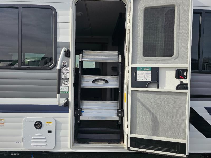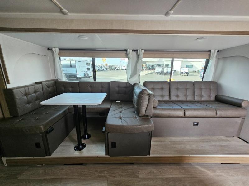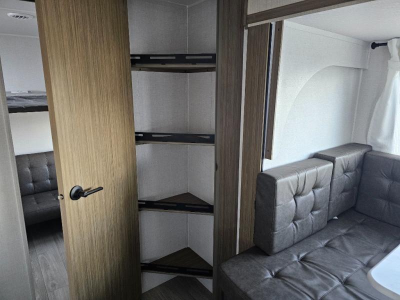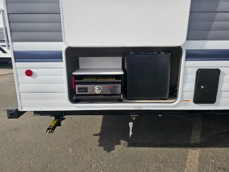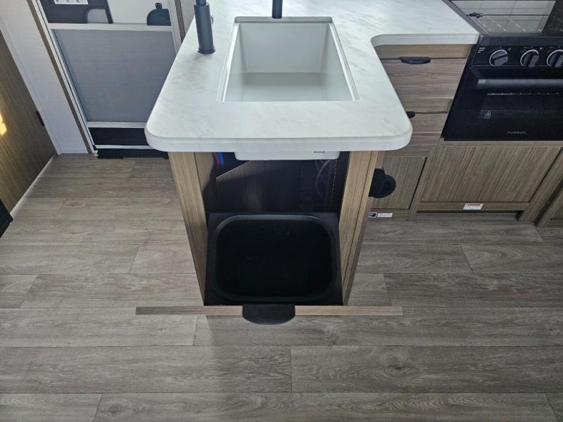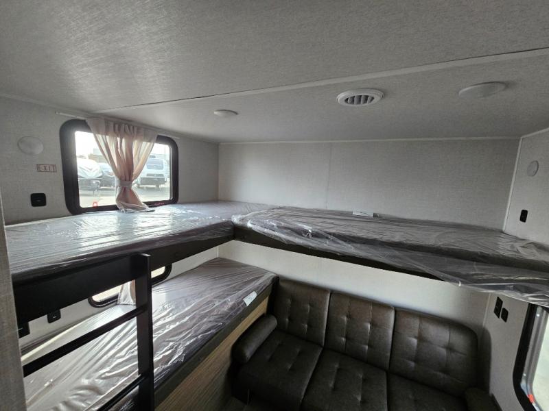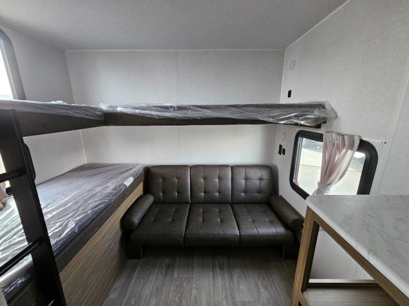 When you have a private bunkhouse in your trailer, you can allow the kids to have their own space or offer friends an overnight place to call their own! The rear bunkhouse includes a space saving sliding door for privacy, a jiffy sofa to relax on and two bunk beds, plus a wardrobe and entertainment center. The full bathroom is nearby, and the main living and kitchen area is spacious with a slide out U-shaped dinette and sofa. There are full amenities in the galley kitchen, a pantry for dry goods, plus a fireplace for all to enjoy. And the front bedroom allows you to sleep like a queen and keep everything tidy thanks to all the storage. And you might like to add the camp kitchen option if you enjoy cooking in the outdoors.