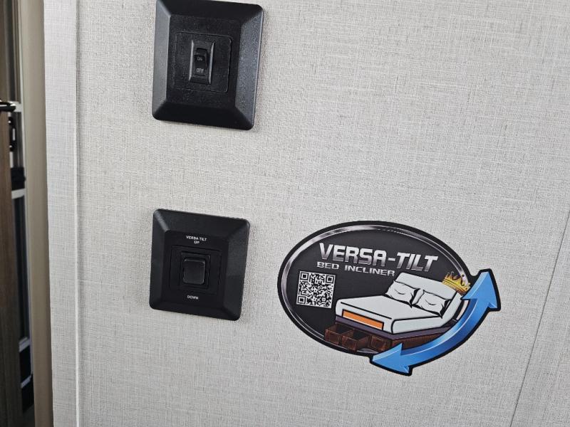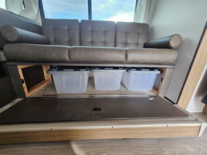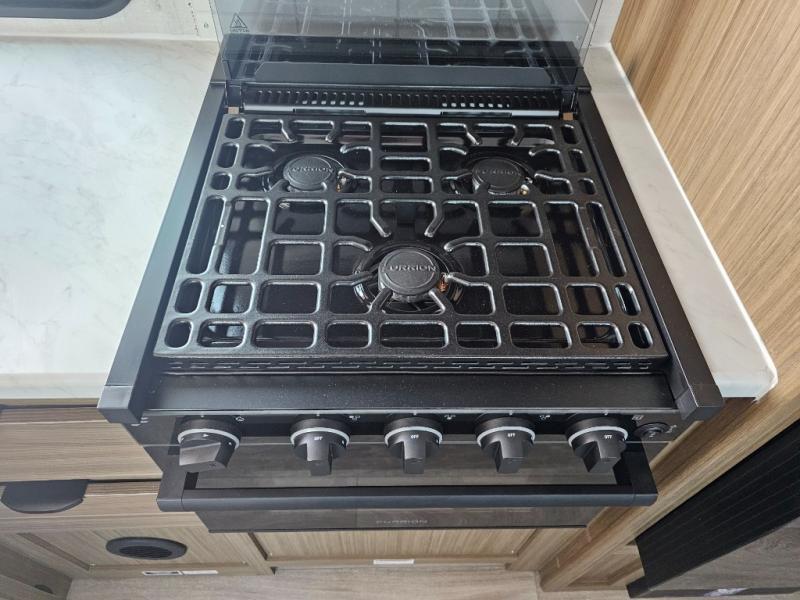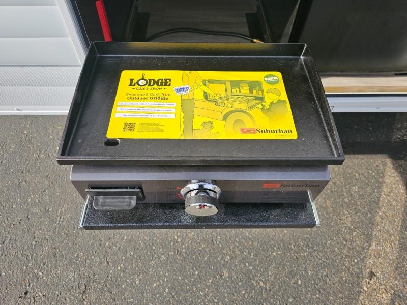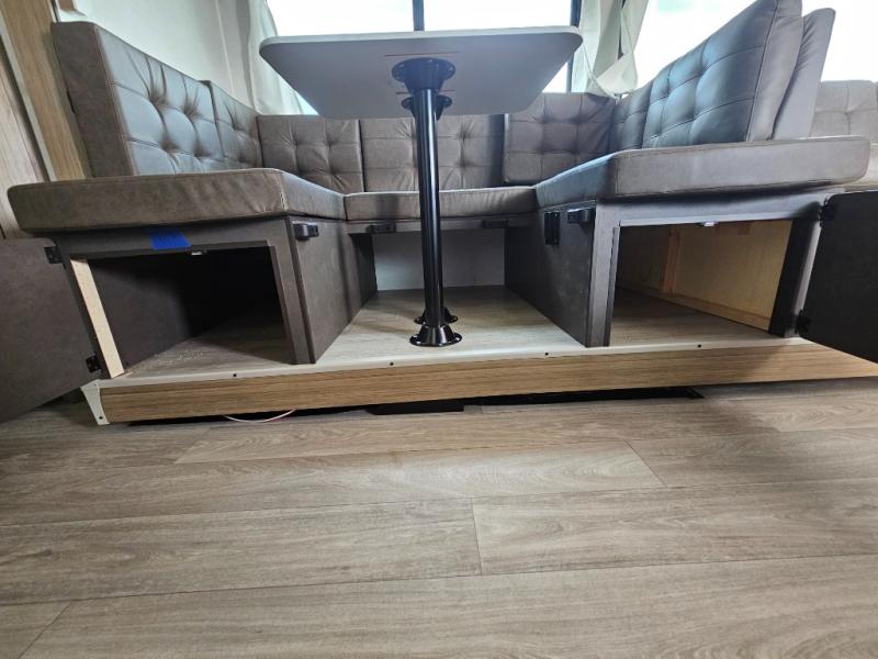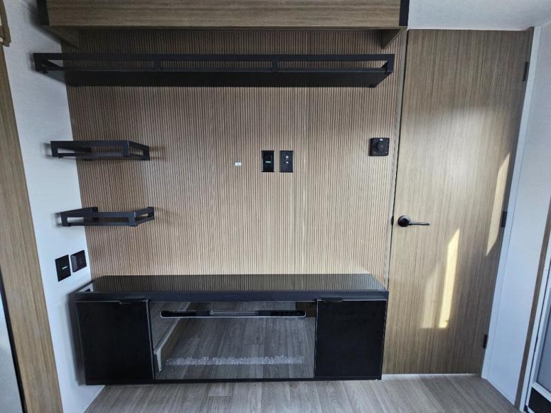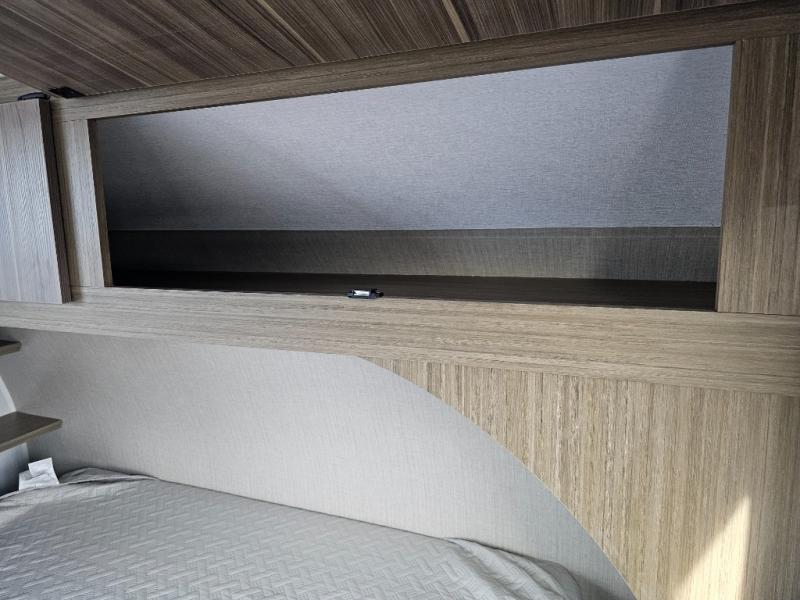 When you have a private bunkhouse in your trailer, you can allow the kids to have their own space or offer friends an overnight place to call their own! The rear bunkhouse includes a space saving sliding door for privacy, a jiffy sofa to relax on and two bunk beds, plus a wardrobe and entertainment center. The full bathroom is nearby, and the main living and kitchen area is spacious with a slide out U-shaped dinette and sofa. There are full amenities in the galley kitchen, a pantry for dry goods, plus a fireplace for all to enjoy. And the front bedroom allows you to sleep like a queen and keep everything tidy thanks to all the storage. And you might like to add the camp kitchen option if you enjoy cooking in the outdoors.
