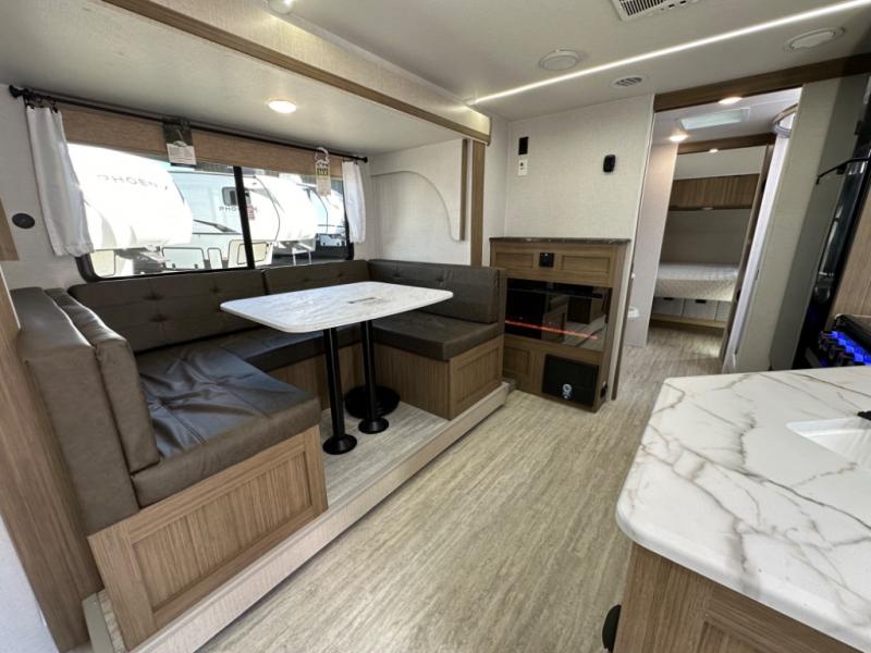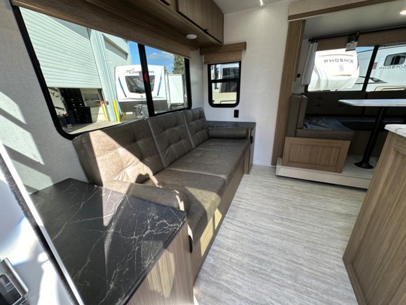 Relax in the rear living area with a sofa and U-shaped dinette that doubles as extra sleeping space. Large windows bring in natural light, creating an open and inviting space.