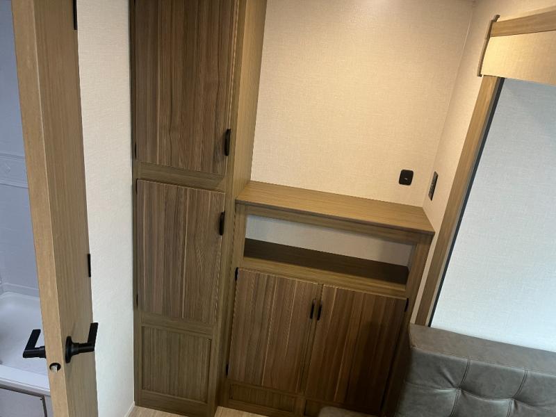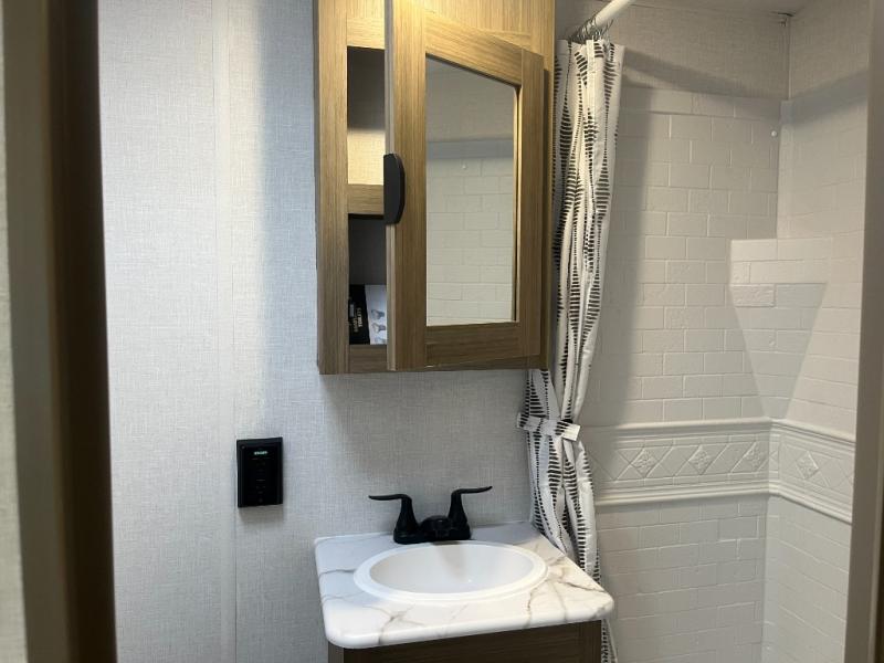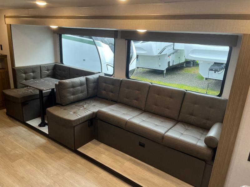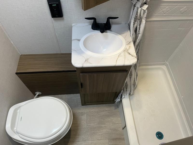 Don't pass up your chance to camp in true comfort with this travel trailer! The front queen bed offers a comfortable place to lay your head at night and has a shelf above it plus dual wardrobes. Start your mornings off right by scrambling some eggs on the two burner cooktop and enjoying them at the U-shaped dinette, then relax on the Versa lounge while you read the newspaper or favorite book. You also have a pantry to store all of your favorite snacks. The rear corner bathroom has a surround shower for you to freshen up in each morning too!