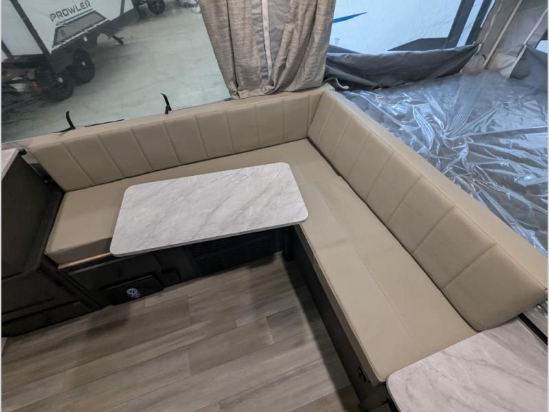 You'll be pleasantly surprised by the amount of comfort in these Flagstaff MAC Series folding pop-up campers by Forest River. Each one is built with a fiberglass laminated roof for added durability and a power roof lift for easy set up. There is also a clay exterior with an alloy band, solar panel prep on the frame, and four stabilizer jacks with sand pads to keep your camper secure. The interior features wood plank flooring, heated mattresses on the bunk ends, USB charging ports, and stylish Andover Sable wood.