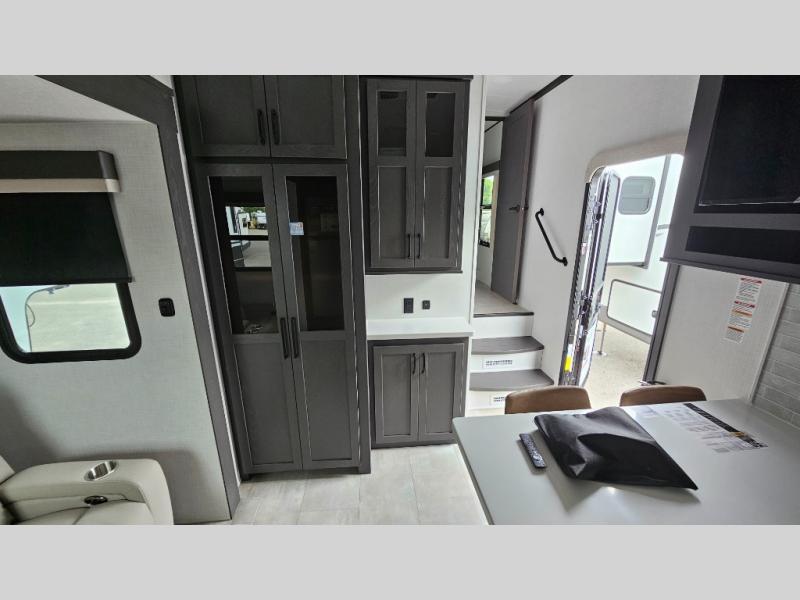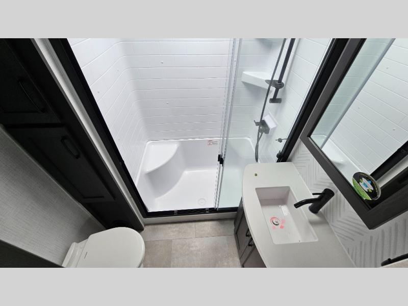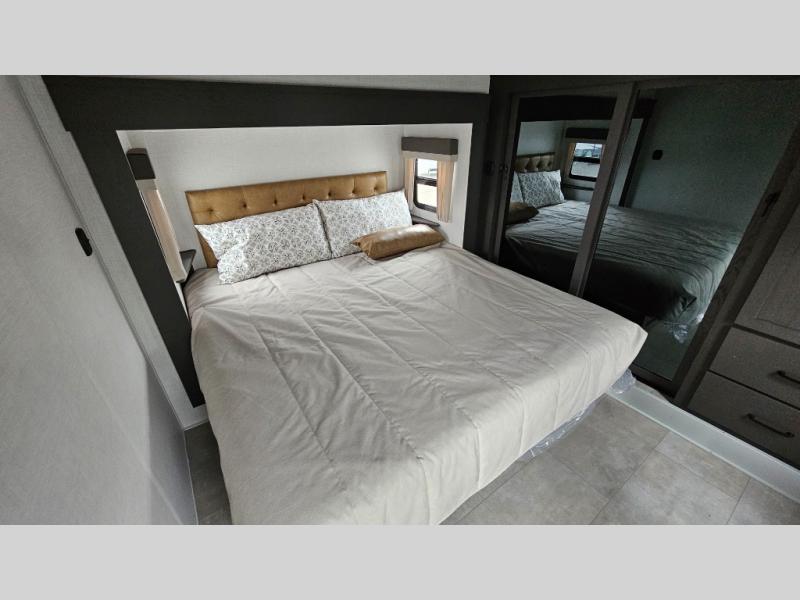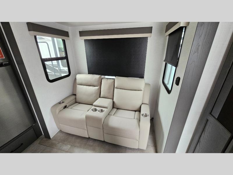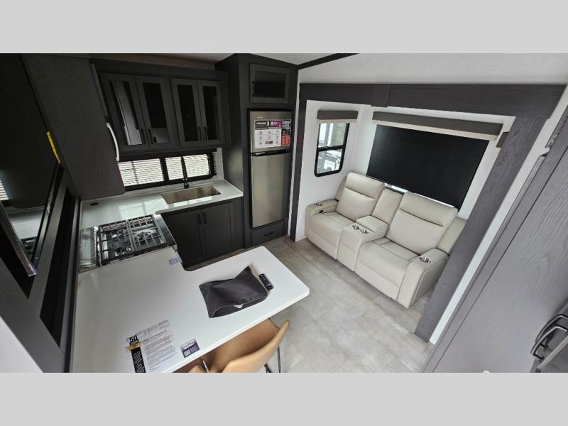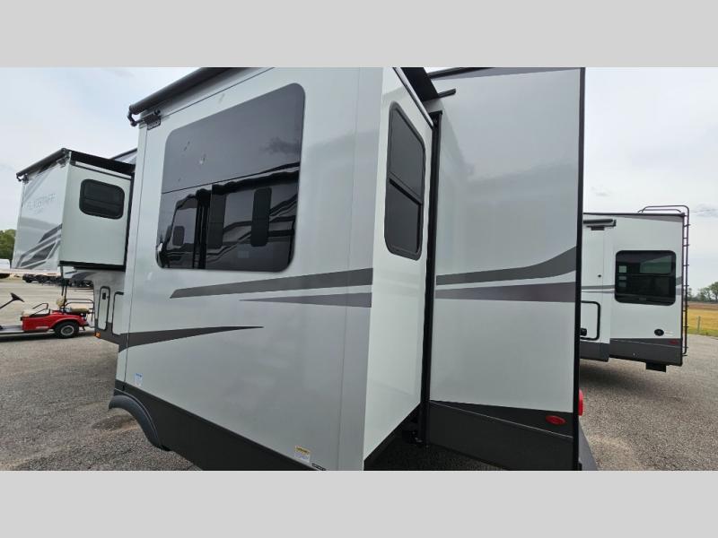 Camp in comfort with your favorite person or your friends in this spacious bedroom and bathroom fifth wheel! From the shower with a seat and linen storage to the slide out queen bed or choose a king option, you will feel right at home. The bedroom also offers a dresser, a front wardrobe with shelves, and an optional TV. The main living area provides a hide-a-bed sofa that sleeps two, a rear kitchen with a 11 cu. ft. refrigerator to store lots of food, and a bar top with seating to dine at. You can watch the Smart TV before going to bed or each morning, and the 20' awning gives you even more living space outdoors protected from the outside elements.