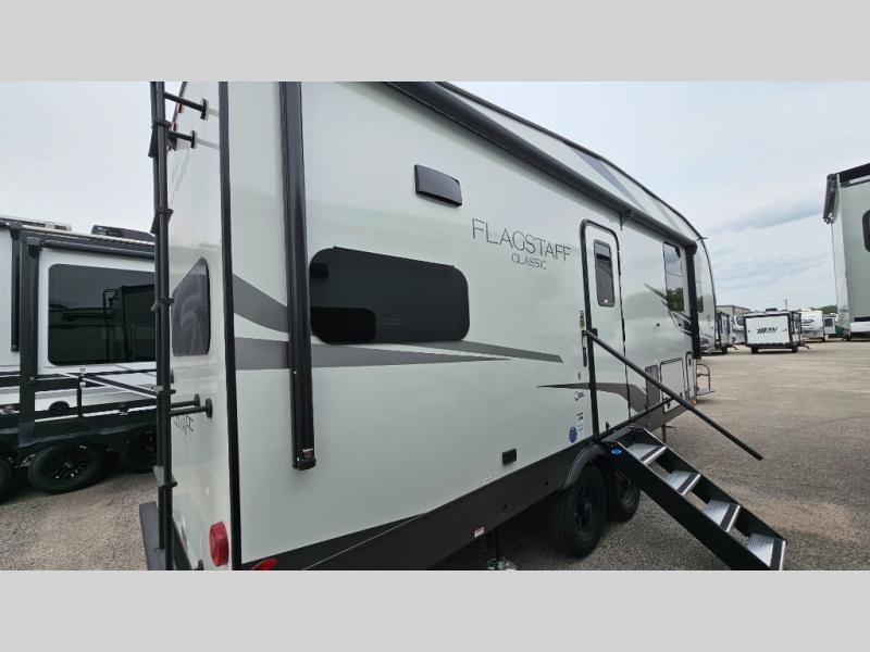 Each one of these Forest River Flagstaff Classic fifth wheels or travel trailers will be your home on wheels! Their quality craftsmanship and attention to detail shines through the surface-coated steel I-beam frame on fifth wheels, the enclosed underbelly, the radius roof with vaulted interior ceilings, and six-sided fully aluminum-framed floor, walls, and roof. Towing your unit will be easy with the torsion axle, Rubber-Ryde suspension, and nitrogen-filled Goodyear Endurance tires. You will even reduce your use of water with the Showermiser water saving system in the bathroom. A few other convenient features you will enjoy include a control panel with WeRV app control, designer headboard and bedding, and an outside hot and cold water port. Come choose your favorite one today!