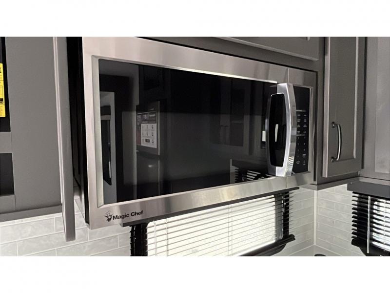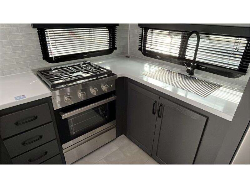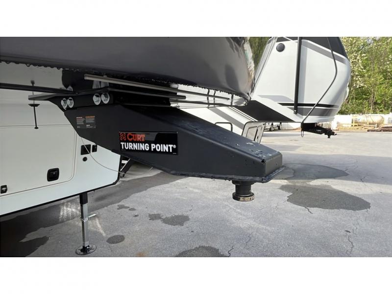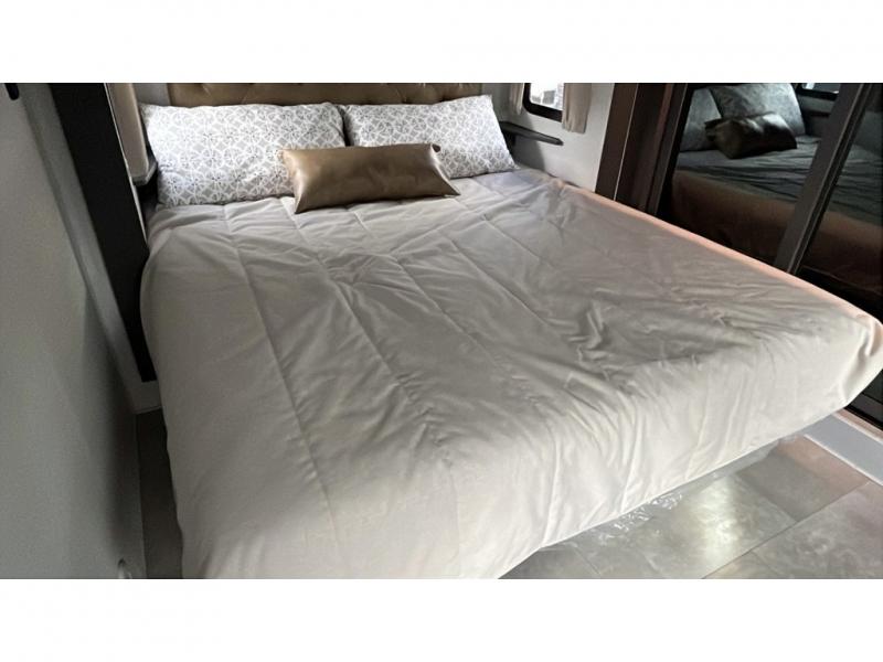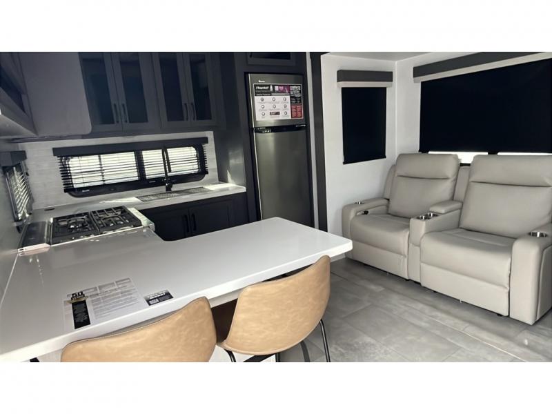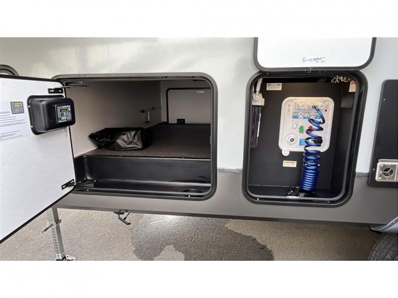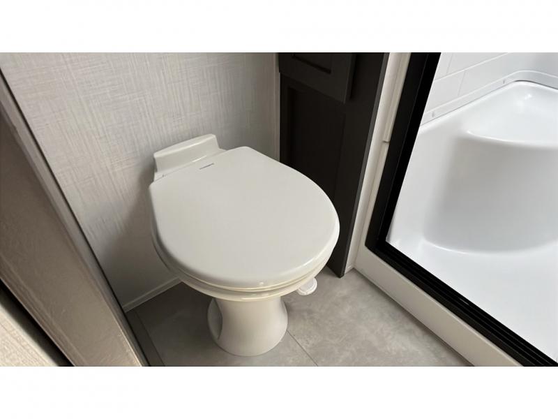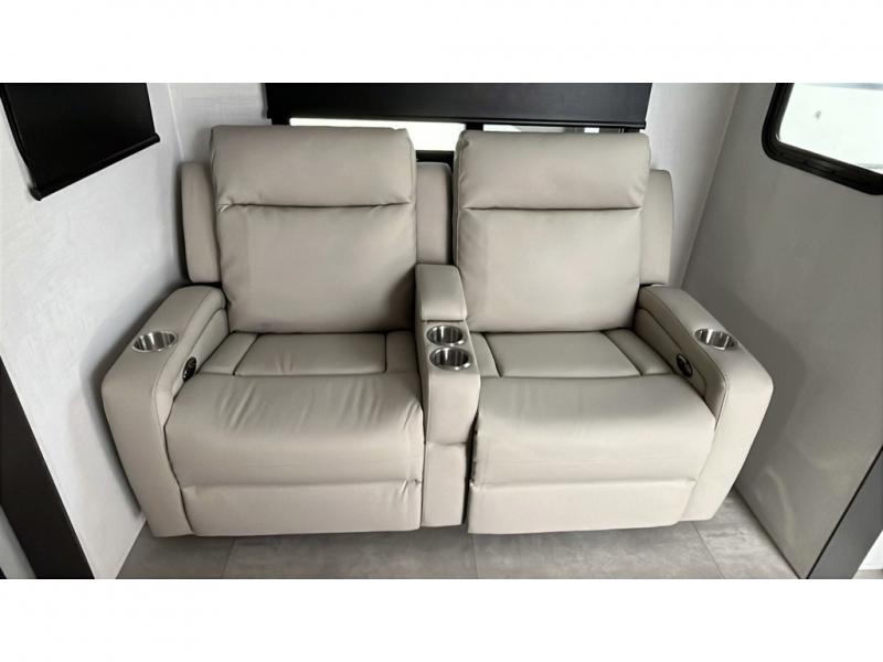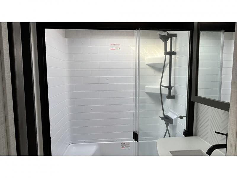 Camp in comfort with your favorite person or your friends in this spacious bedroom and bathroom fifth wheel! From the shower with a seat and linen storage to the slide out queen bed or choose a king option, you will feel right at home. The bedroom also offers a dresser, a front wardrobe with shelves, and an optional TV. The main living area provides a hide-a-bed sofa that sleeps two, a rear kitchen with a 11 cu. ft. refrigerator to store lots of food, and a bar top with seating to dine at. You can watch the Smart TV before going to bed or each morning, and the 20' awning gives you even more living space outdoors protected from the outside elements.