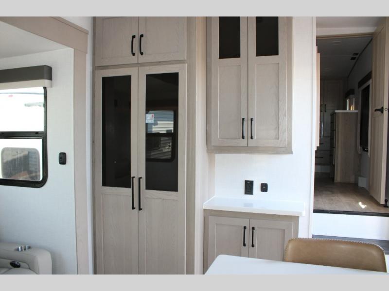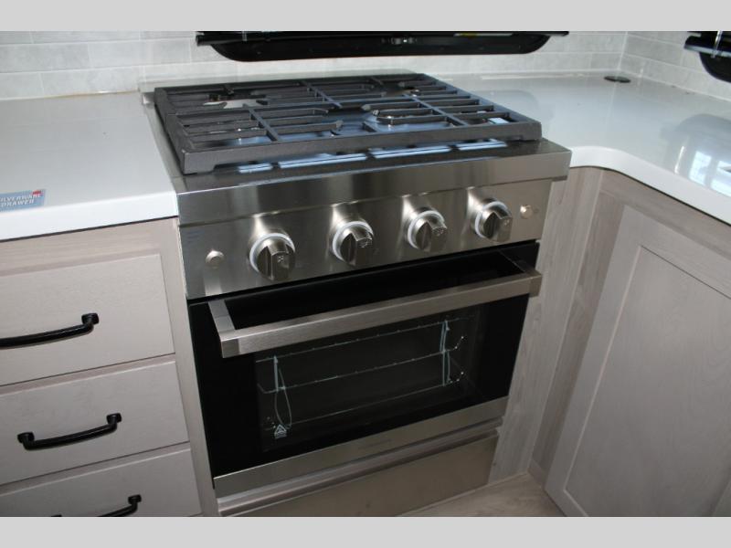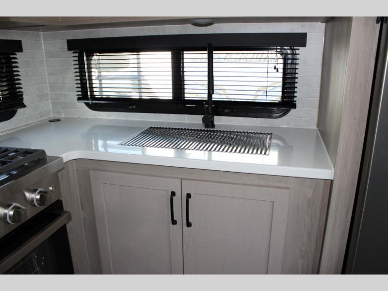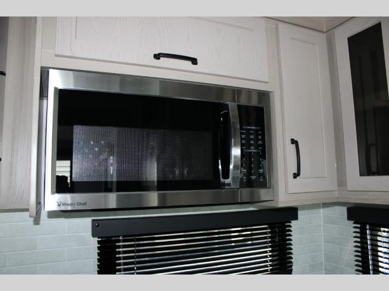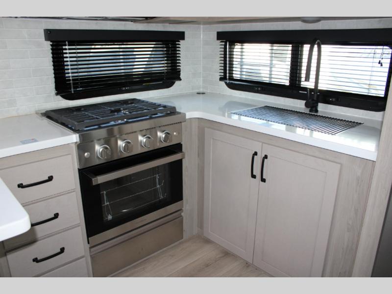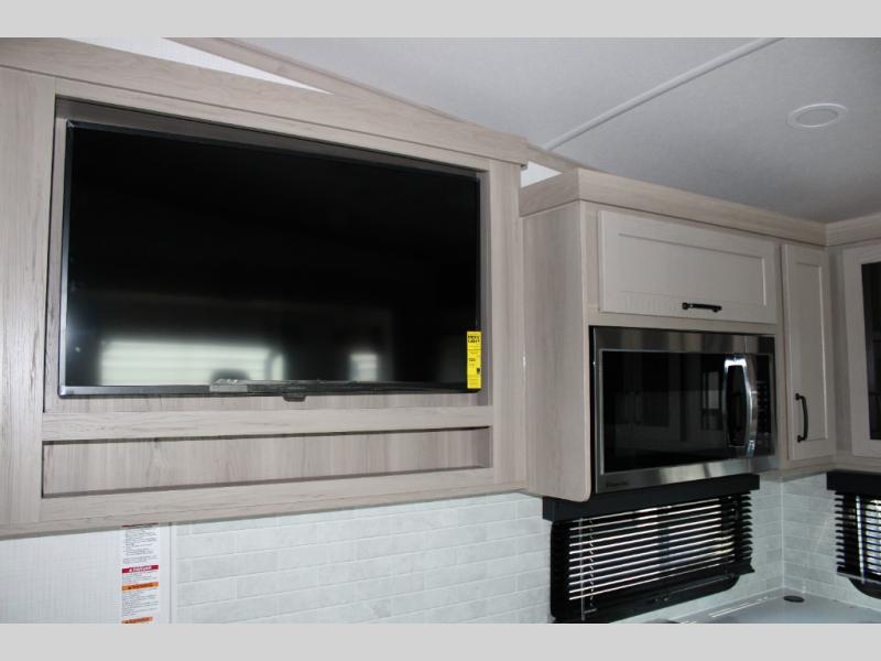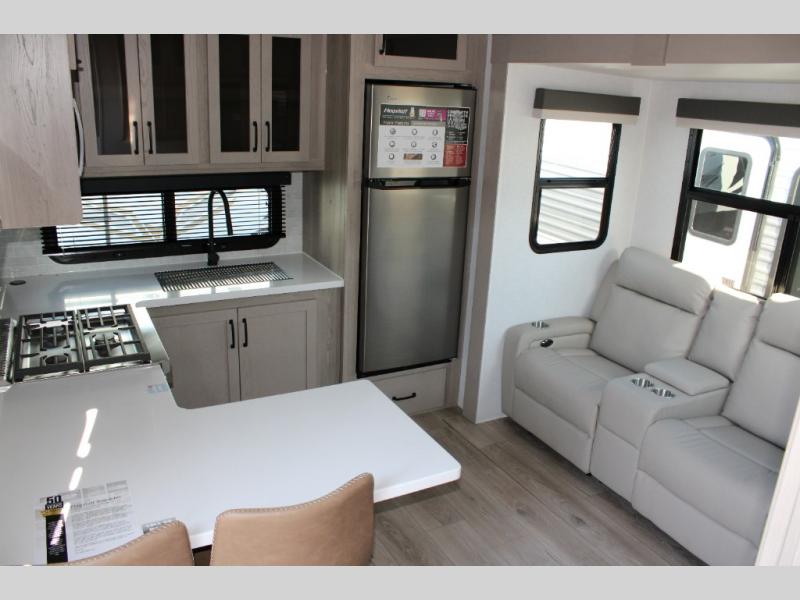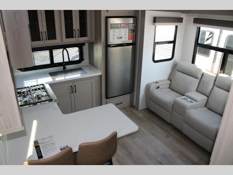• Rear kitchen layout offers ample countertop space and excellent flow for meal prep, featuring a large 11 cu. ft. refrigerator and panoramic rear windows so you never miss a view