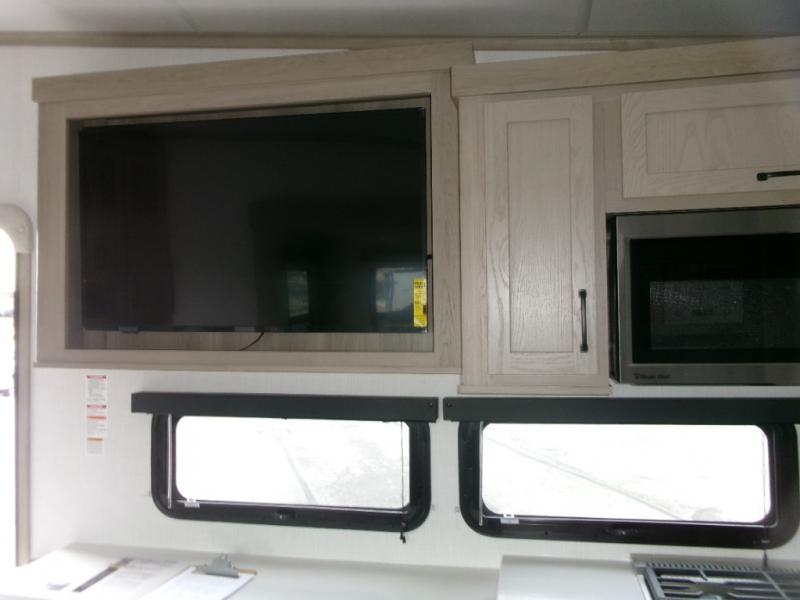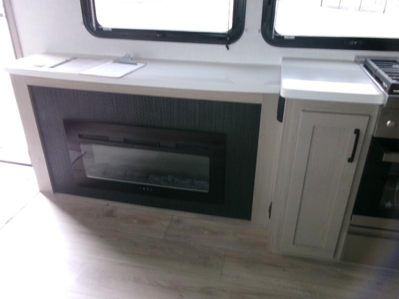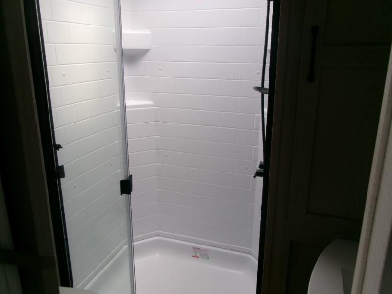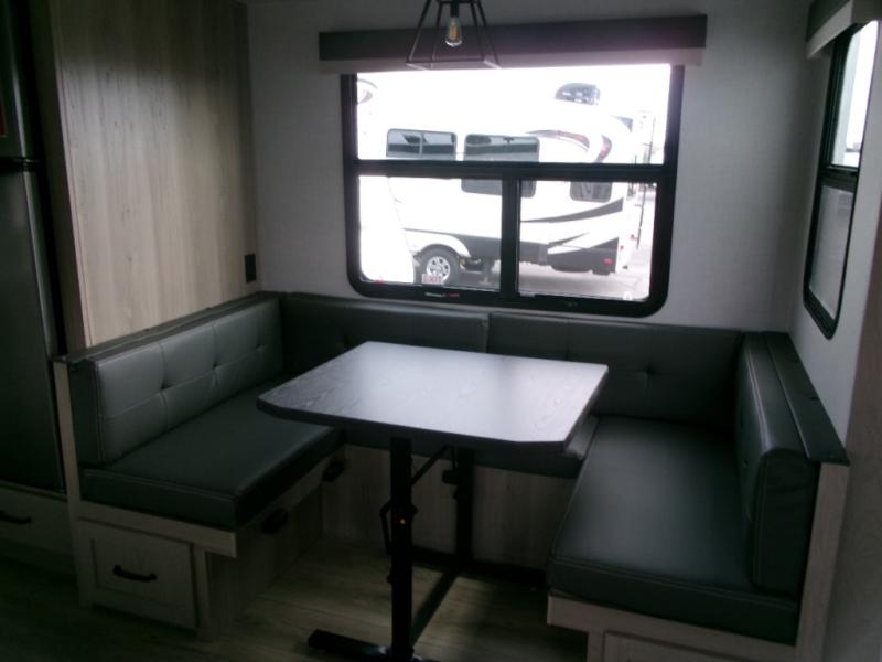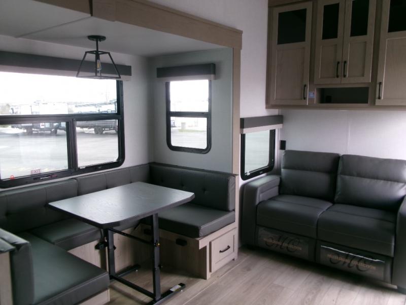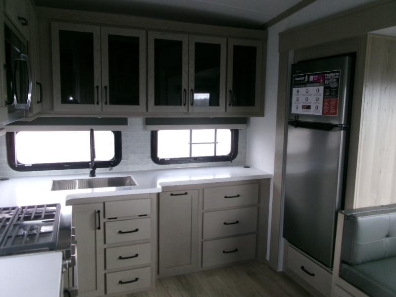 The perfect couple's fifth wheel offers privacy in a front bedroom with a queen bed, a slide out wardrobe providing more floor space, and more storage for your things. You will also appreciate the second entry into the bathroom from the bedroom, and the linen storage in the bathroom and the radius shower that saves floor space. The cook will love all the counterspace and cabinets provided in the rear kitchen and along the side wall, plus the ceiling fan can keep the air circulating when the air conditioner is off. The large king U-shaped dinette allows you to play games, dine, and even work with lots of seating and table space for many to gather when you invite guests over.