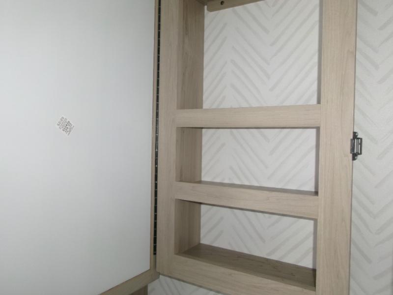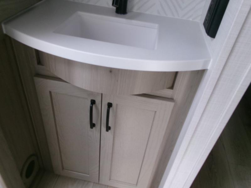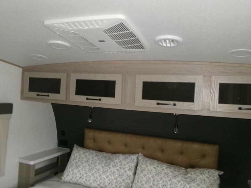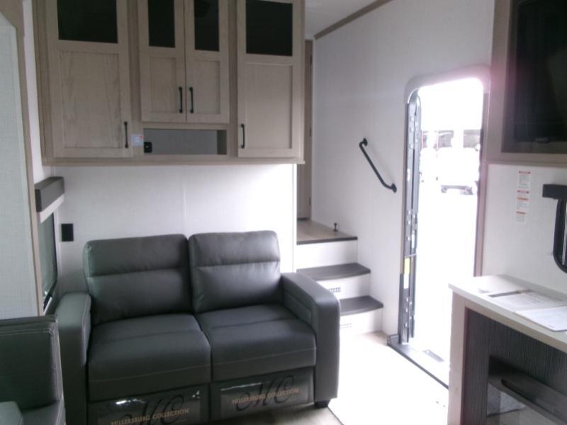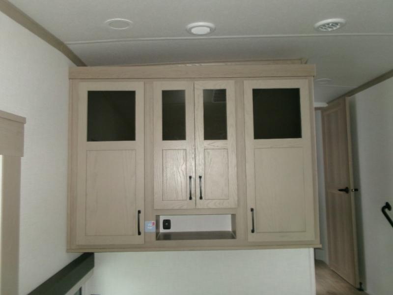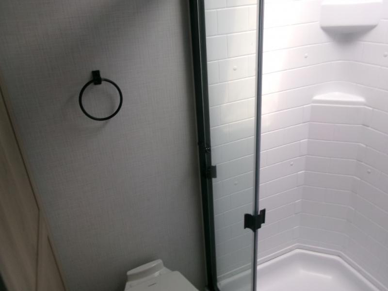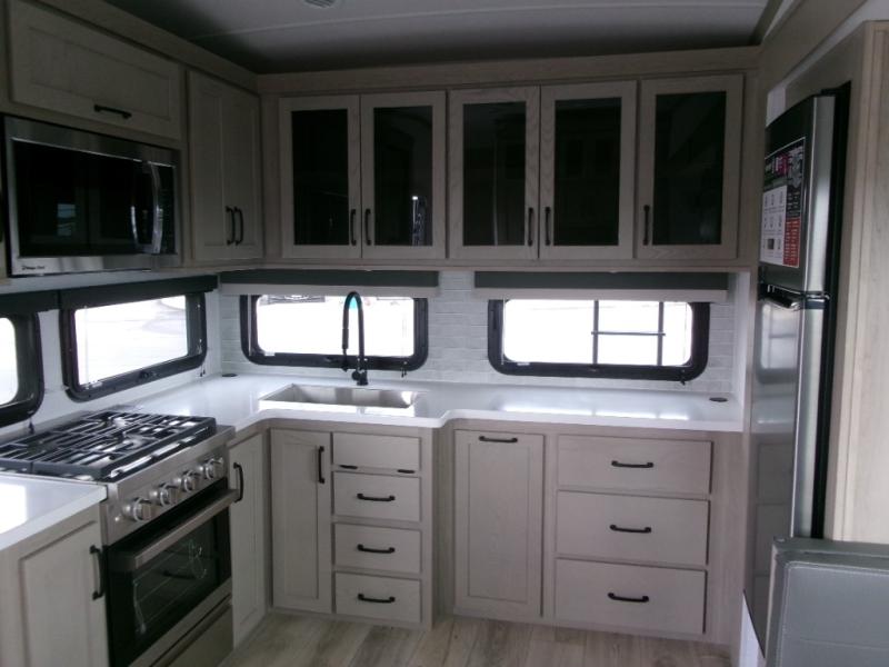 The perfect couple's fifth wheel offers privacy in a front bedroom with a queen bed, a slide out wardrobe providing more floor space, and more storage for your things. You will also appreciate the second entry into the bathroom from the bedroom, and the linen storage in the bathroom and the radius shower that saves floor space. The cook will love all the counterspace and cabinets provided in the rear kitchen and along the side wall, plus the ceiling fan can keep the air circulating when the air conditioner is off. The large king U-shaped dinette allows you to play games, dine, and even work with lots of seating and table space for many to gather when you invite guests over.