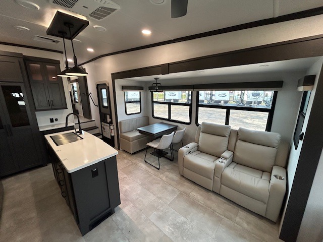 Get ready to enjoy the outdoors while inside with the enormous windows in both the rear and the door side slide of this fifth wheel. The spacious main living area offers dual opposing slides giving you a great place to invite other RVers over to visit, eat, and even play cards. There is seating for nine from the booth dinette, the theater seats, and the rear hide-a-bed sofa. The cook will have a large refrigerator to store lots of drinks and cold food, plus a pantry, and the center island offers extra counter space plus seating. After everyone has left, retire to the front bedroom with a queen bed slide, a shirt closet, a wardrobe with washer/dryer prep, plus more storage and a TV option. You might even like to choose a king bed option as well.