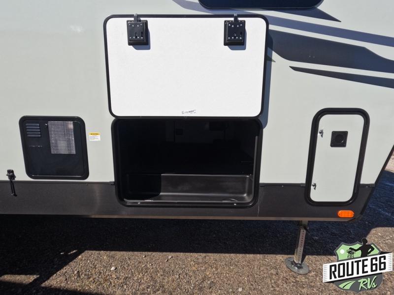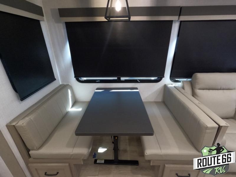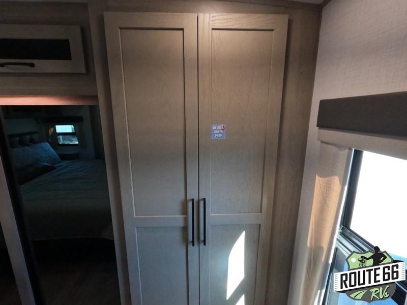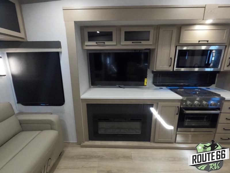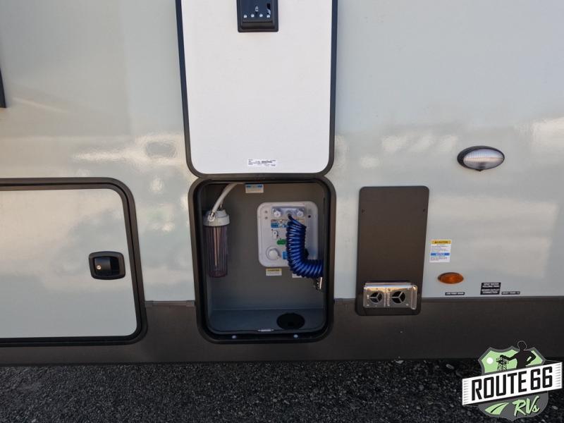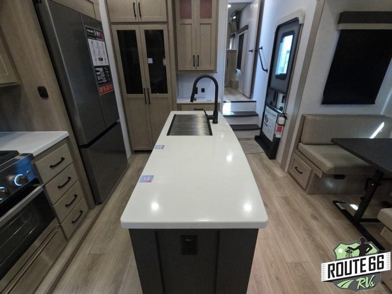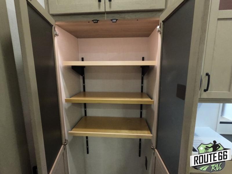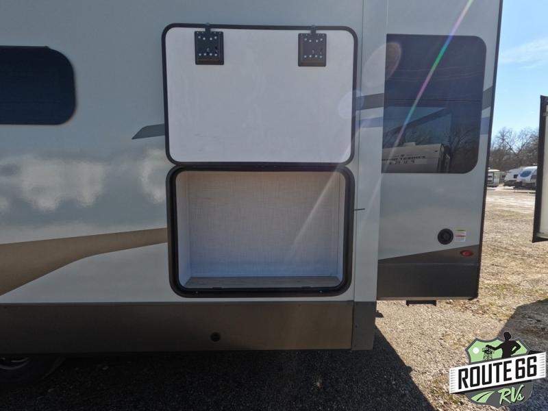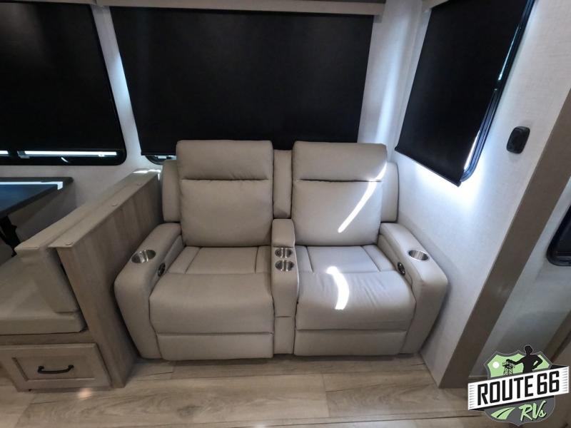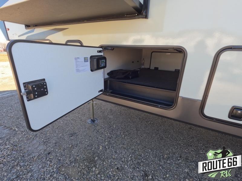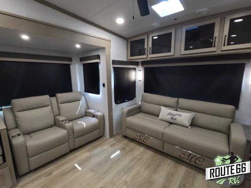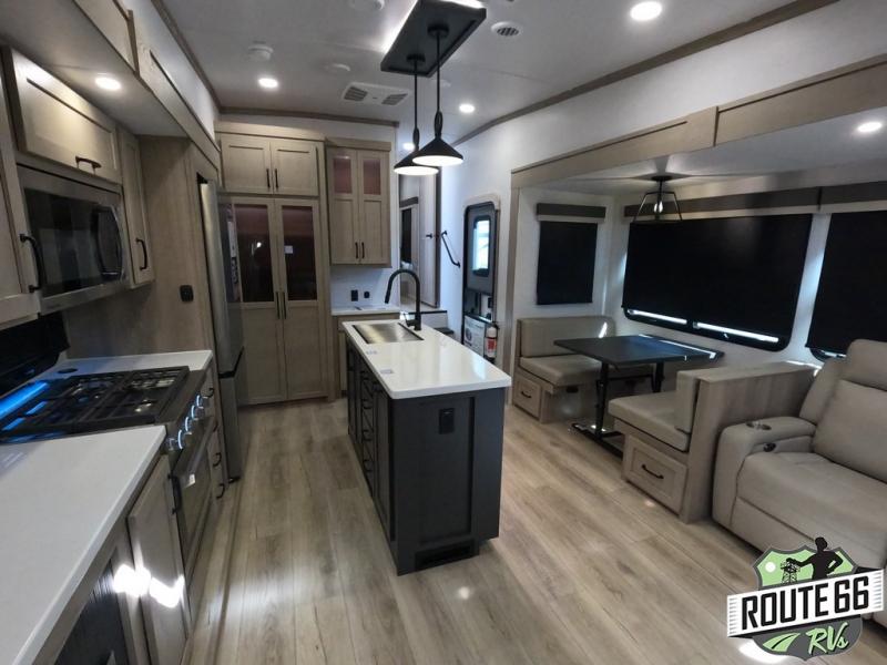 Get ready to enjoy the outdoors while inside with the enormous windows in both the rear and the door side slide of this fifth wheel. The spacious main living area offers dual opposing slides giving you a great place to invite other RVers over to visit, eat, and even play cards. There is seating for nine from the booth dinette, the theater seats, and the rear hide-a-bed sofa. The cook will have a large refrigerator to store lots of drinks and cold food, plus a pantry, and the center island offers extra counter space plus seating. After everyone has left, retire to the front bedroom with a queen bed slide, a shirt closet, a wardrobe with washer/dryer prep, plus more storage and a TV option. You might even like to choose a king bed option as well.
