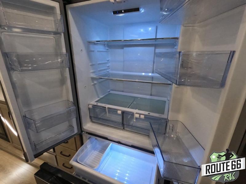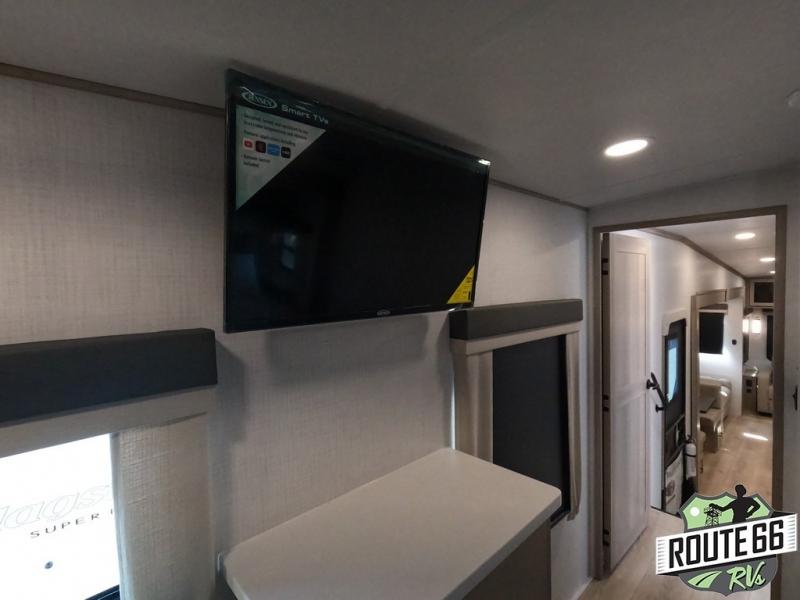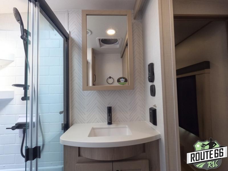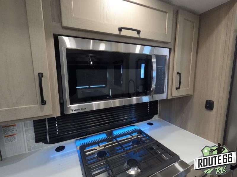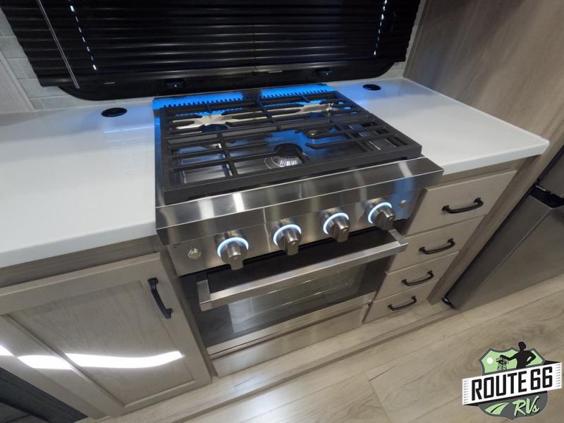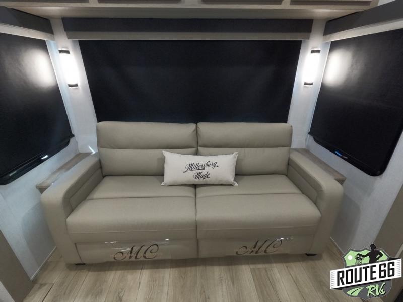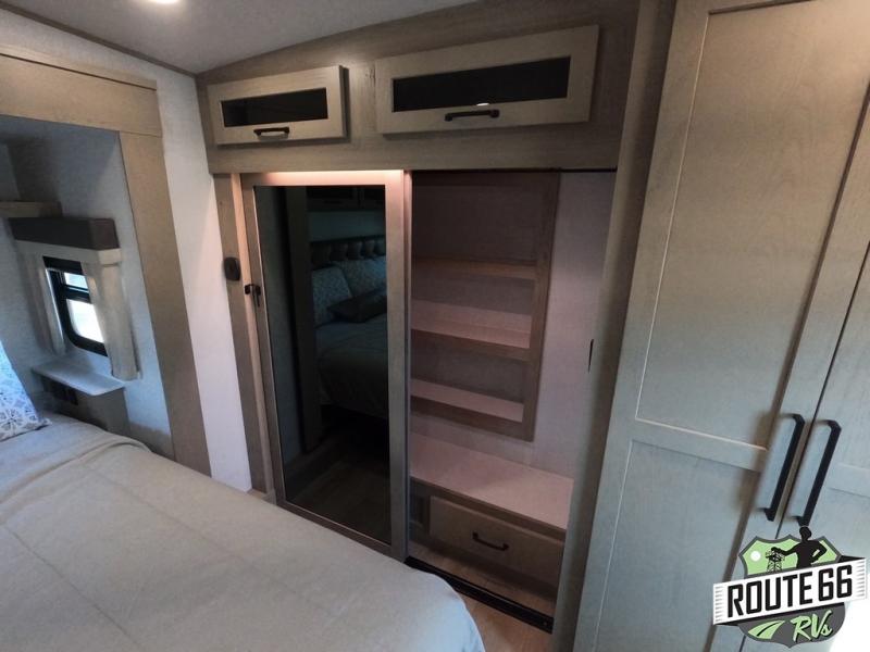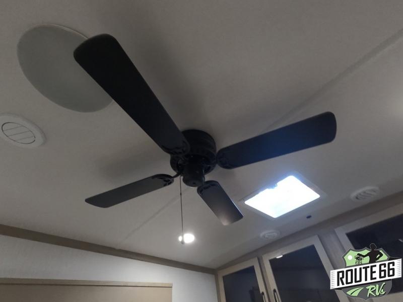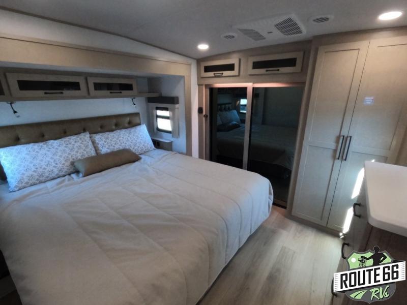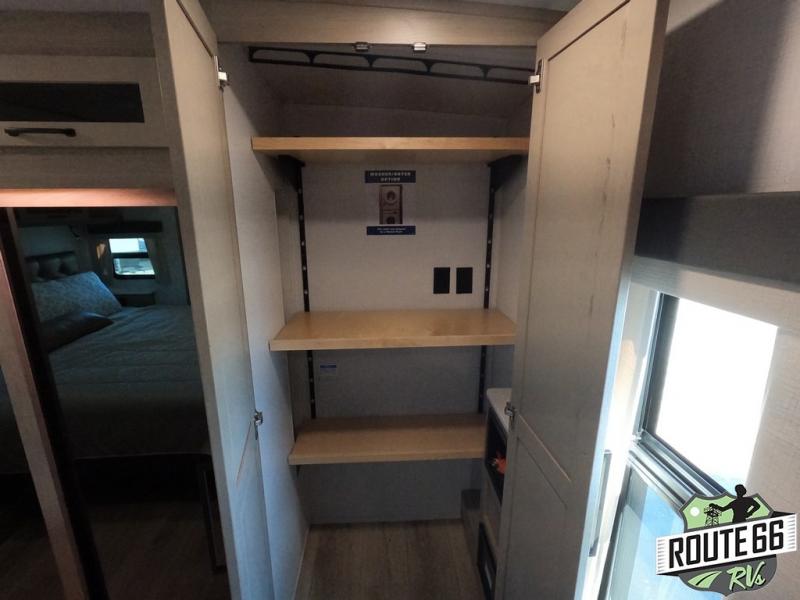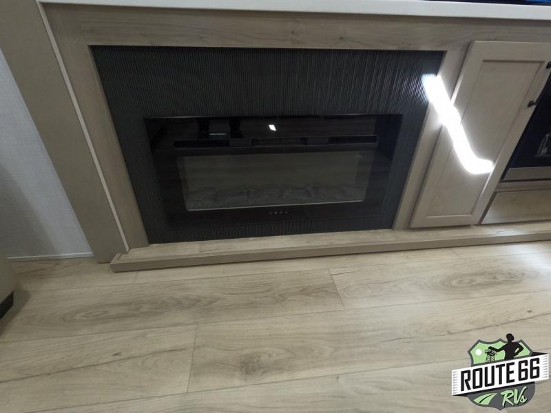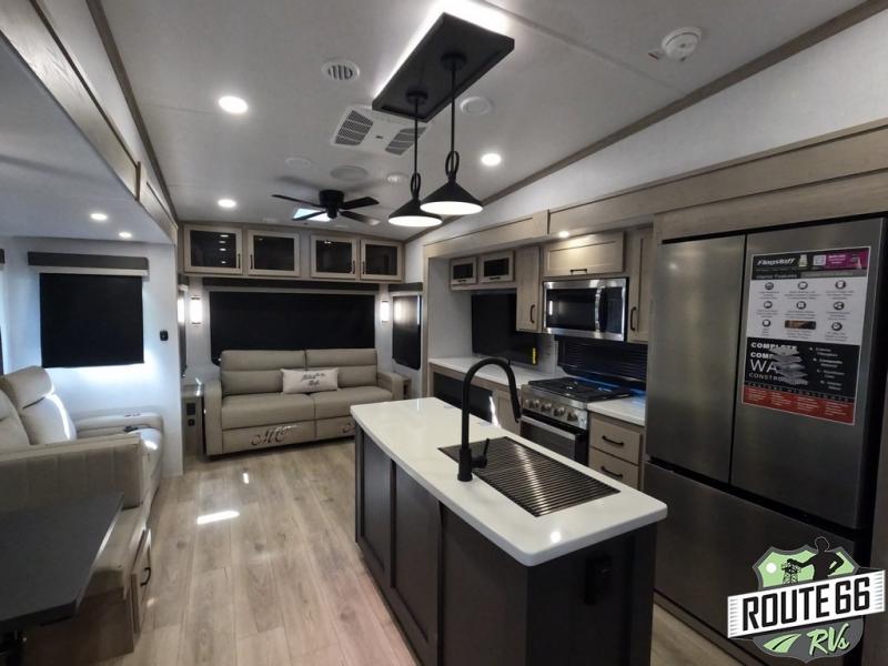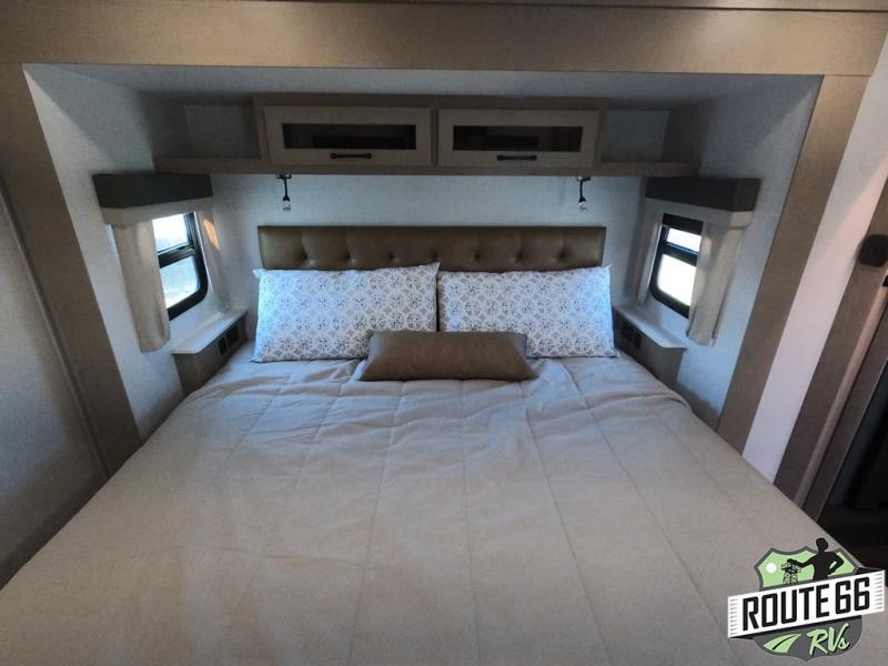 Get ready to enjoy the outdoors while inside with the enormous windows in both the rear and the door side slide of this fifth wheel. The spacious main living area offers dual opposing slides giving you a great place to invite other RVers over to visit, eat, and even play cards. There is seating for nine from the booth dinette, the theater seats, and the rear hide-a-bed sofa. The cook will have a large refrigerator to store lots of drinks and cold food, plus a pantry, and the center island offers extra counter space plus seating. After everyone has left, retire to the front bedroom with a queen bed slide, a shirt closet, a wardrobe with washer/dryer prep, plus more storage and a TV option. You might even like to choose a king bed option as well.