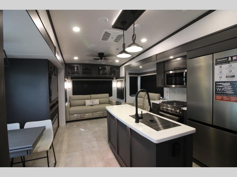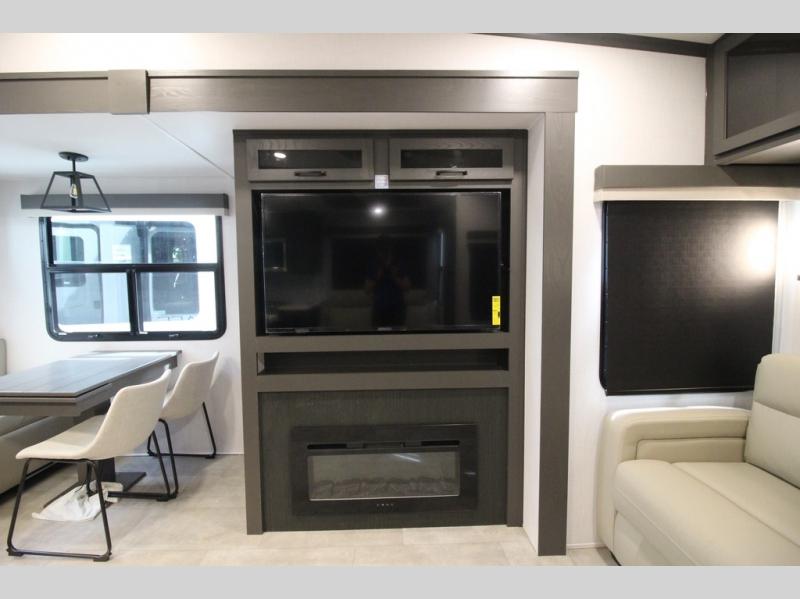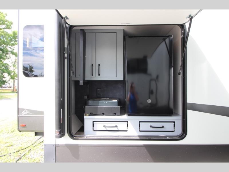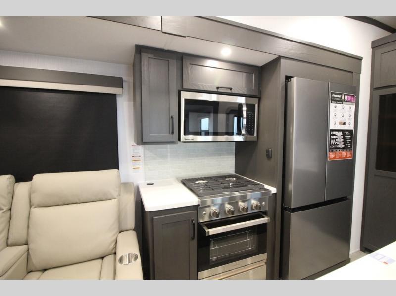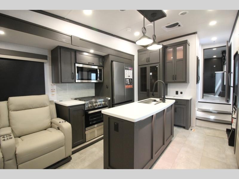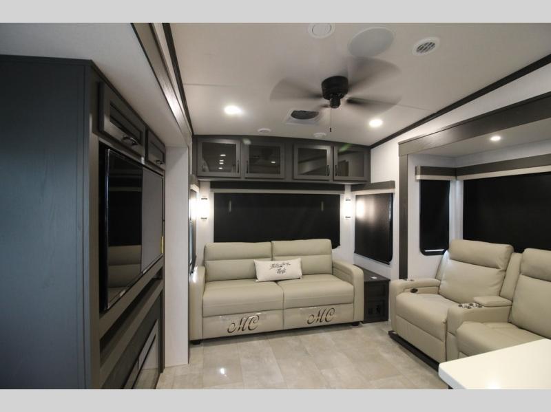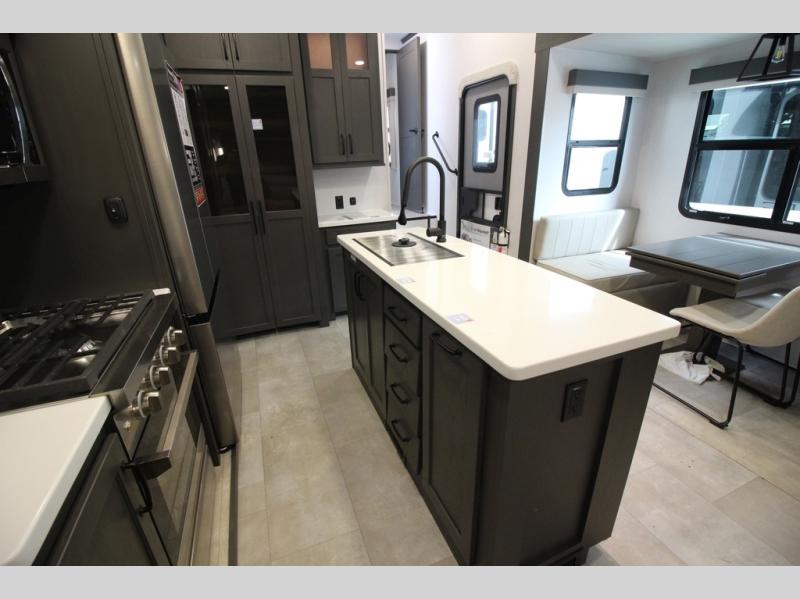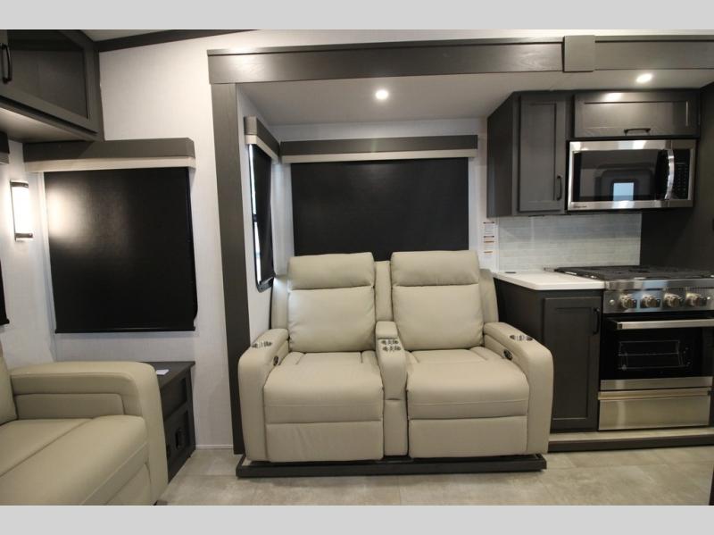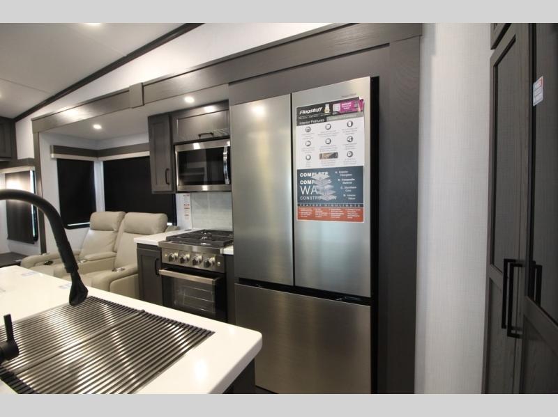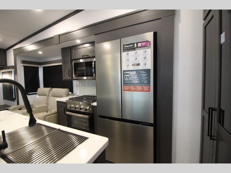 Get ready to enjoy the outdoors while inside with the enormous windows in both the rear and the door side slide of this fifth wheel. The spacious main living area offers dual opposing slides giving you a great place to invite other RVers over to visit, eat, and even play cards. There is seating for nine on the 39" chairs and bench, the theater seats, and the rear hide-a-bed sofa. The cook will have a large refrigerator to store lots of drinks and cold food, plus a pantry, and the center island offers extra counter space plus seating. After everyone has left, retire to the front bedroom with a king bed slide, a shirt closet, a wardrobe with washer/dryer prep, plus more storage and a TV option.