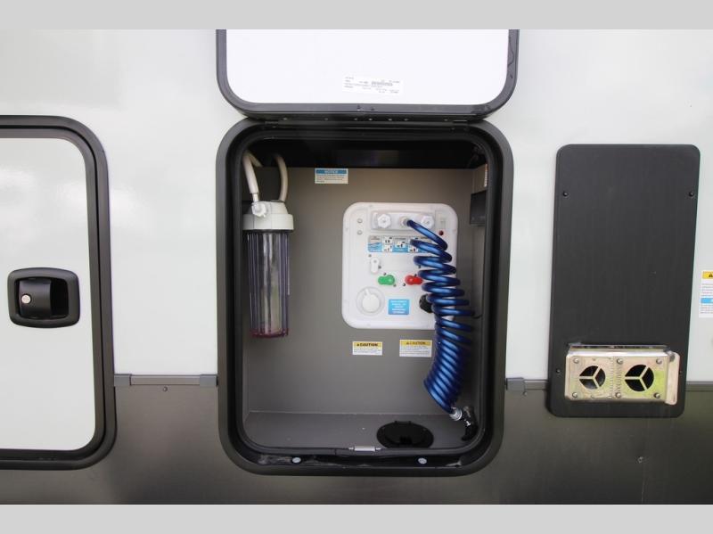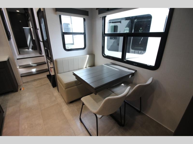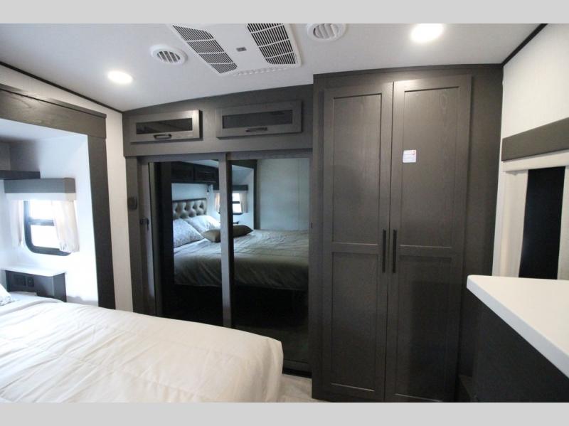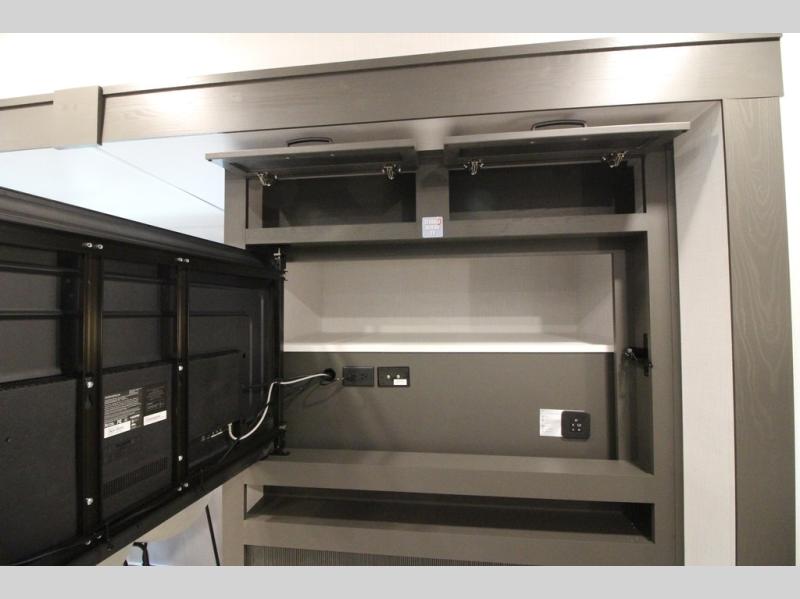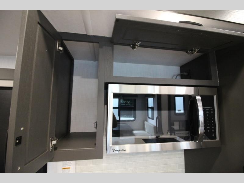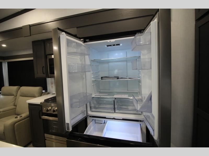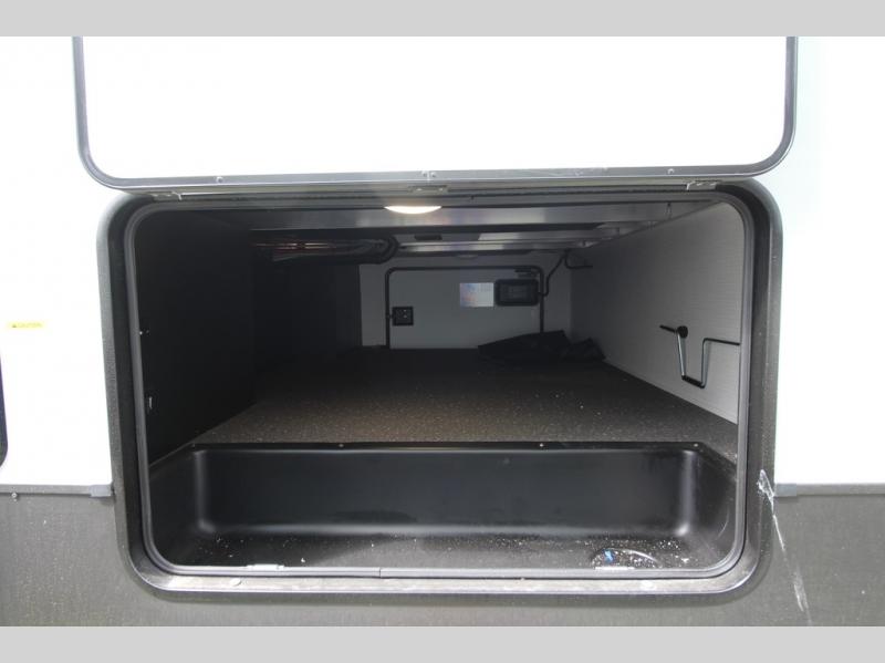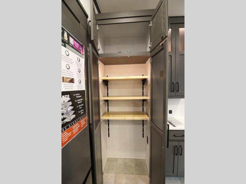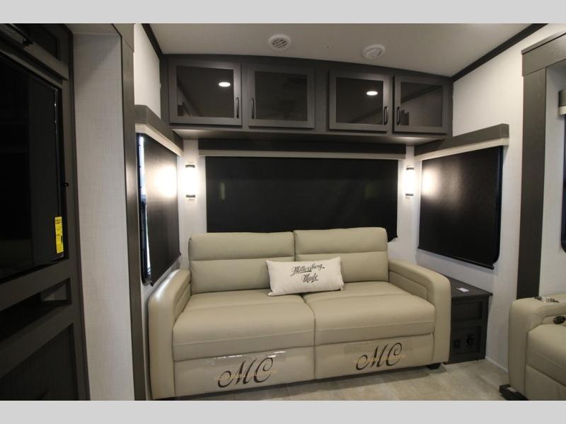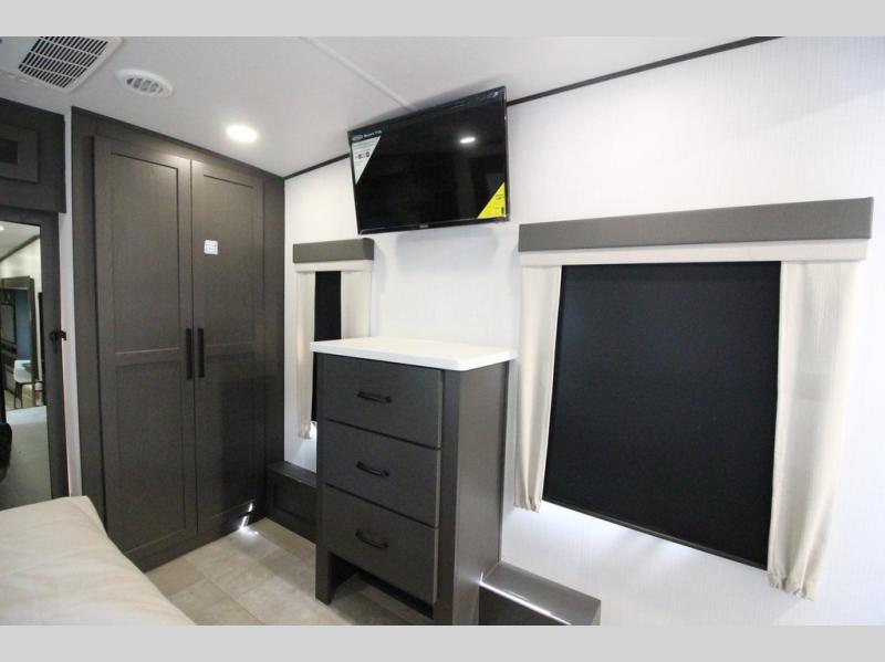 Get ready to enjoy the outdoors while inside with the enormous windows in both the rear and the door side slide of this fifth wheel. The spacious main living area offers dual opposing slides giving you a great place to invite other RVers over to visit, eat, and even play cards. There is seating for nine on the 39" chairs and bench, the theater seats, and the rear hide-a-bed sofa. The cook will have a large refrigerator to store lots of drinks and cold food, plus a pantry, and the center island offers extra counter space plus seating. After everyone has left, retire to the front bedroom with a king bed slide, a shirt closet, a wardrobe with washer/dryer prep, plus more storage and a TV option.
