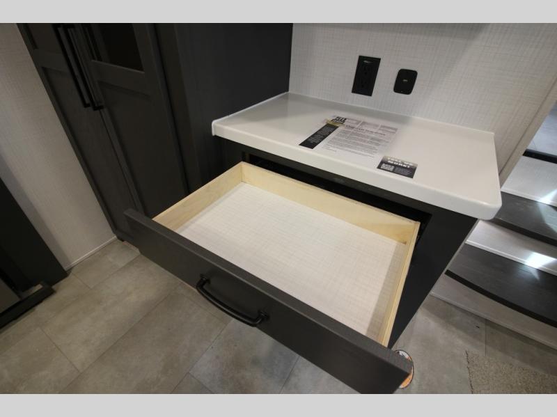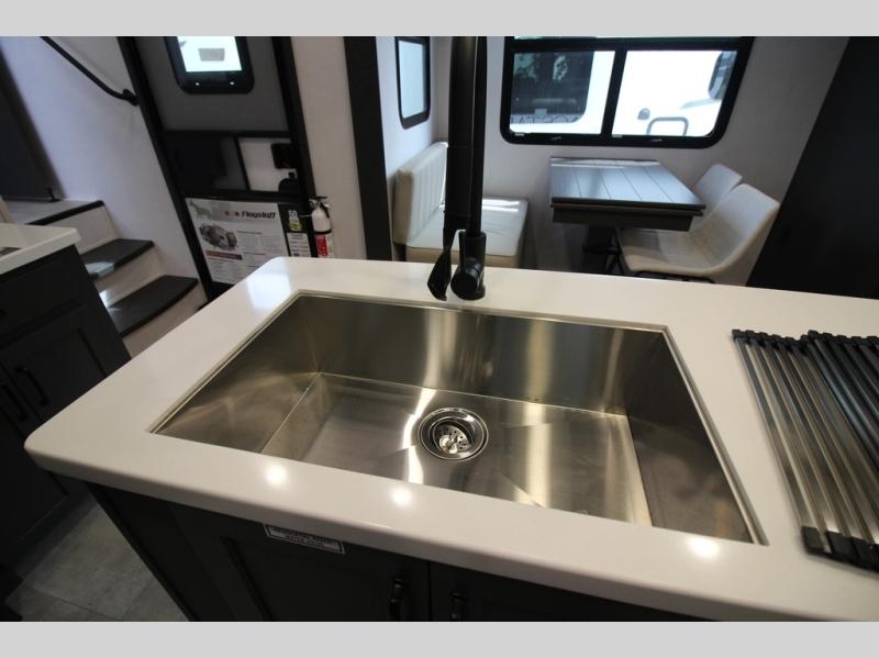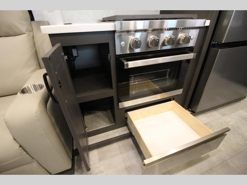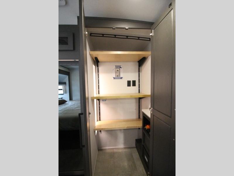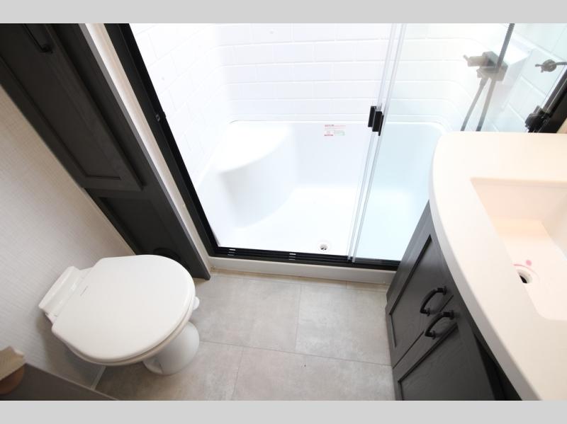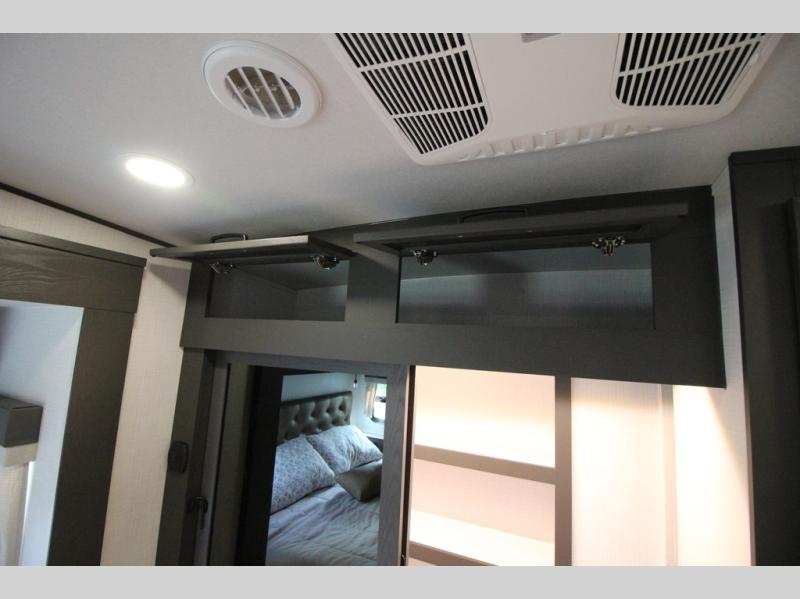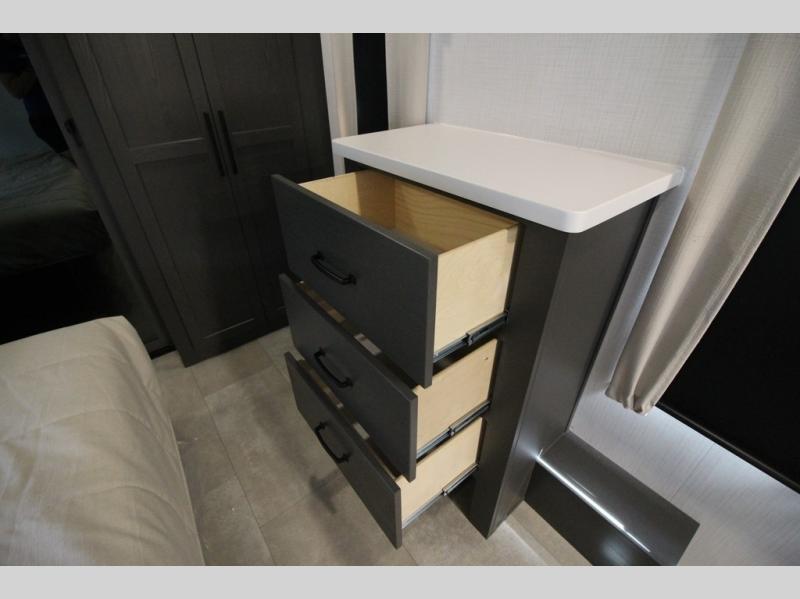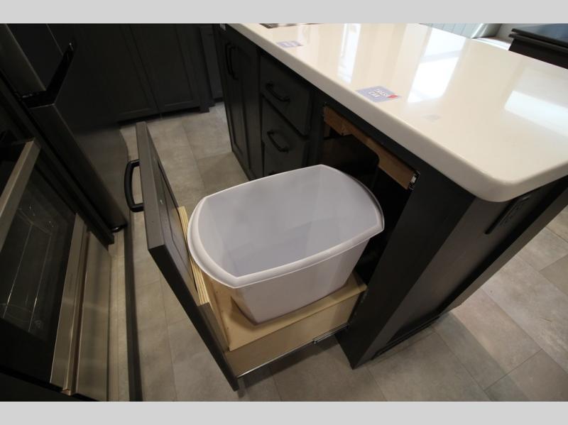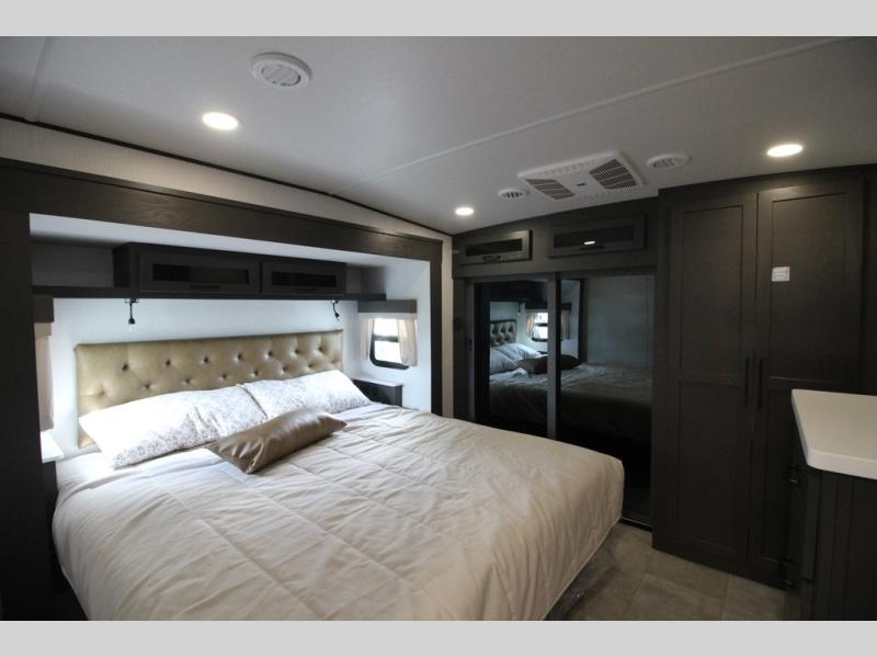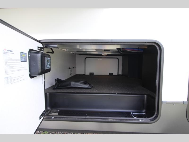 Get ready to enjoy the outdoors while inside with the enormous windows in both the rear and the door side slide of this fifth wheel. The spacious main living area offers dual opposing slides giving you a great place to invite other RVers over to visit, eat, and even play cards. There is seating for nine on the 39" chairs and bench, the theater seats, and the rear hide-a-bed sofa. The cook will have a large refrigerator to store lots of drinks and cold food, plus a pantry, and the center island offers extra counter space plus seating. After everyone has left, retire to the front bedroom with a king bed slide, a shirt closet, a wardrobe with washer/dryer prep, plus more storage and a TV option.