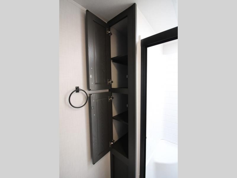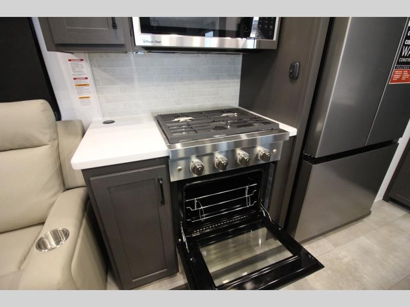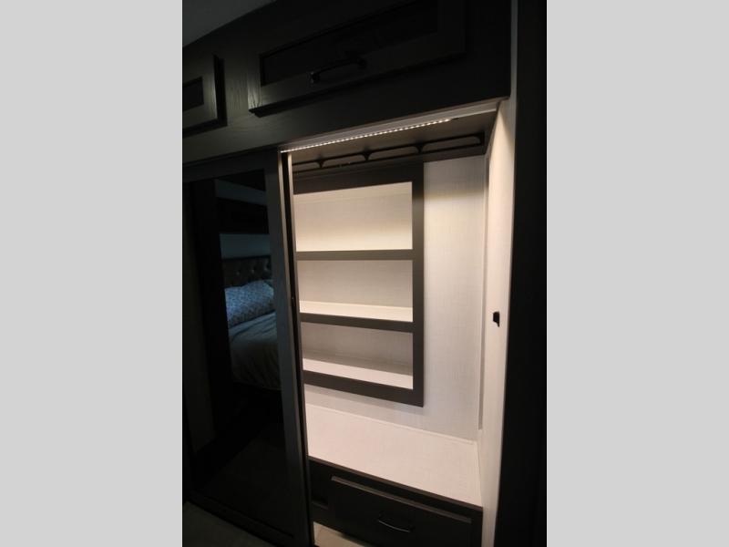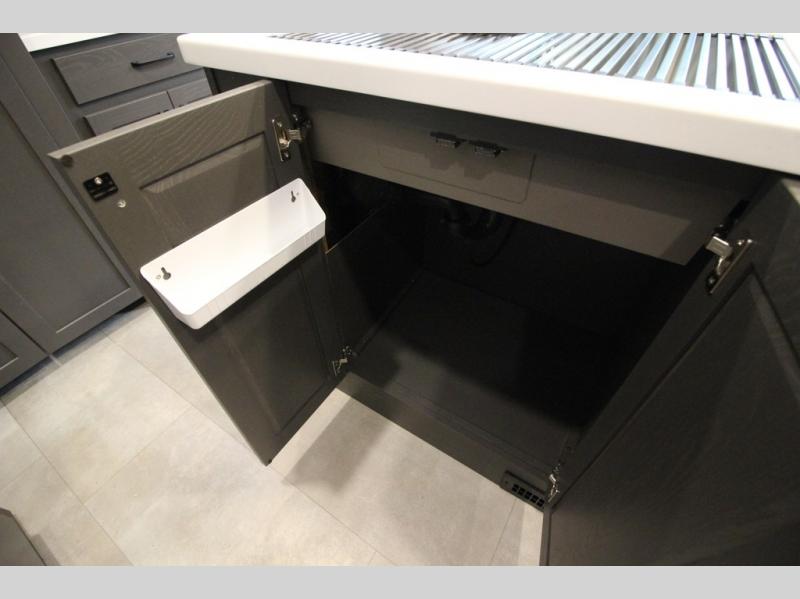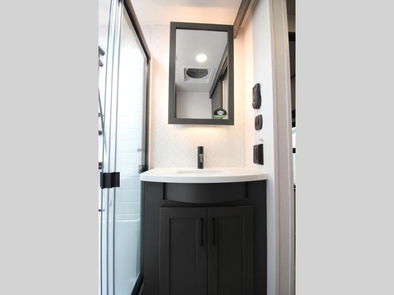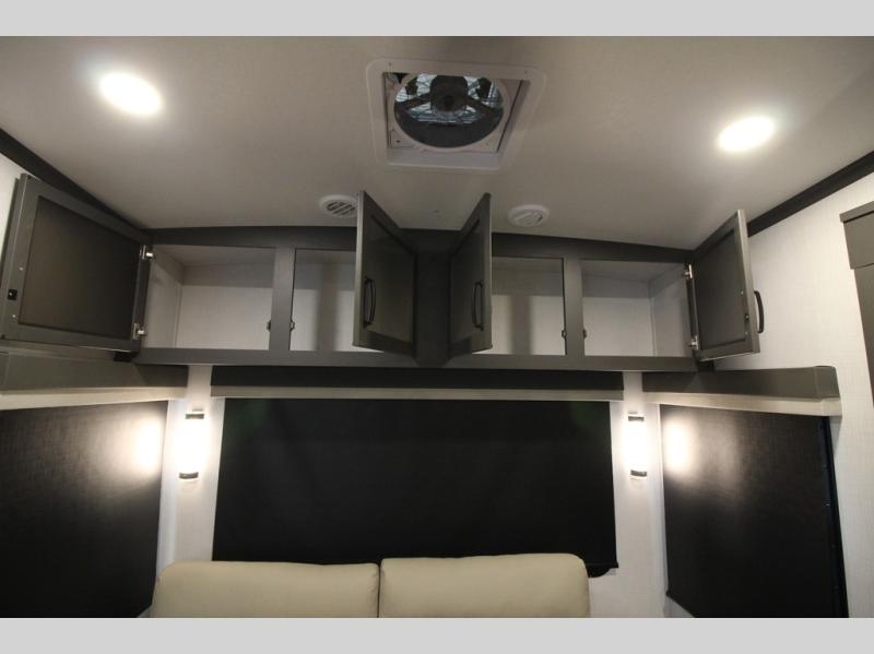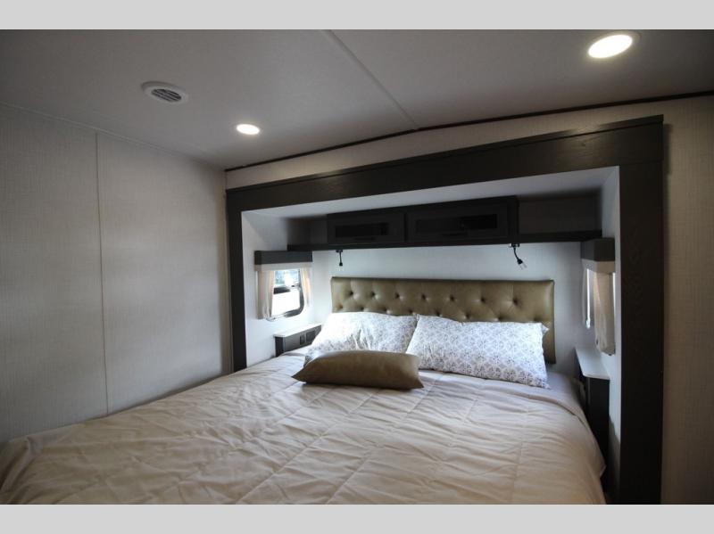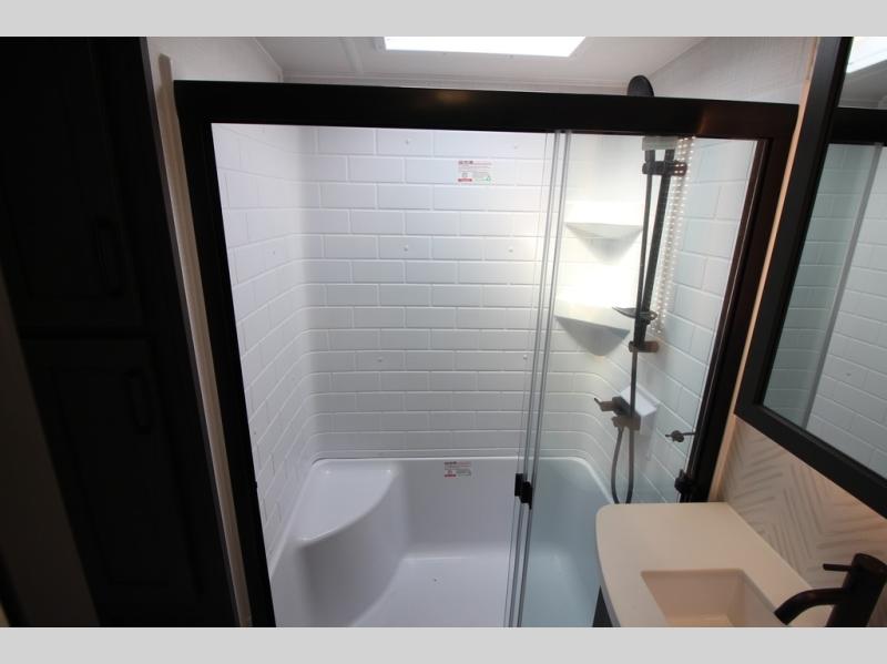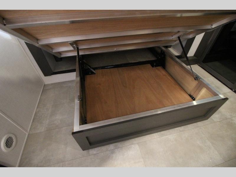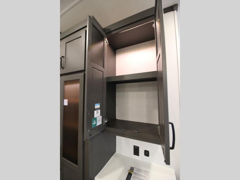 Get ready to enjoy the outdoors while inside with the enormous windows in both the rear and the door side slide of this fifth wheel. The spacious main living area offers dual opposing slides giving you a great place to invite other RVers over to visit, eat, and even play cards. There is seating for nine on the 39" chairs and bench, the theater seats, and the rear hide-a-bed sofa. The cook will have a large refrigerator to store lots of drinks and cold food, plus a pantry, and the center island offers extra counter space plus seating. After everyone has left, retire to the front bedroom with a king bed slide, a shirt closet, a wardrobe with washer/dryer prep, plus more storage and a TV option.