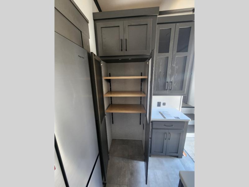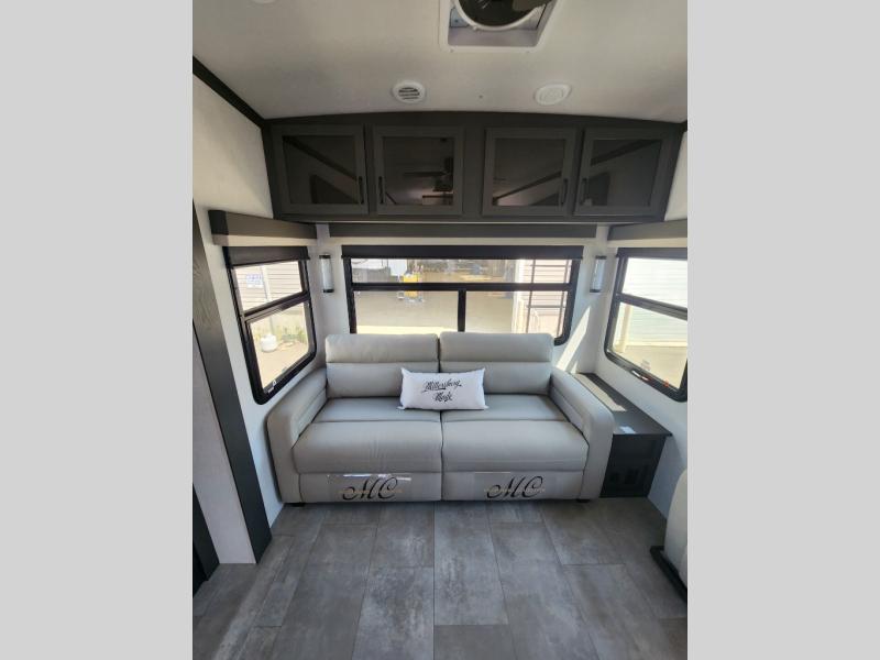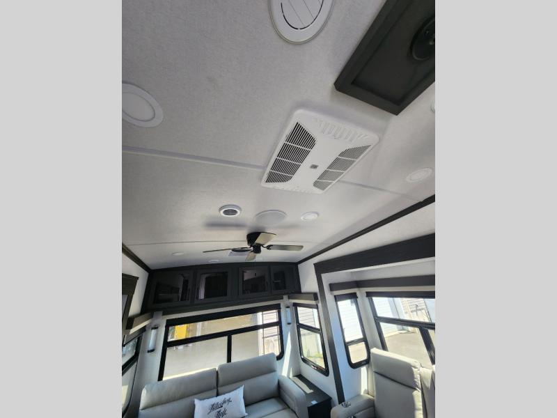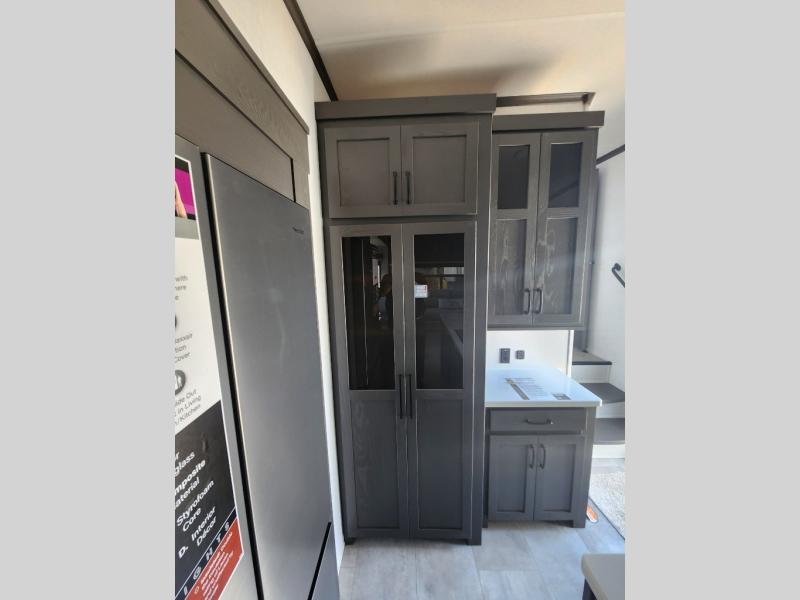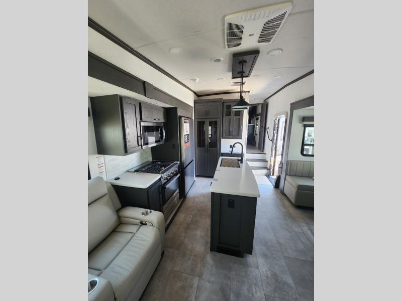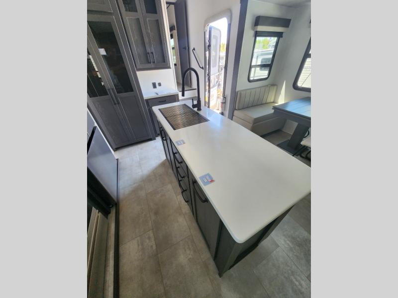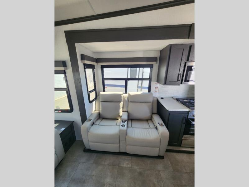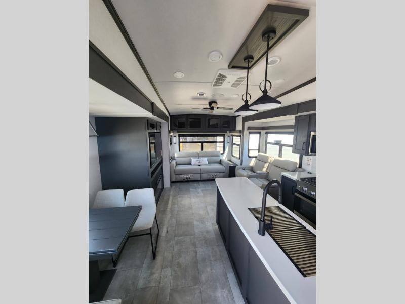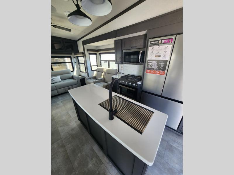 Get ready to enjoy the outdoors while inside with the enormous windows in both the rear and the door side slide of this fifth wheel. The spacious main living area offers dual opposing slides giving you a great place to invite other RVers over to visit, eat, and even play cards. There is seating for nine on the 39" chairs and bench, the theater seats, and the rear hide-a-bed sofa. The cook will have a large refrigerator to store lots of drinks and cold food, plus a pantry, and the center island offers extra counter space plus seating. After everyone has left, retire to the front bedroom with a king bed slide, a shirt closet, a wardrobe with washer/dryer prep, plus more storage and a TV option.