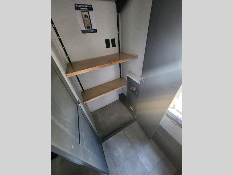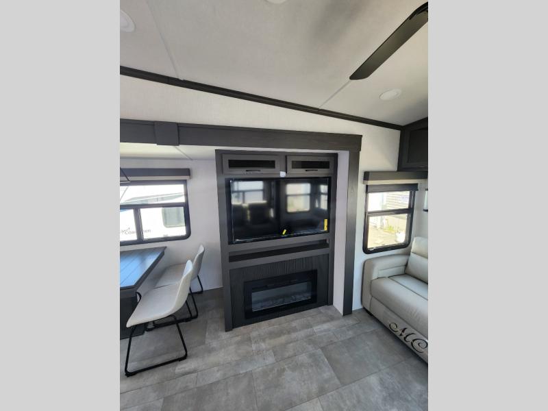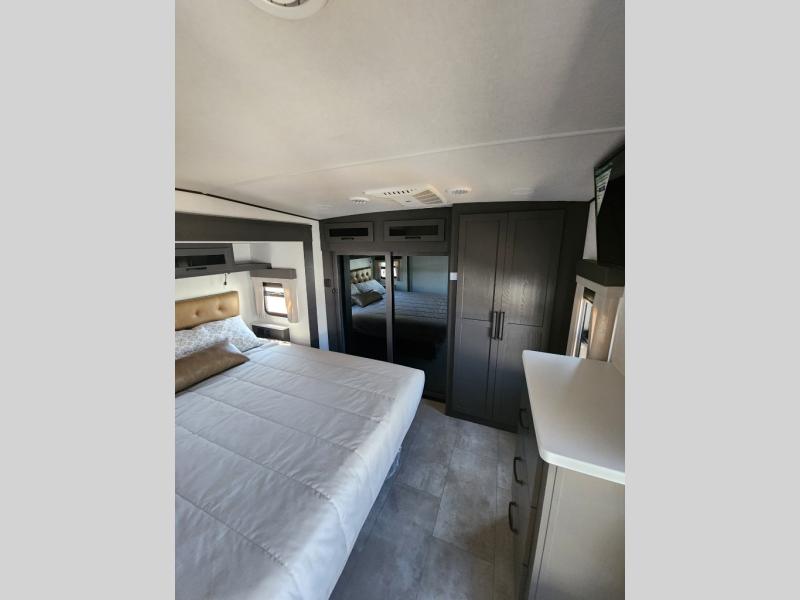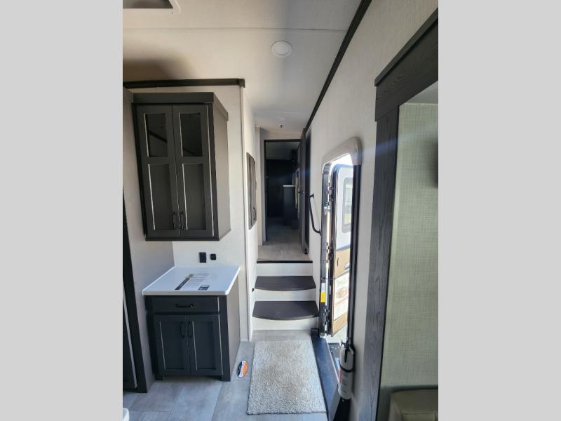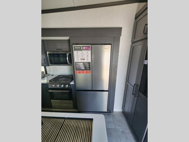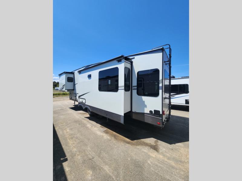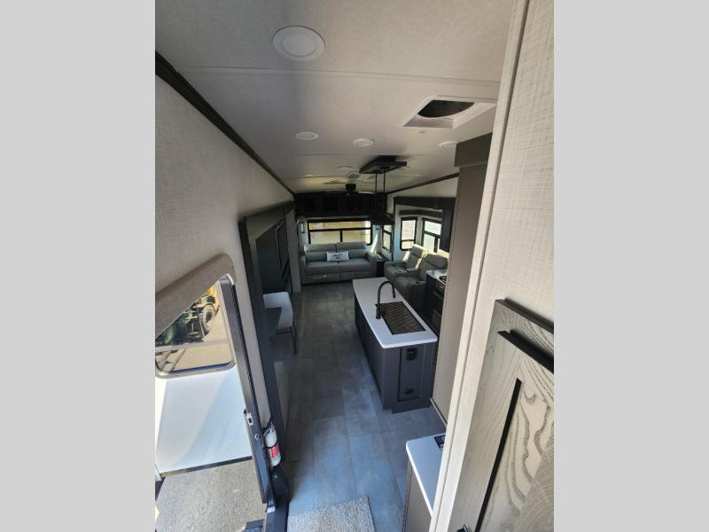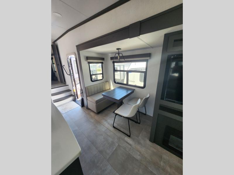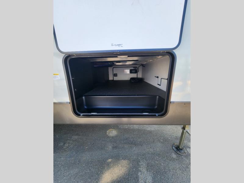 Get ready to enjoy the outdoors while inside with the enormous windows in both the rear and the door side slide of this fifth wheel. The spacious main living area offers dual opposing slides giving you a great place to invite other RVers over to visit, eat, and even play cards. There is seating for nine on the 39" chairs and bench, the theater seats, and the rear hide-a-bed sofa. The cook will have a large refrigerator to store lots of drinks and cold food, plus a pantry, and the center island offers extra counter space plus seating. After everyone has left, retire to the front bedroom with a king bed slide, a shirt closet, a wardrobe with washer/dryer prep, plus more storage and a TV option.