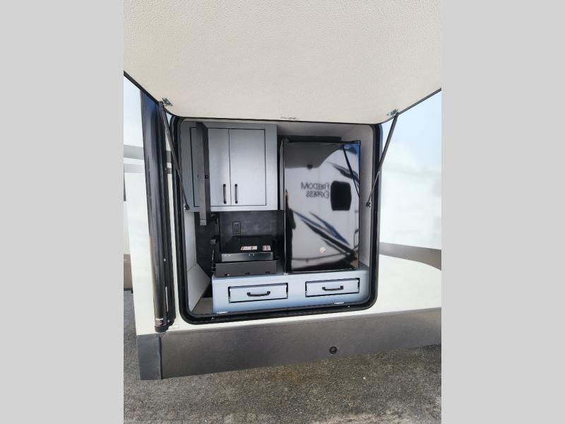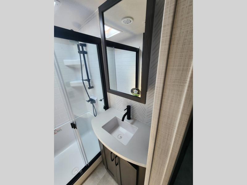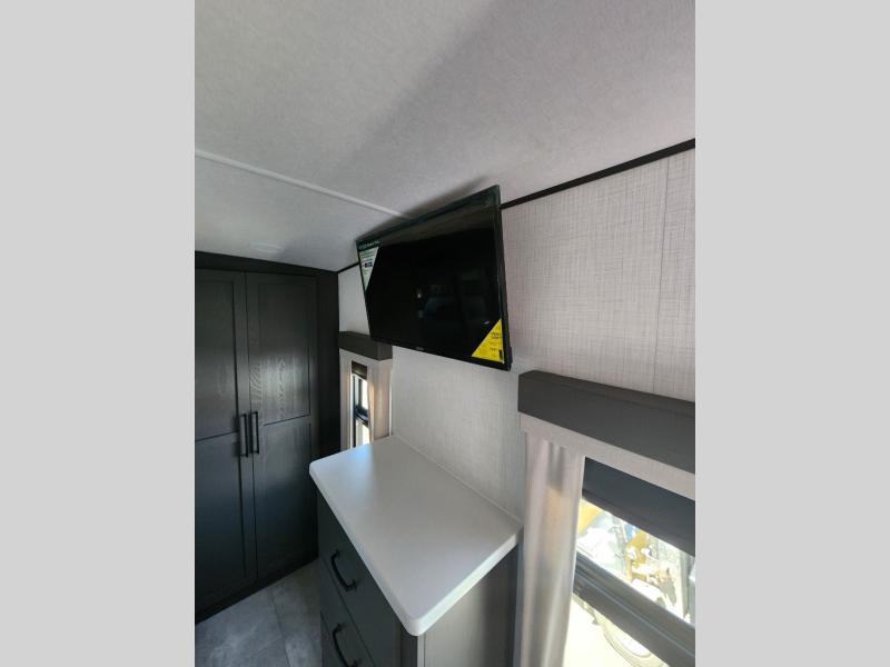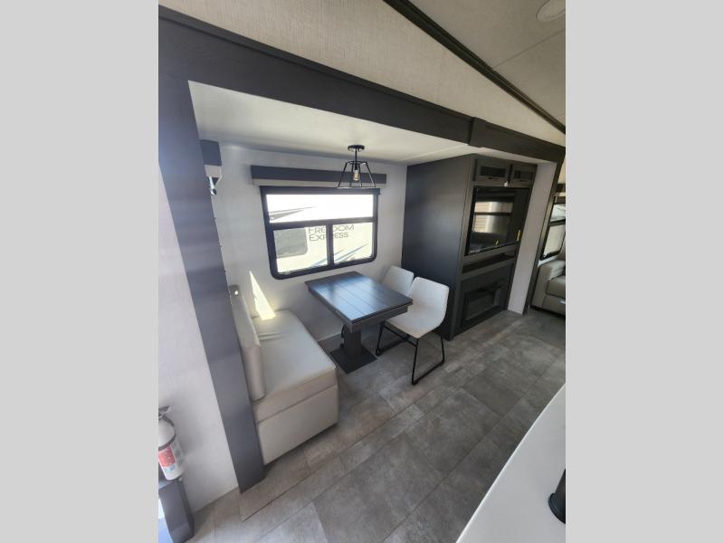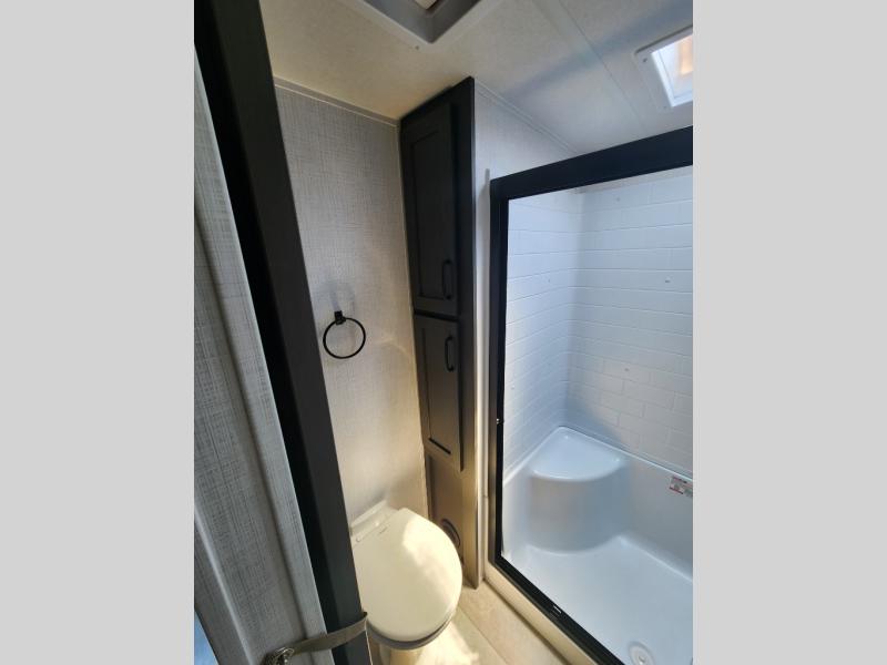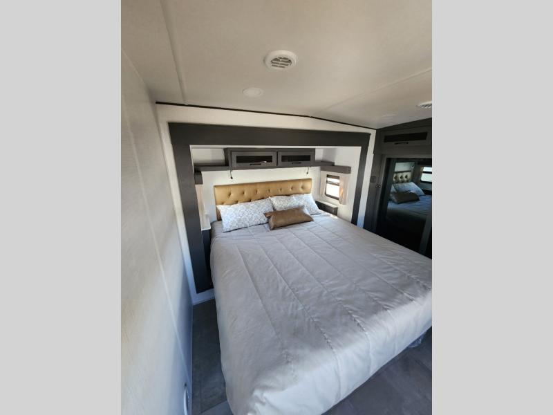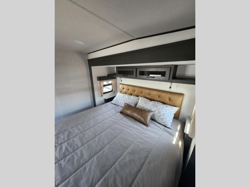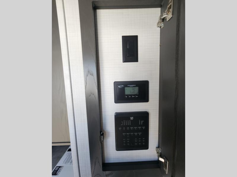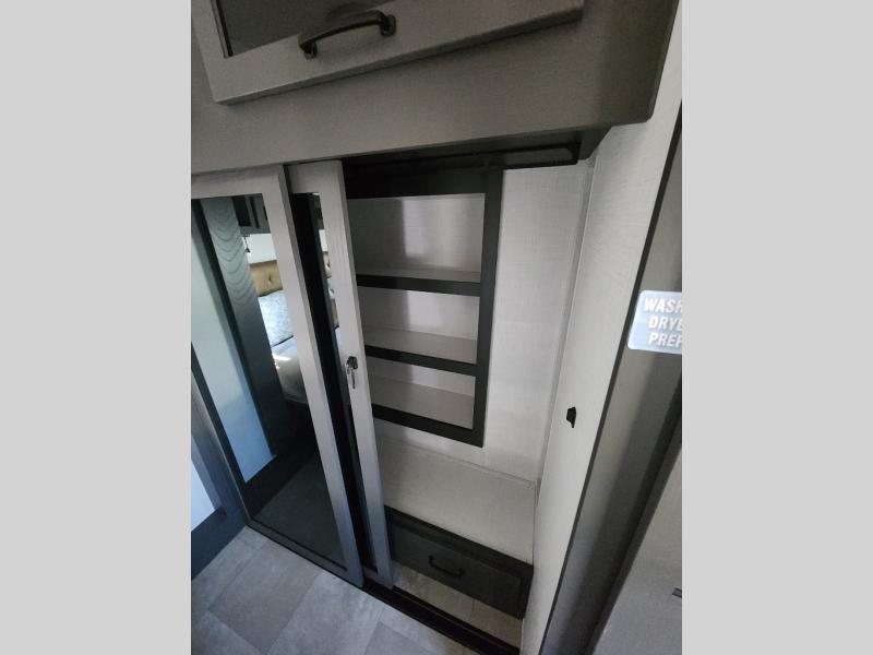 Get ready to enjoy the outdoors while inside with the enormous windows in both the rear and the door side slide of this fifth wheel. The spacious main living area offers dual opposing slides giving you a great place to invite other RVers over to visit, eat, and even play cards. There is seating for nine on the 39" chairs and bench, the theater seats, and the rear hide-a-bed sofa. The cook will have a large refrigerator to store lots of drinks and cold food, plus a pantry, and the center island offers extra counter space plus seating. After everyone has left, retire to the front bedroom with a king bed slide, a shirt closet, a wardrobe with washer/dryer prep, plus more storage and a TV option.