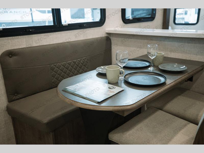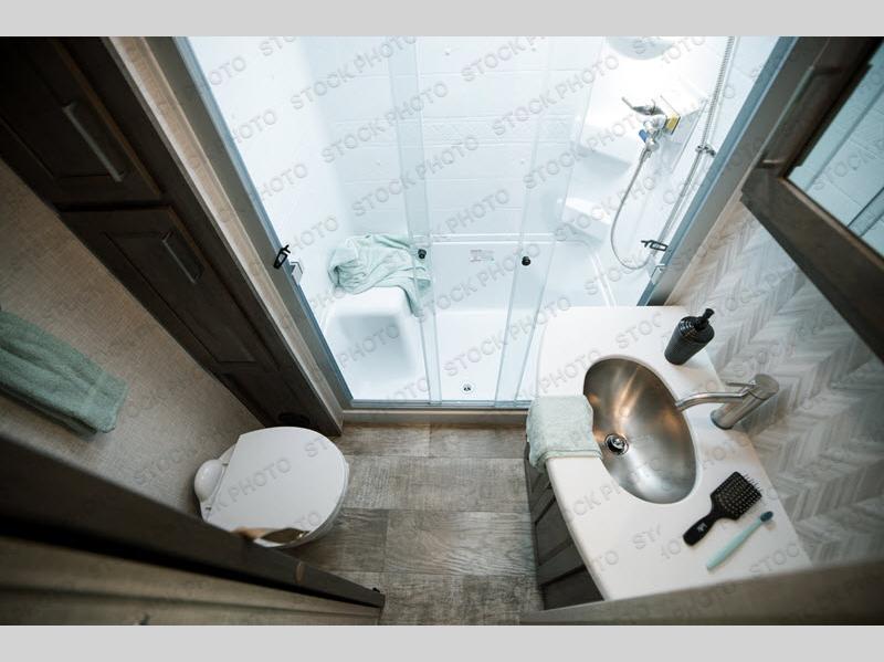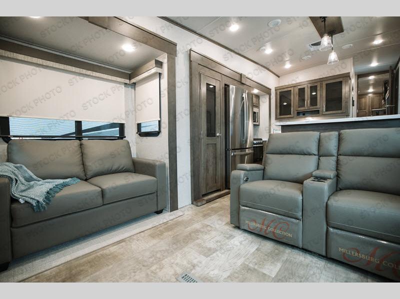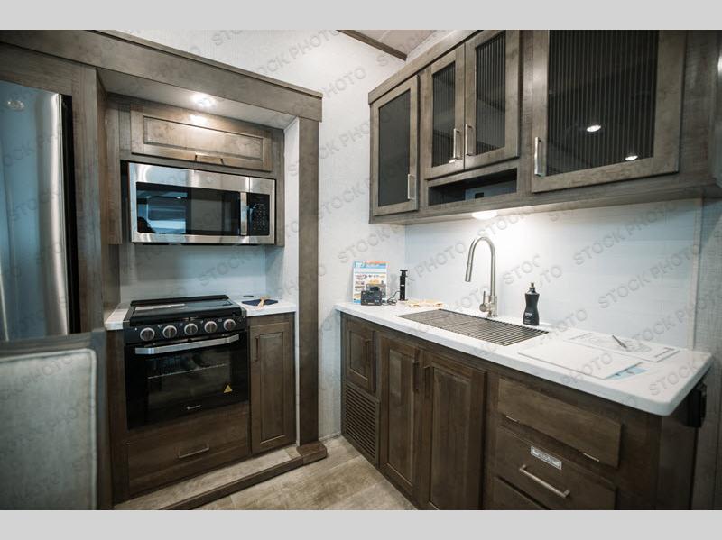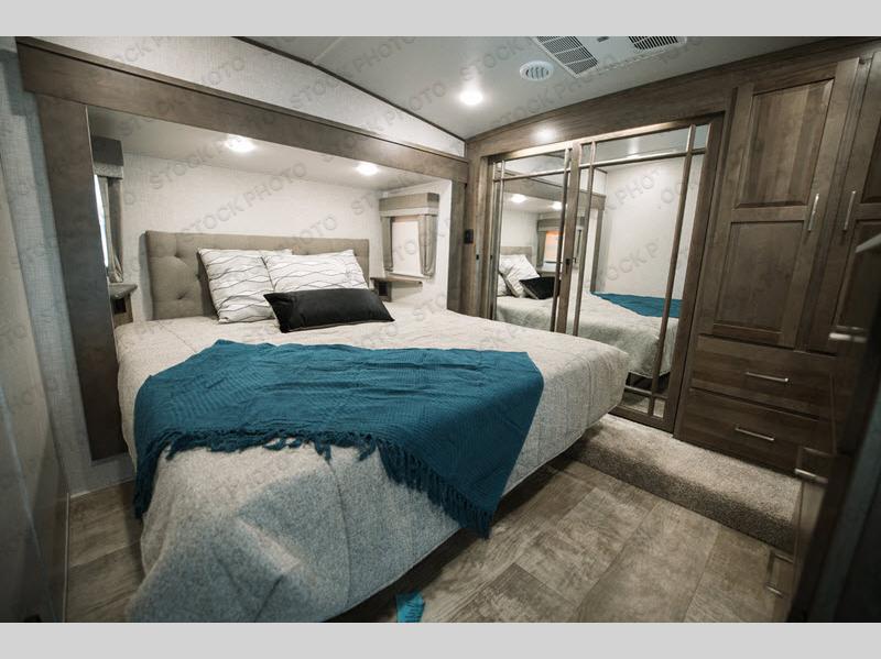 You will love the rear living area with a full wall entertainment center including a fireplace, a ceiling fan, and dual opposing hide-a-bed sofas, plus theater seats! The middle kitchen area gives the cook full amenities including an 18 cu. ft. refrigerator, and a unique dinette with bench seating and two chairs. You can even relax outside under the two awnings, and you will find a pass-through compartment and more exterior storage included in the front for all your outdoor gear. When you are ready for bedtime, get cleaned up in the full bathroom and you can even take a seat while showering, and the front master gives you a queen bed slide, a dresser, and a full wall wardrobe plus shelves within the cabinet.