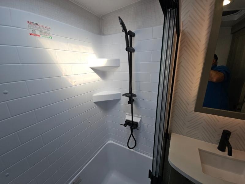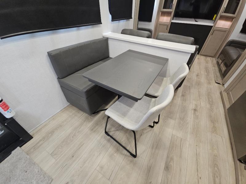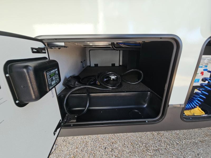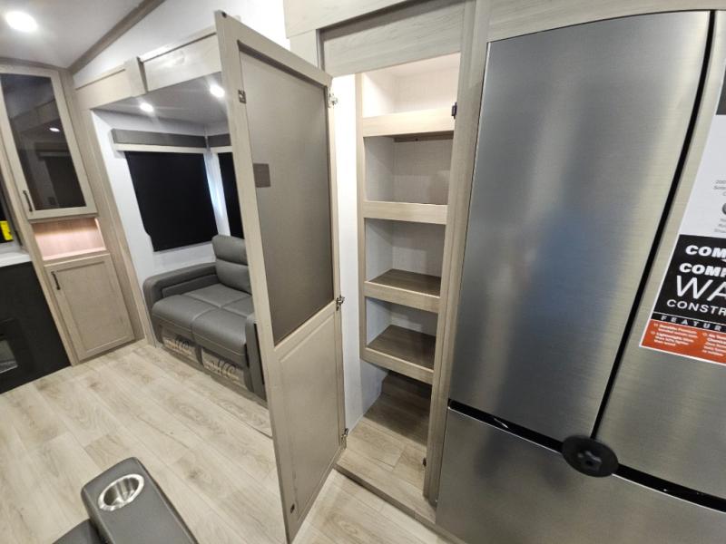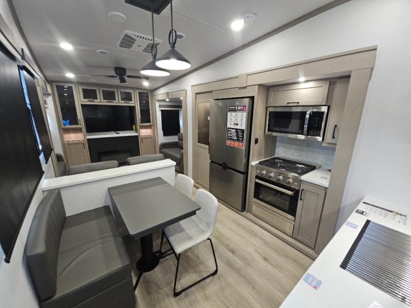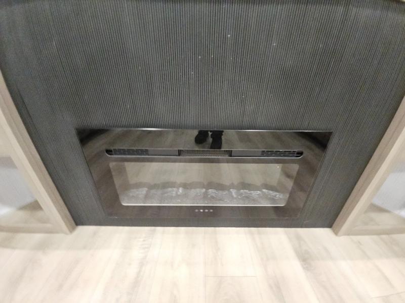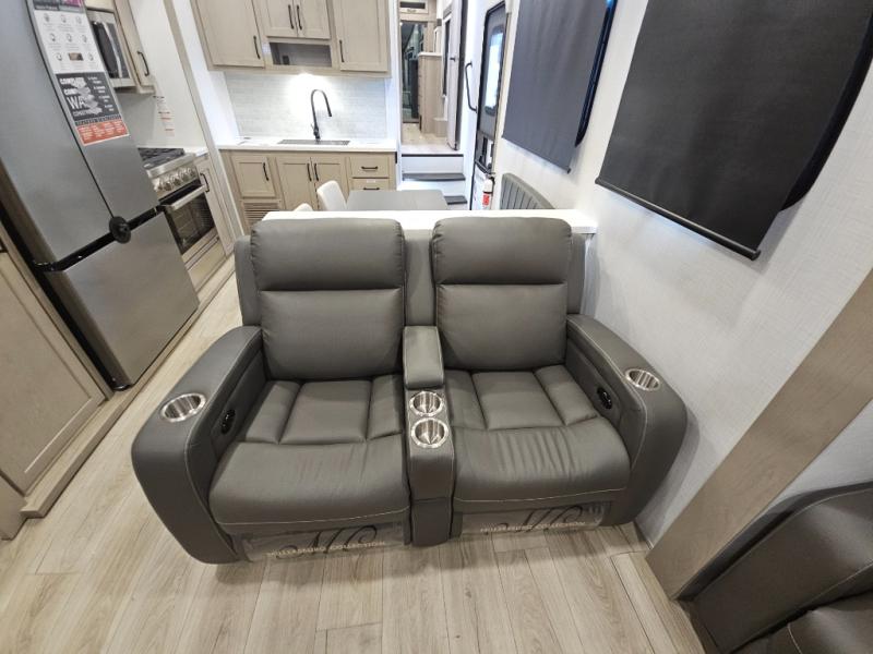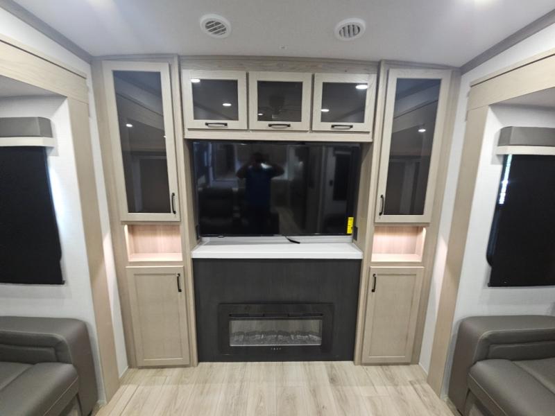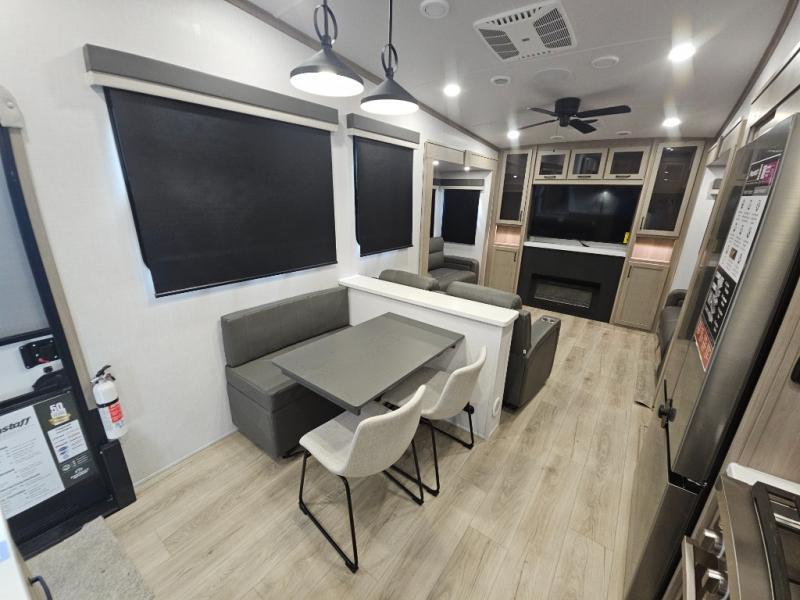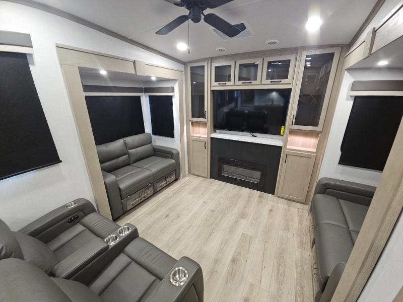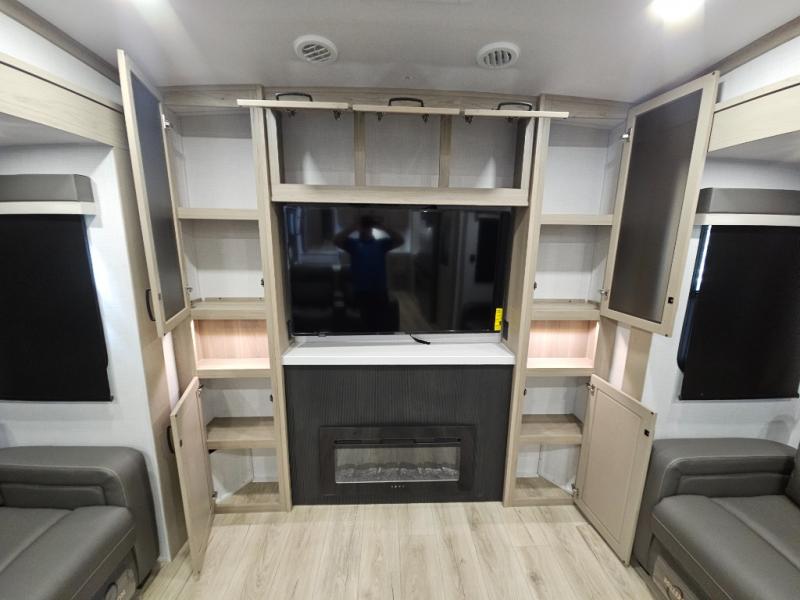 You will love the rear living area with a full wall entertainment center including a fireplace, a ceiling fan, and dual opposing hide-a-bed sofas, plus theater seats! The middle kitchen area gives the cook full amenities including an 18 cu. ft. refrigerator, and a unique dinette with bench seating and two chairs. You can even relax outside under the two awnings, and you will find a pass-through compartment and more exterior storage included in the front for all your outdoor gear. When you are ready for bedtime, get cleaned up in the full bathroom and you can even take a seat while showering, and the front master gives you a queen bed slide, a dresser, and a full wall wardrobe plus shelves within the cabinet.