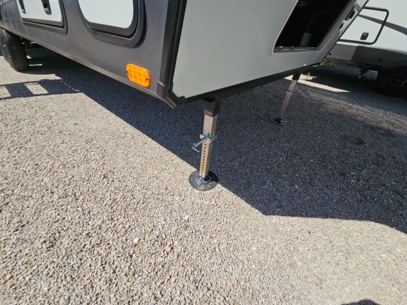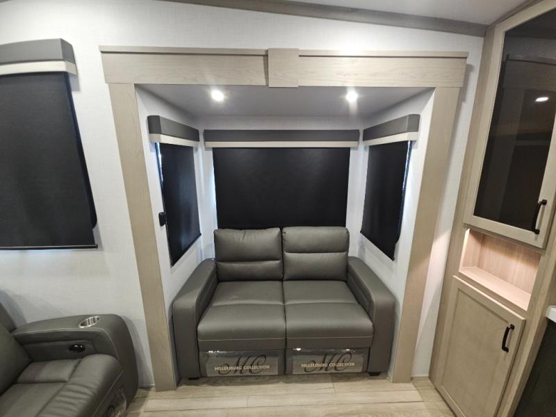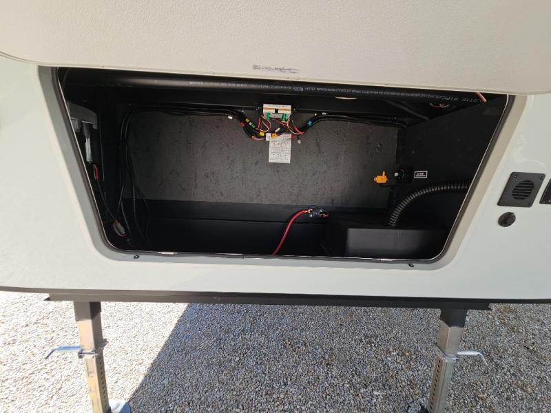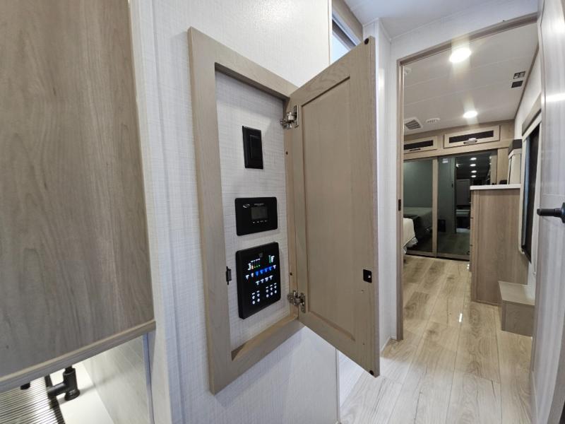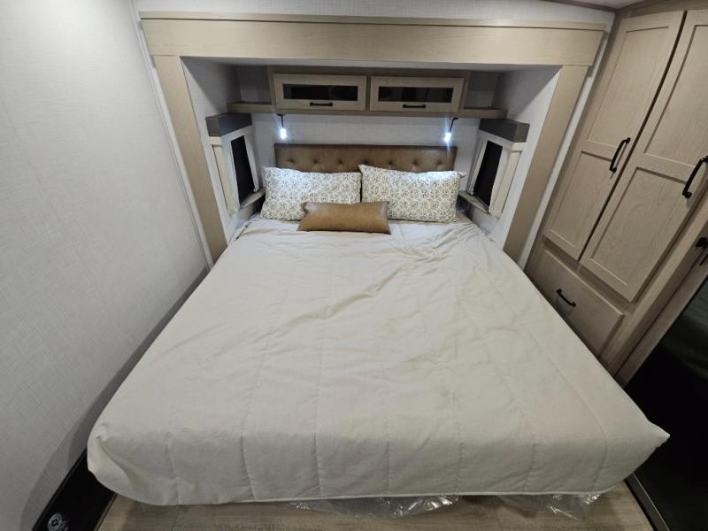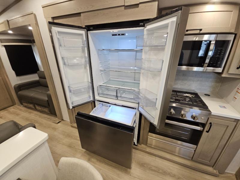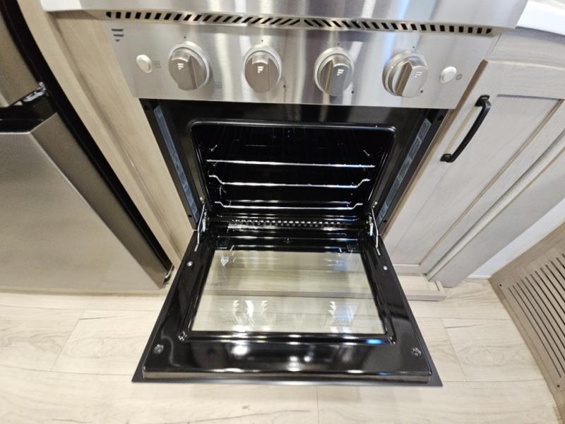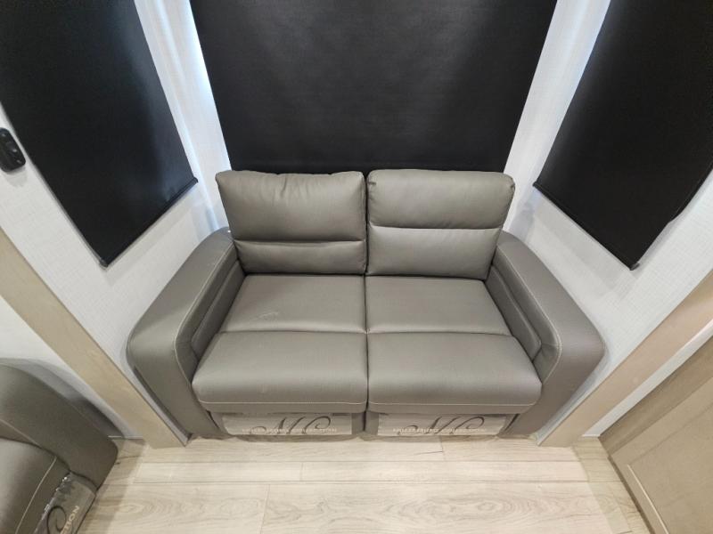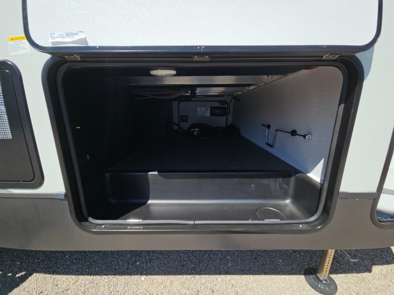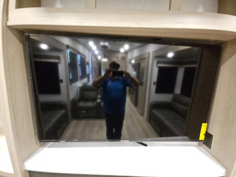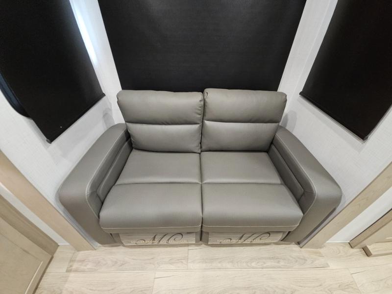 You will love the rear living area with a full wall entertainment center including a fireplace, a ceiling fan, and dual opposing hide-a-bed sofas, plus theater seats! The middle kitchen area gives the cook full amenities including an 18 cu. ft. refrigerator, and a unique dinette with bench seating and two chairs. You can even relax outside under the two awnings, and you will find a pass-through compartment and more exterior storage included in the front for all your outdoor gear. When you are ready for bedtime, get cleaned up in the full bathroom and you can even take a seat while showering, and the front master gives you a queen bed slide, a dresser, and a full wall wardrobe plus shelves within the cabinet.