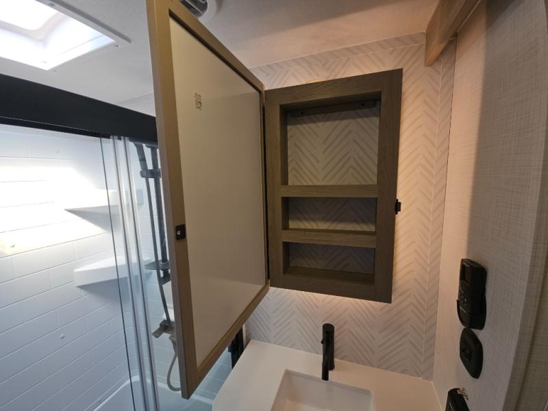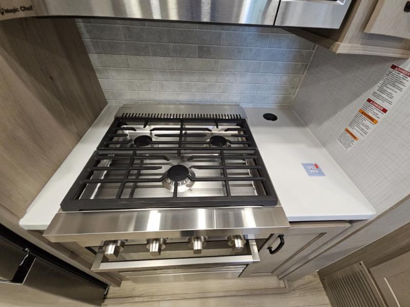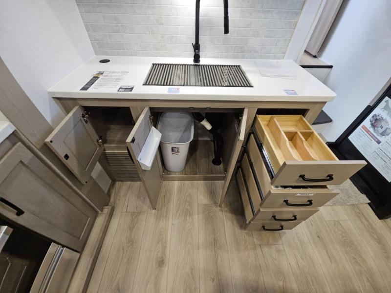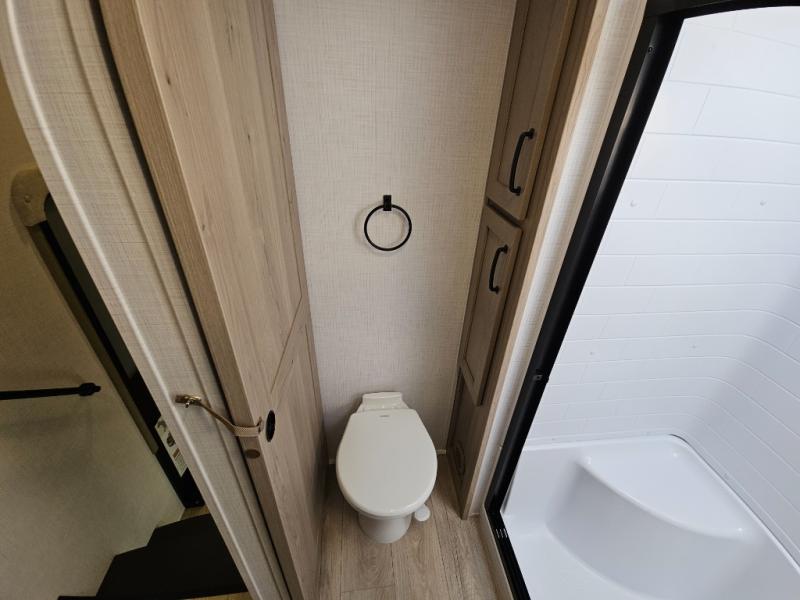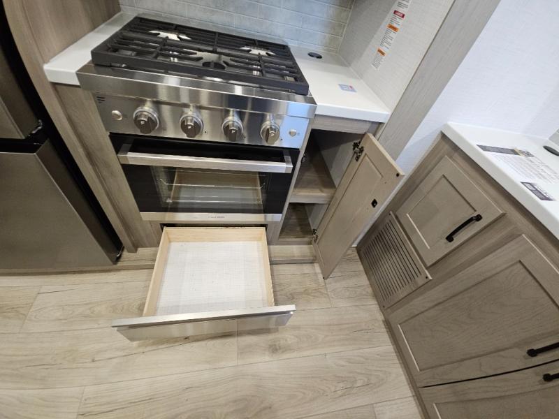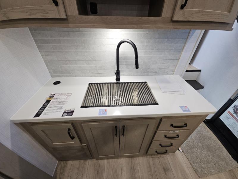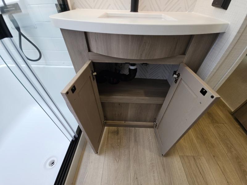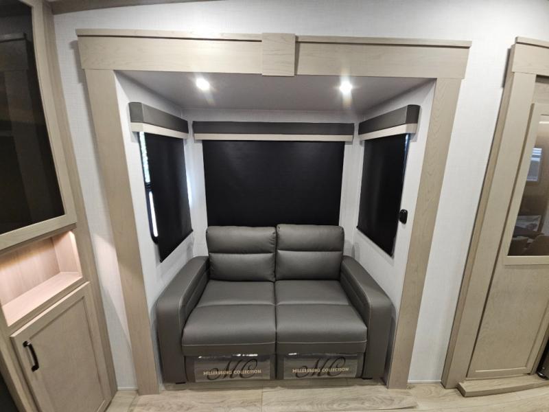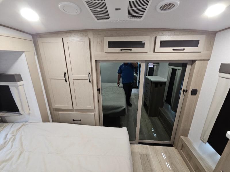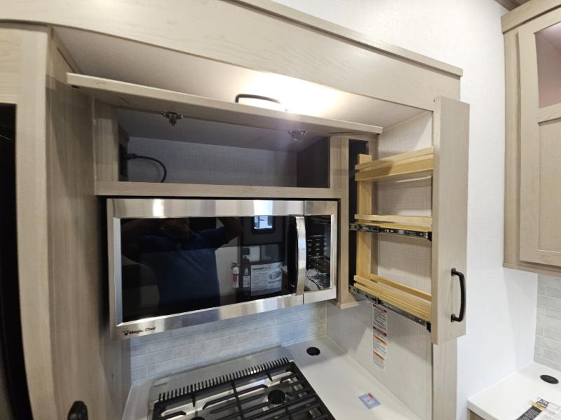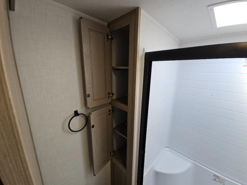 You will love the rear living area with a full wall entertainment center including a fireplace, a ceiling fan, and dual opposing hide-a-bed sofas, plus theater seats! The middle kitchen area gives the cook full amenities including an 18 cu. ft. refrigerator, and a unique dinette with bench seating and two chairs. You can even relax outside under the two awnings, and you will find a pass-through compartment and more exterior storage included in the front for all your outdoor gear. When you are ready for bedtime, get cleaned up in the full bathroom and you can even take a seat while showering, and the front master gives you a queen bed slide, a dresser, and a full wall wardrobe plus shelves within the cabinet.