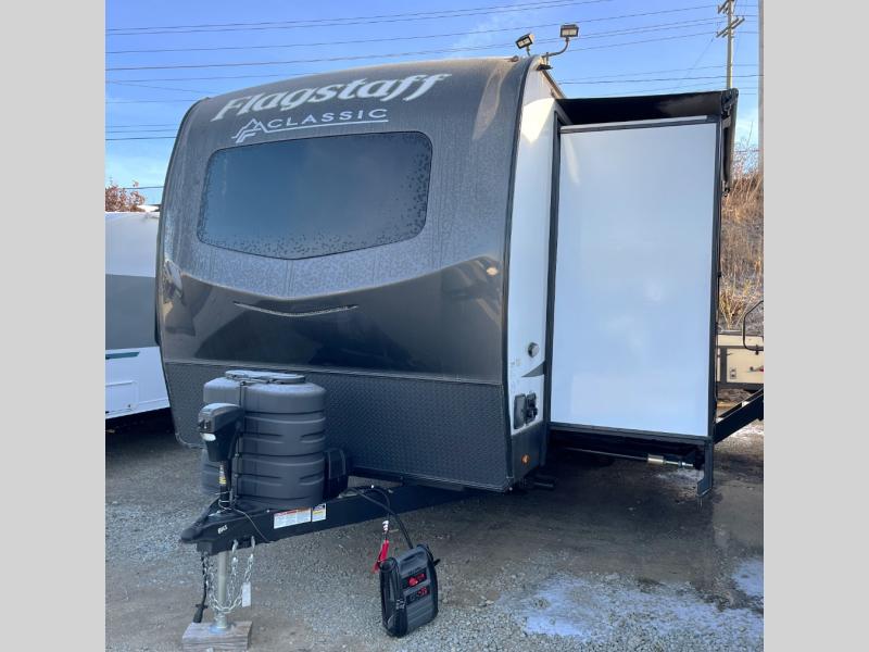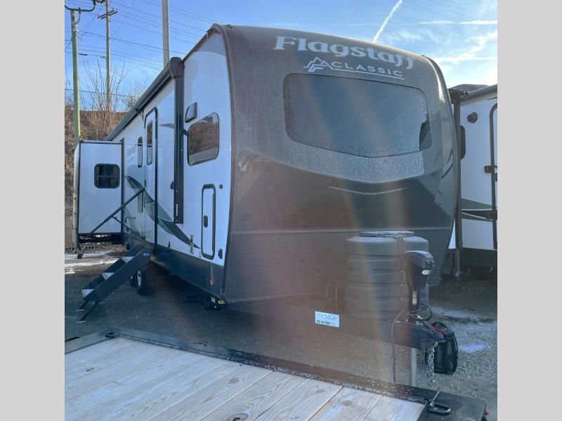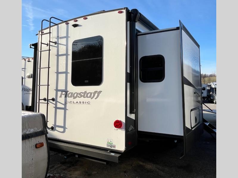 Each one of these Forest River Flagstaff Classic fifth wheels or travel trailers will be your home on wheels! Their quality craftsmanship and attention to detail shines through the surface-coated steel I-beam frame on fifth wheels, the enclosed underbelly, the radius roof with vaulted interior ceilings, and six-sided fully aluminum-framed floor, walls, and roof. Towing your unit will be easy with the torsion axle, Rubber-Ryde suspension, and nitrogen-filled Goodyear Endurance tires. You will even reduce your use of water with the Showermiser water saving system in the bathroom. A few other convenient features you will enjoy include a control panel with WeRV app control, designer headboard and bedding, and an outside shower with hot and cold water. Come choose your favorite one today!