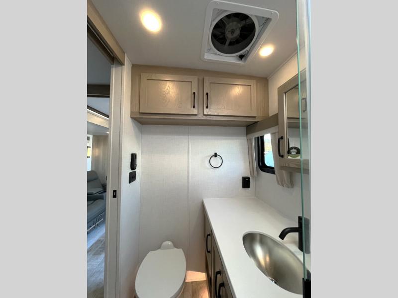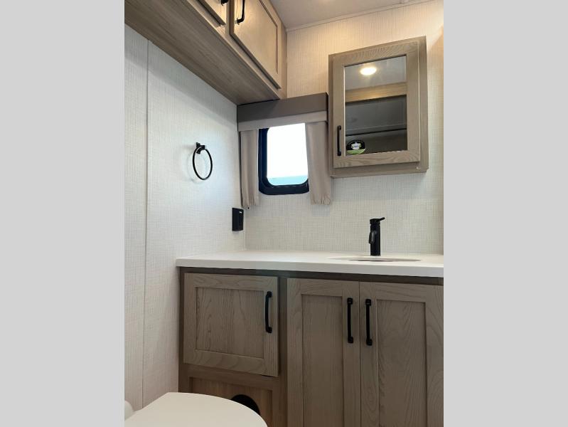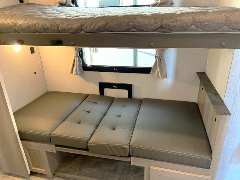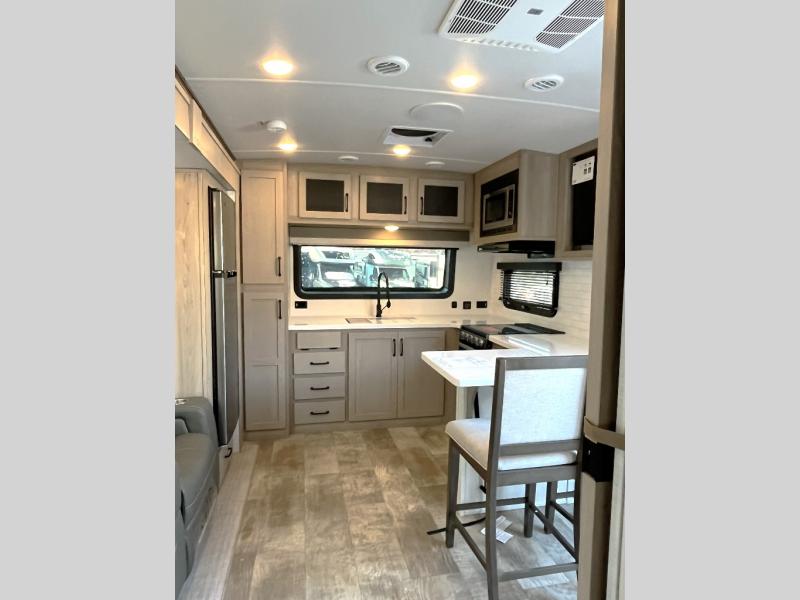 This travel trailer can be used as a couple's coach or a family getaway! The rear private bedroom has a queen bed slide to lay your head on at night with an optional TV to watch movies in bed, plus a wardrobe/linen closet slide to store your clothes. Within that same slide you will find a 72" x 30" flip-up bunk bed above a 32" dinette which can be transformed into a second bed. Everyone can freshen up in the full bathroom which includes a shower with a seat, toilet and vanity with sink. The front kitchen offers a u-shaped counter and full amenities to whip up meals and snacks while you camp. You could even use the outdoor griddle to enjoy breakfast outside under the 21' awning at sunrise!