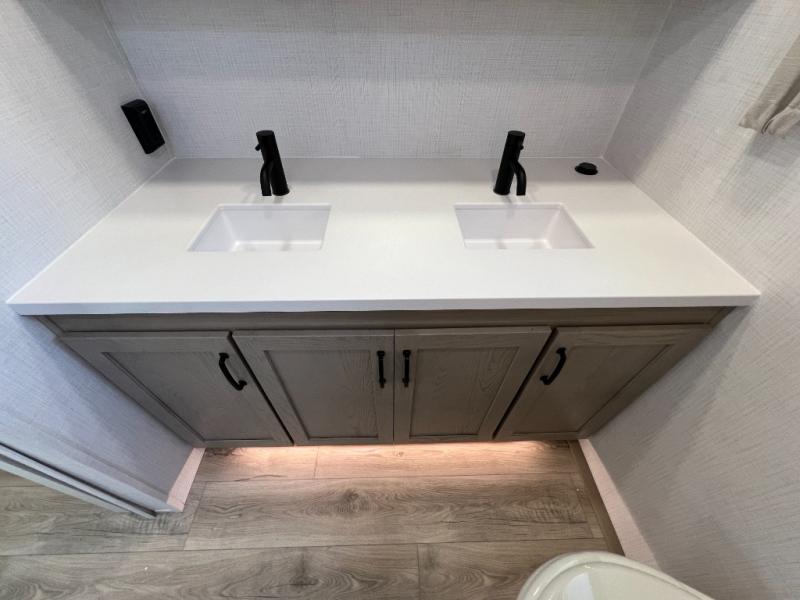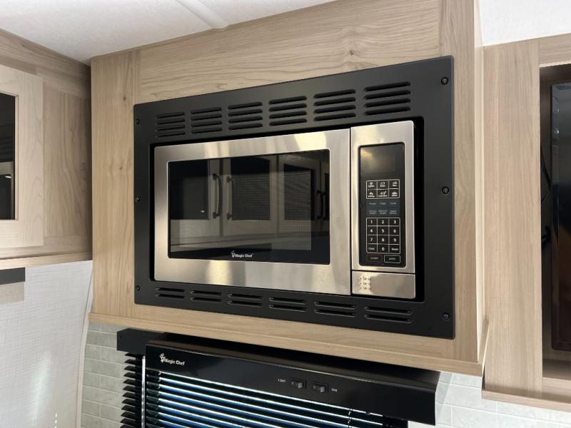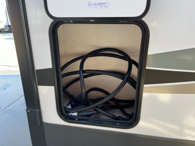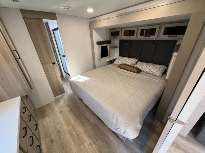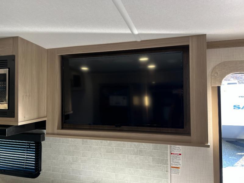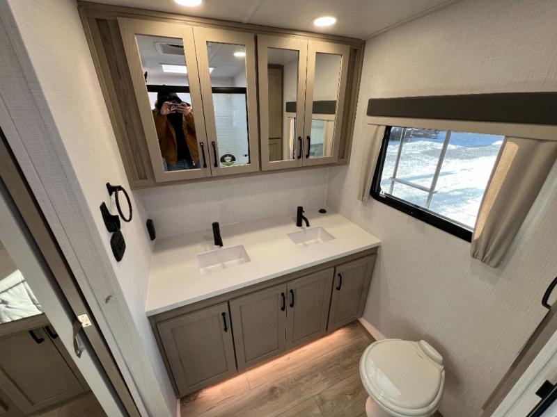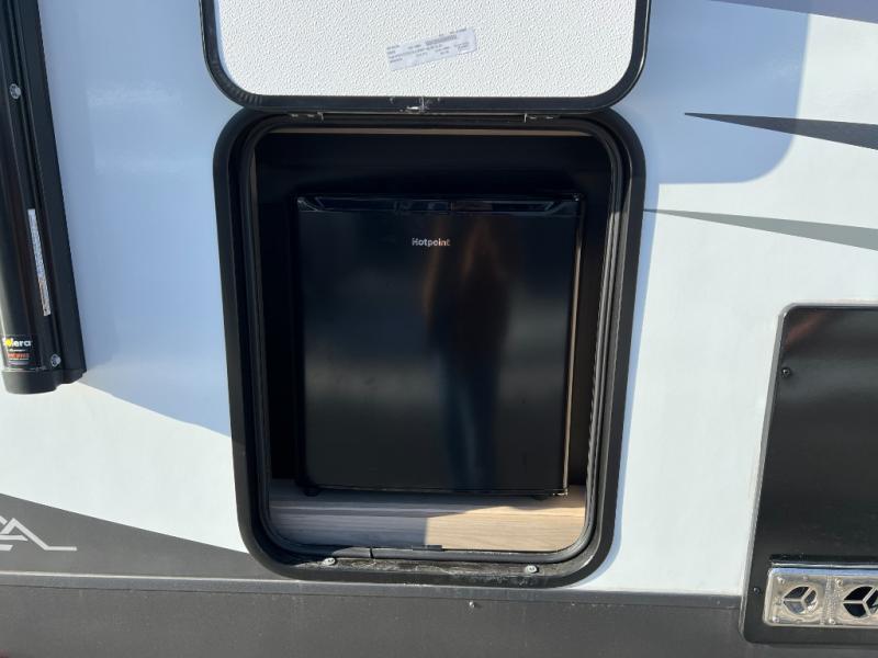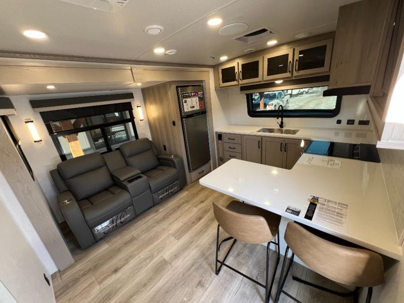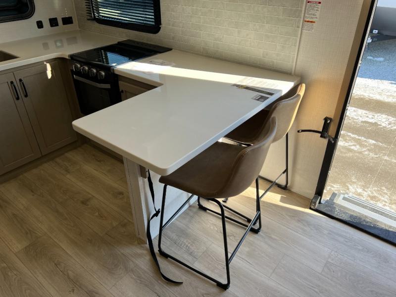 You will love how open this travel trailer will feel with the large front window that you can look out from the two-person bar top seating! The front kitchen has plenty of countertop space for you to prepare your best meals. Your nights will be spent in true relaxation with a 67" theater seating and king bed slide in the bedroom for a great night's rest. The full rear bathroom has a shower with a seat to take a nice, hot shower before bed, and a dual-sink vanity for two to get ready at once in the mornings!