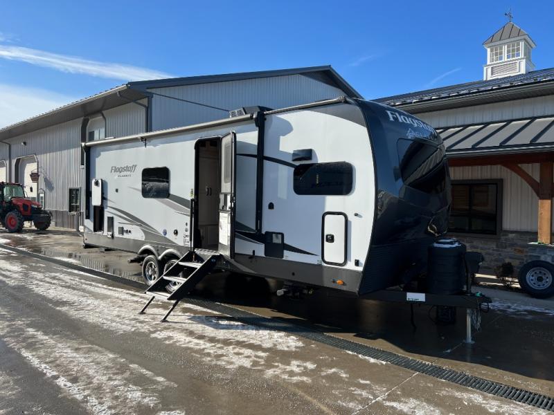 Each one of these Forest River Flagstaff Classic fifth wheels or travel trailers will be your home on wheels! Their quality craftsmanship and attention to detail shines through the surface-coated steel I-beam frame on fifth wheels, the enclosed underbelly, the radius roof with vaulted interior ceilings, and six-sided fully aluminum-framed floor, walls, and roof. Towing your unit will be easy with the torsion axle, Rubber-Ryde suspension, and nitrogen-filled Goodyear Endurance tires. You will even reduce your use of water with the Showermiser water saving system in the bathroom. A few other convenient features you will enjoy include a control panel with WeRV app control, a designer headboard and bedding, and an outside shower with hot and cold water. Come choose your favorite one today!